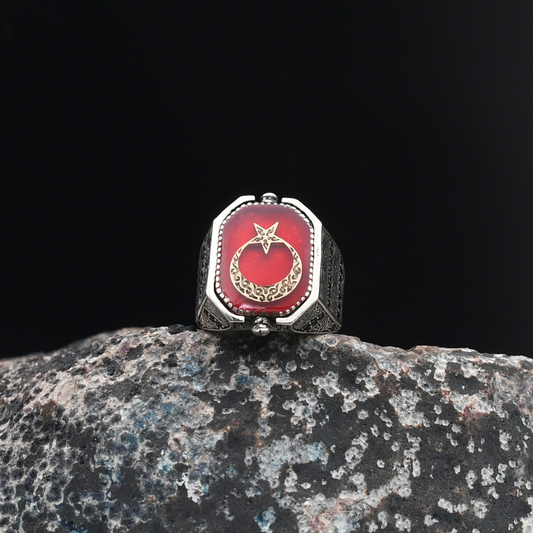 Ay Yıldızlı Kırmızı Zirkon Taşlı Gümüş Yüzük