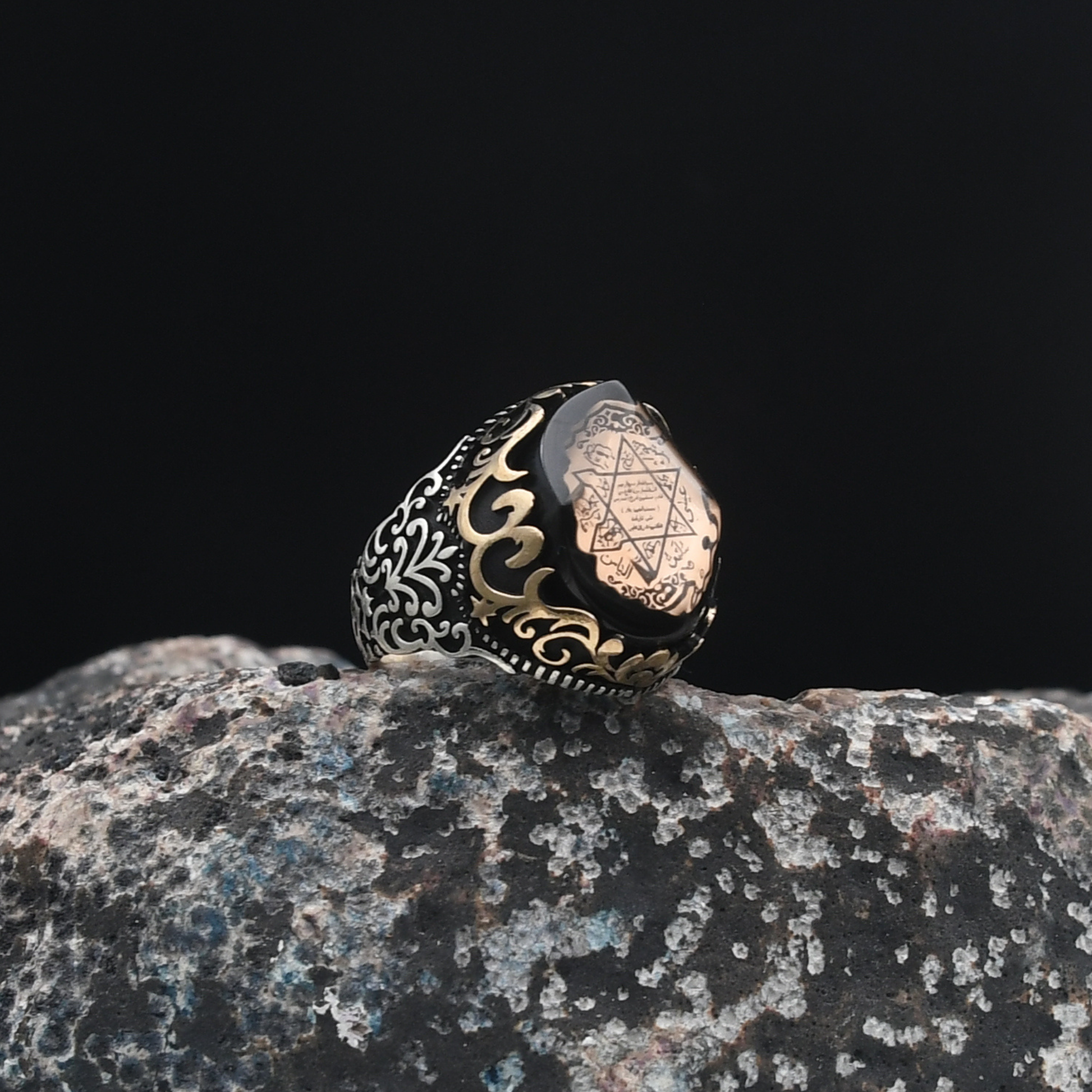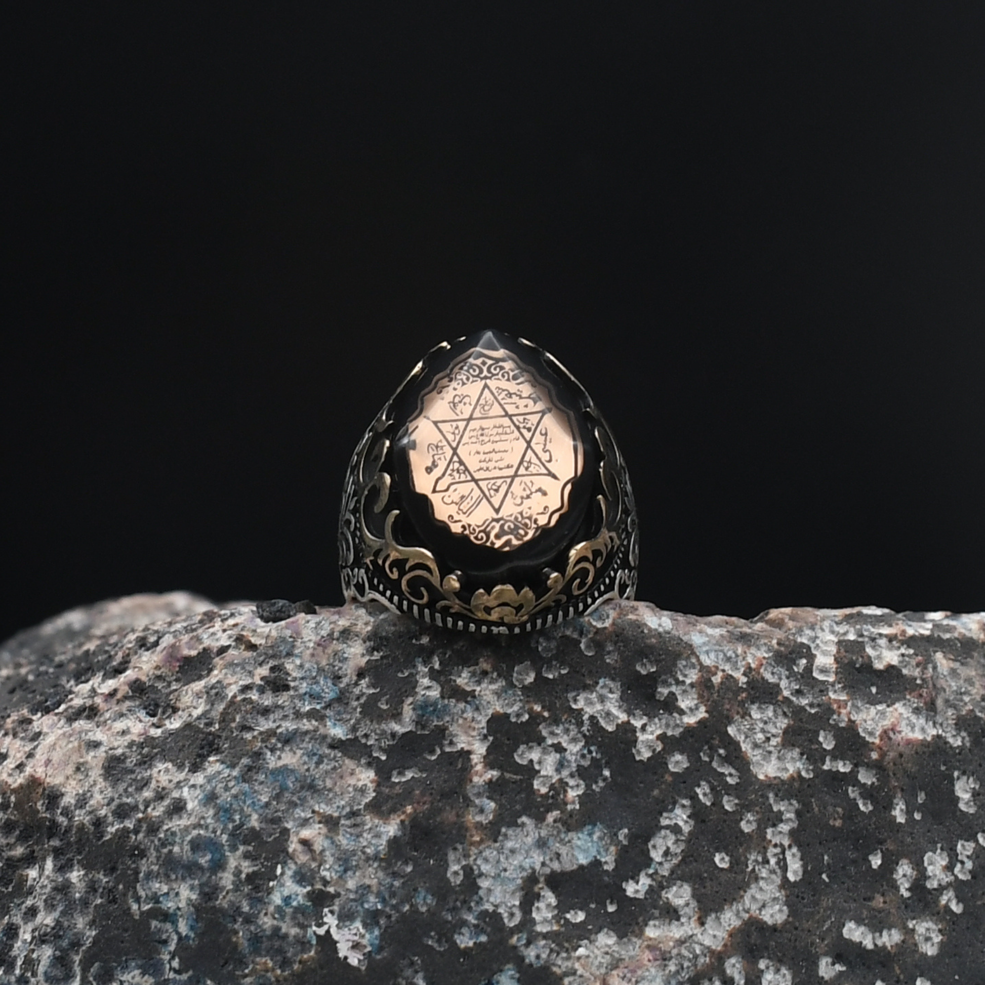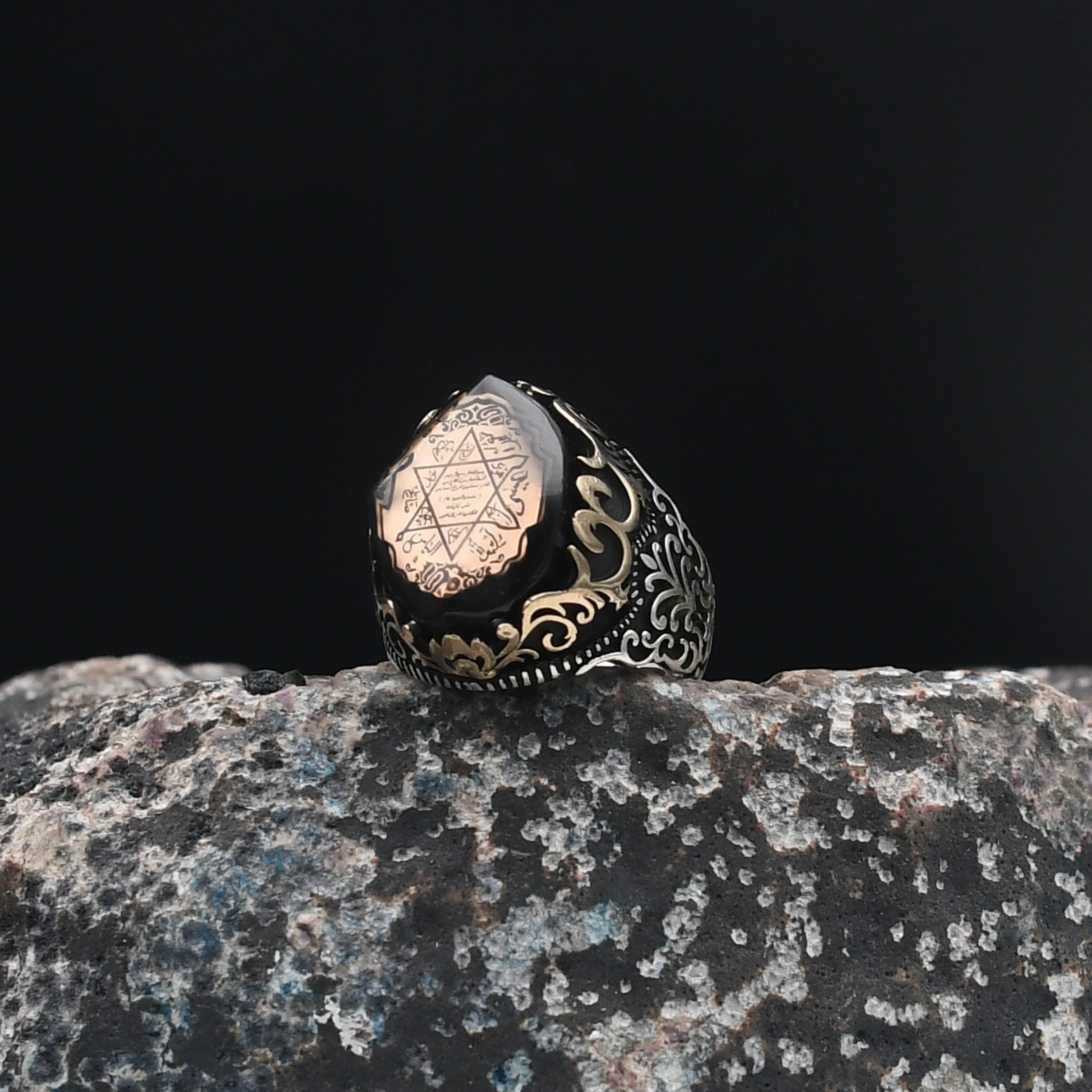 Tarihin mistik simgesi Süleyman Mührü 🔯, bu yüzüğe derin bir anlam kazandırırken; merkezdeki sıkma kehribar taşı 🧿 zarafetiyle dikkatleri üzerine çekiyor. Süleyman Mührü, bilgelik, güç ve korunma sembolü olarak bilinir. Kehribar taşının doğal enerjisi ile birleşen bu tasarım, hem ruhunuza hem de stilinize değer katıyor. Geleneksel ve modern dokunuşların uyumlu bir birleşimi olan bu yüzük, özel bir şıklık sunar.