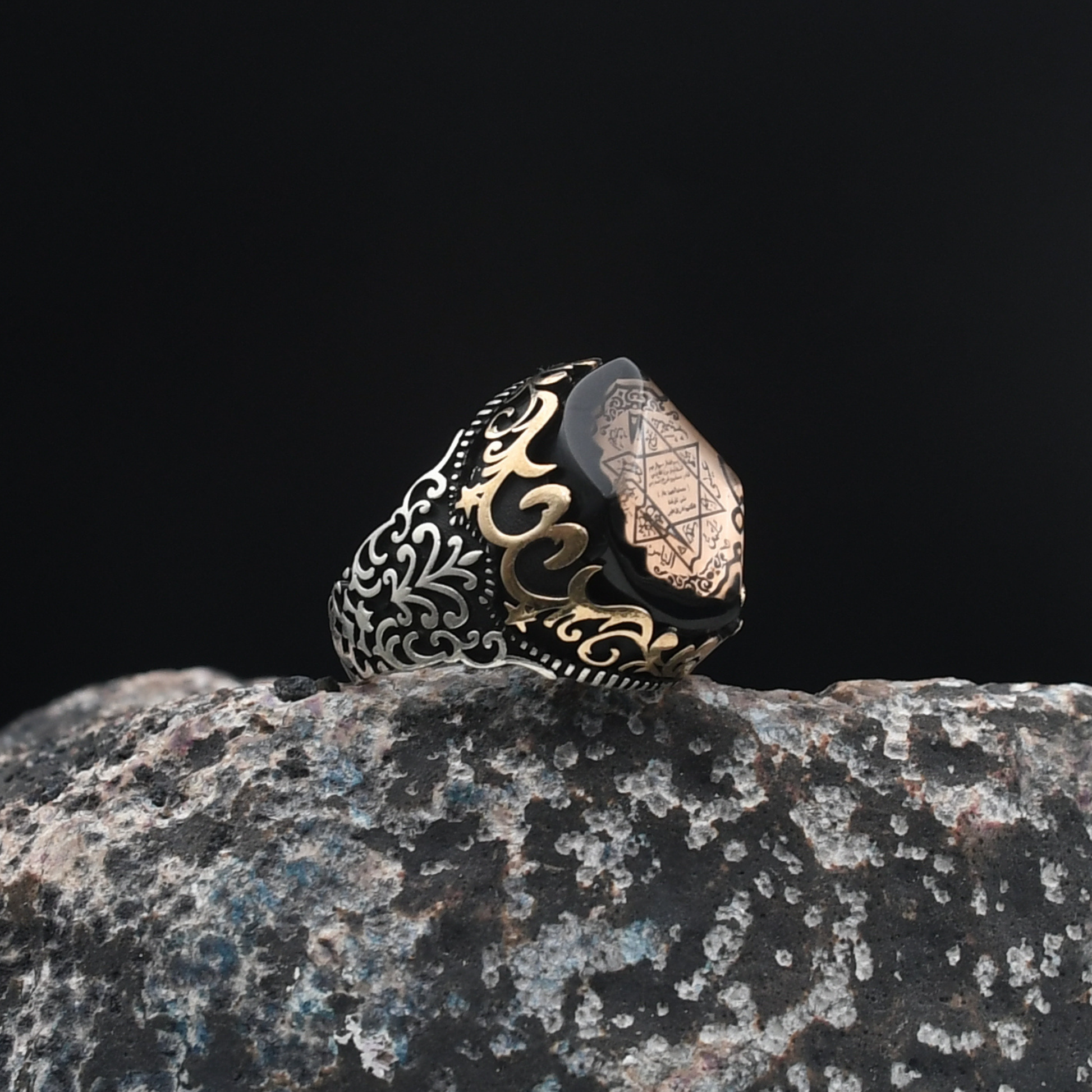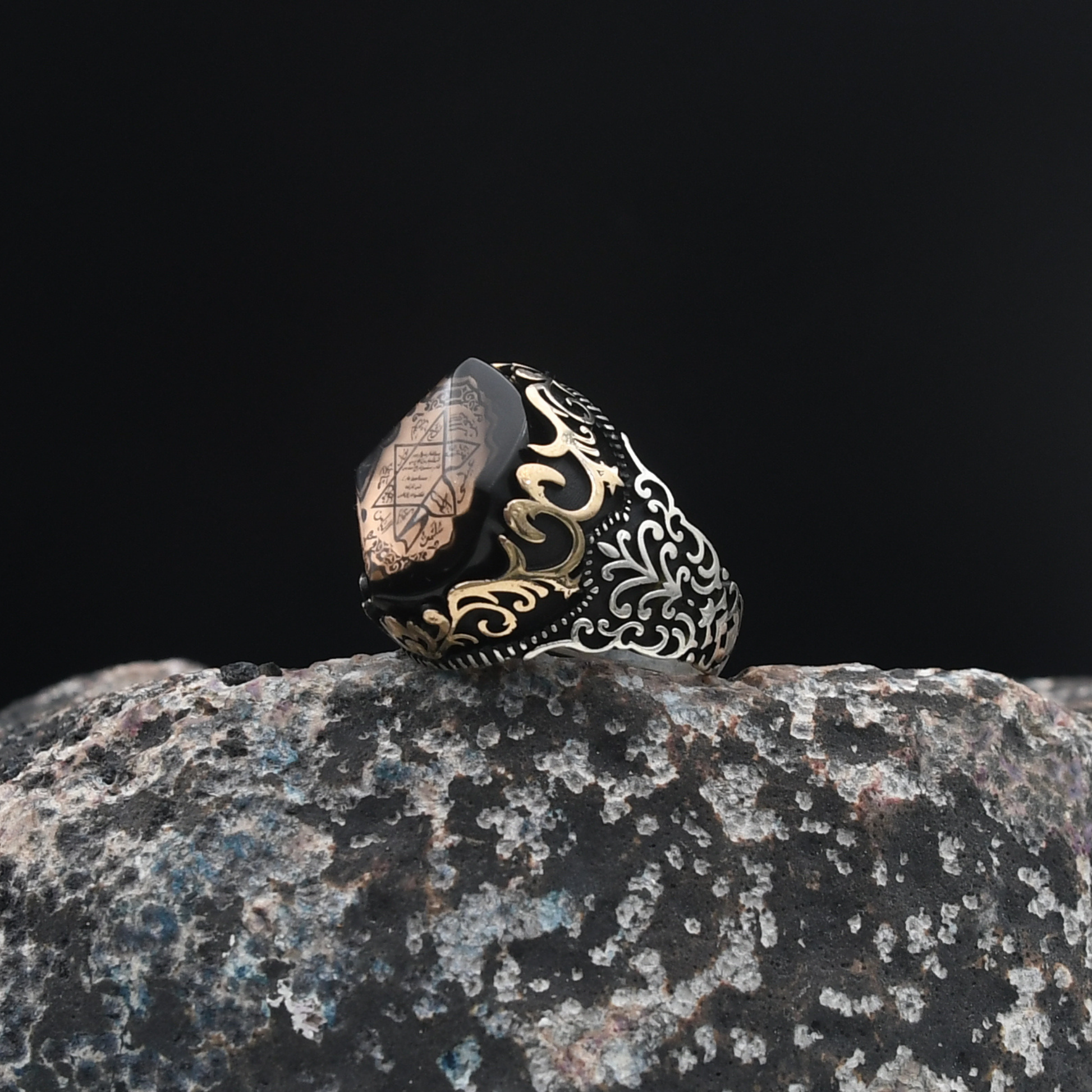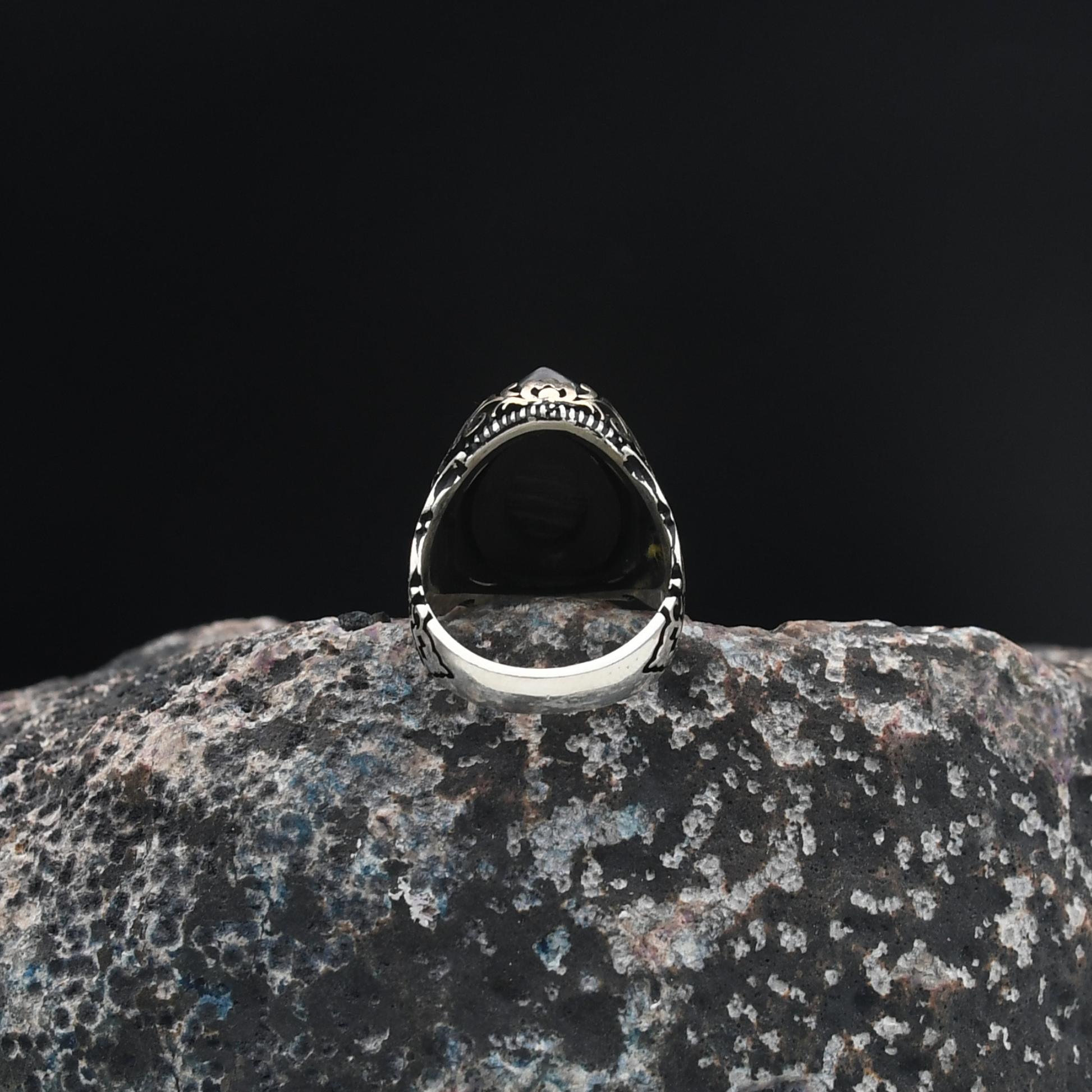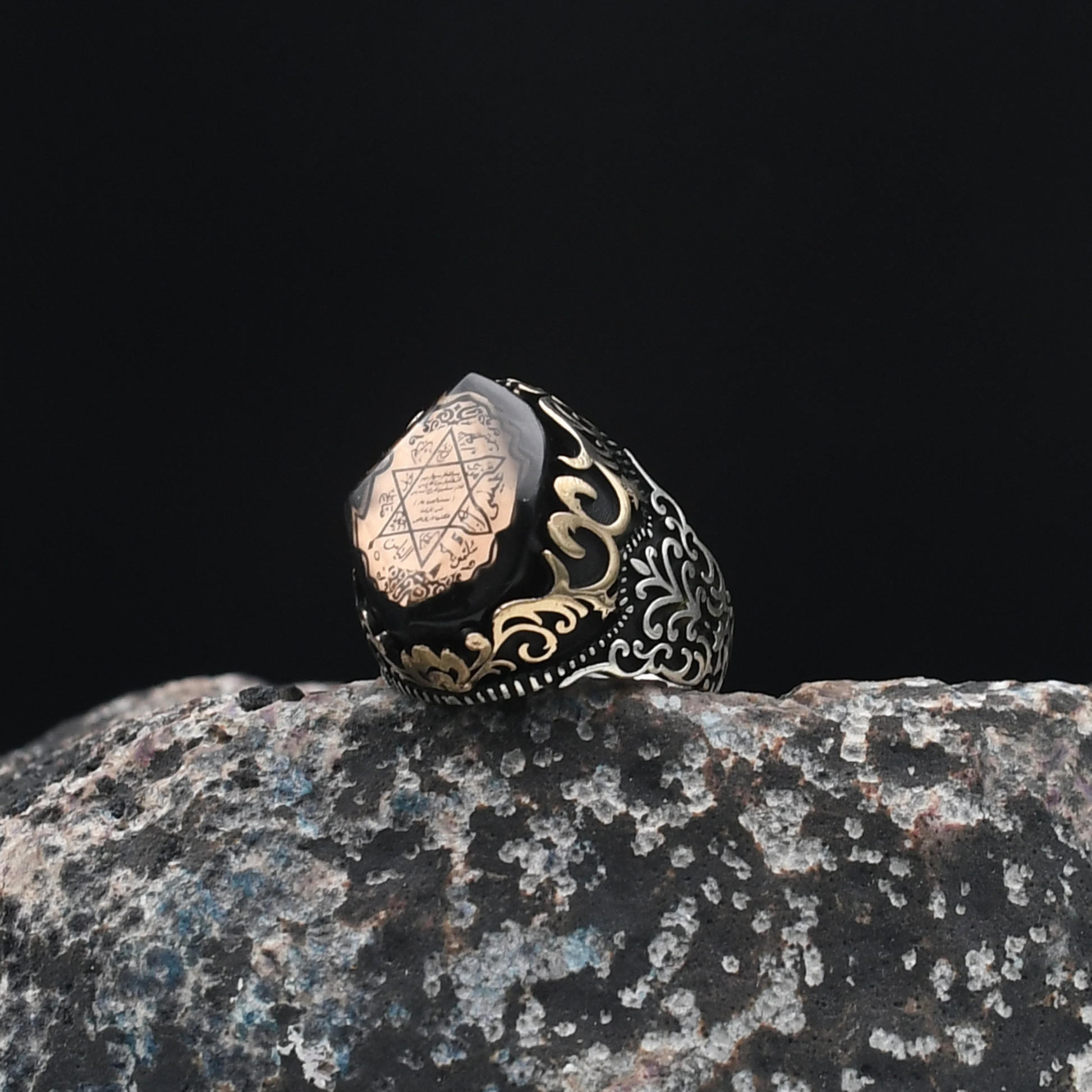 Tarihin mistik simgesi Süleyman Mührü 🔯, bu yüzüğe derin bir anlam kazandırırken; merkezdeki sıkma kehribar taşı 🧿 zarafetiyle dikkatleri üzerine çekiyor. Süleyman Mührü, bilgelik, güç ve korunma sembolü olarak bilinir. Kehribar taşının doğal enerjisi ile birleşen bu tasarım, hem ruhunuza hem de stilinize değer katıyor. Geleneksel ve modern dokunuşların uyumlu bir birleşimi olan bu yüzük, özel bir şıklık sunar.