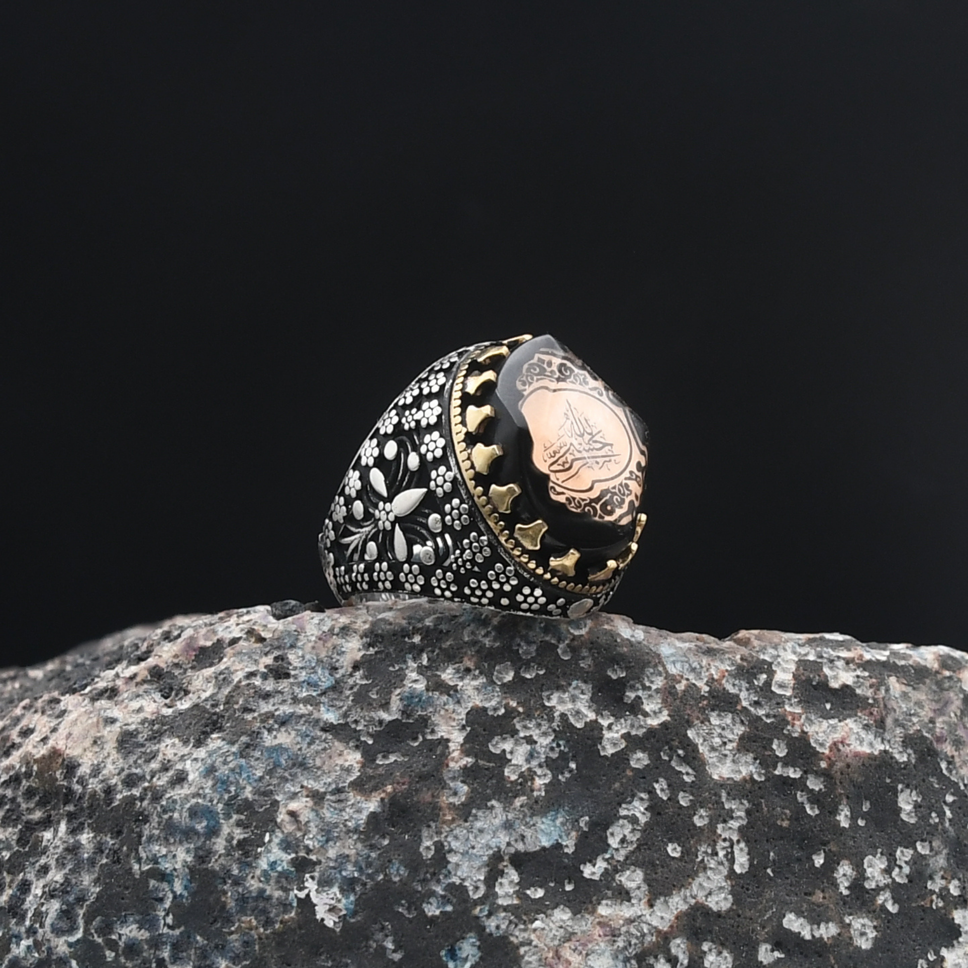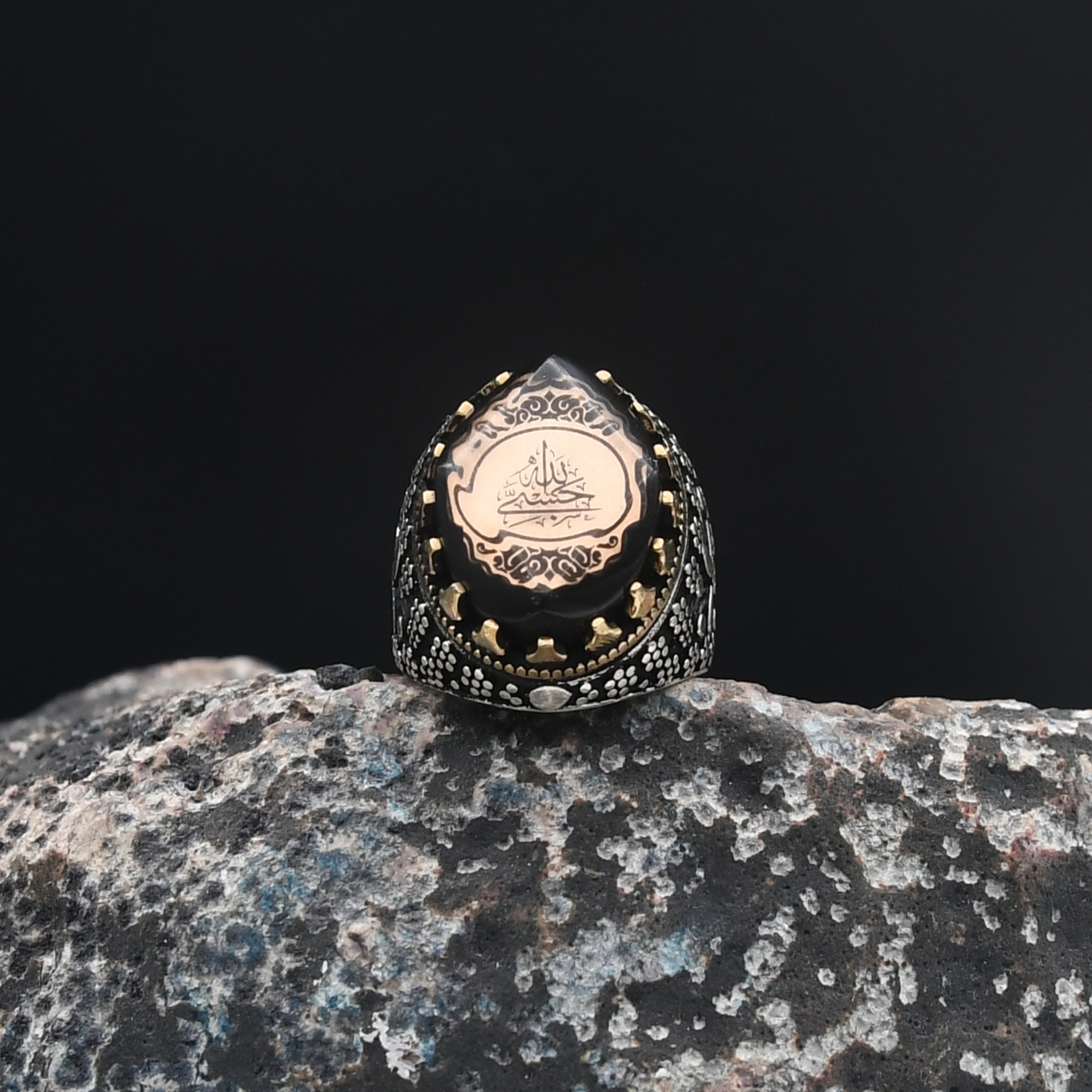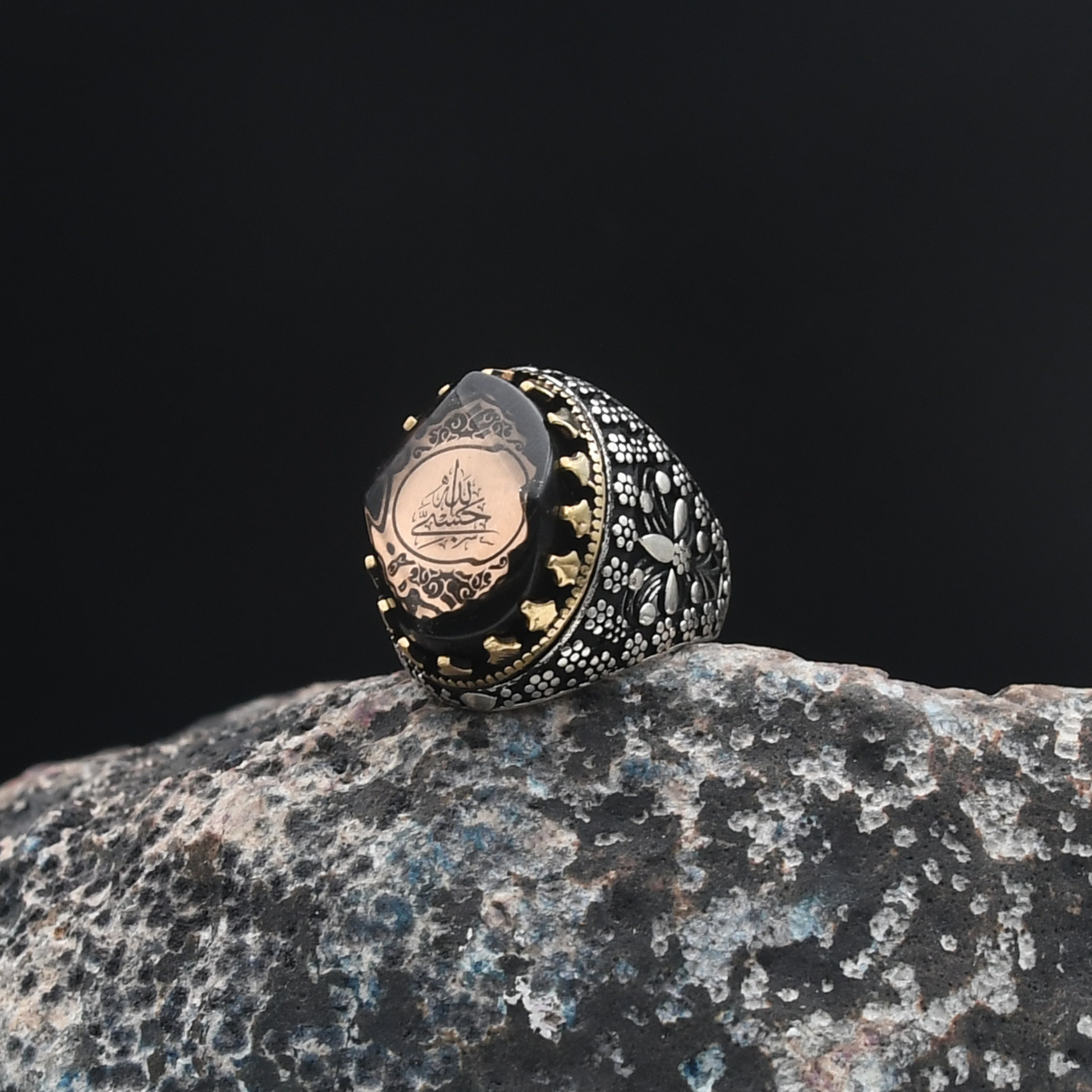 Maneviyat ve zarafetin mükemmel uyumu! "Hasbiallah" yazısı, bu yüzüğe derin bir anlam kazandırırken, merkezdeki sıkma kehribar taşı 🧿 benzersiz bir zarafet sunuyor. Kehribarın doğal parlaklığı ve enerjisi, yüzüğün güçlü tasarımını tamamlıyor. Şıklığı ve anlamı bir araya getiren bu tasarım, modern ve geleneksel dokunuşları harmanlayarak özel bir aksesuar haline geliyor.