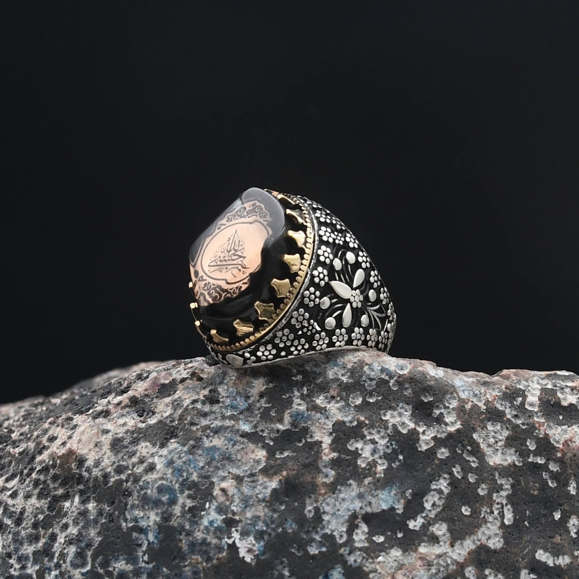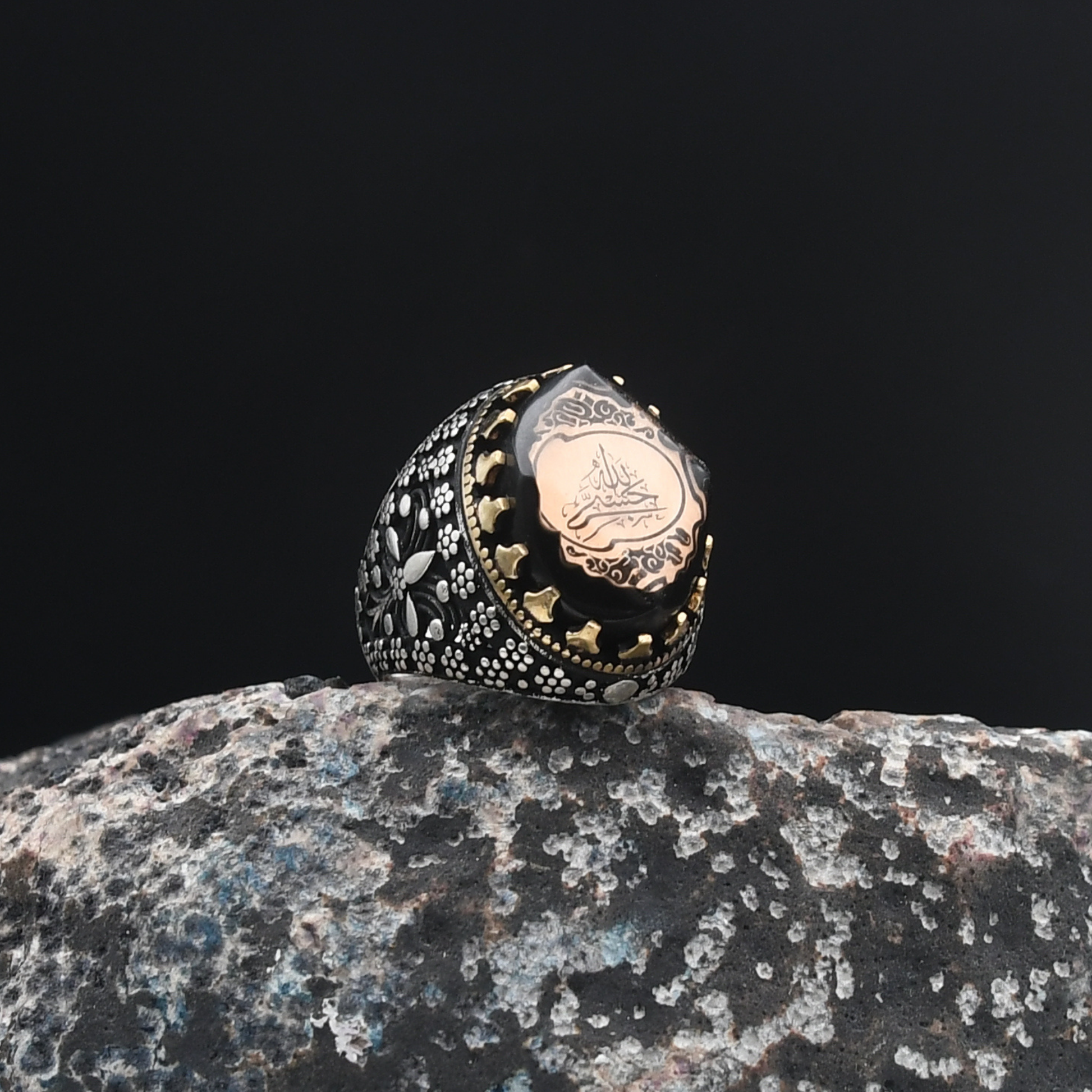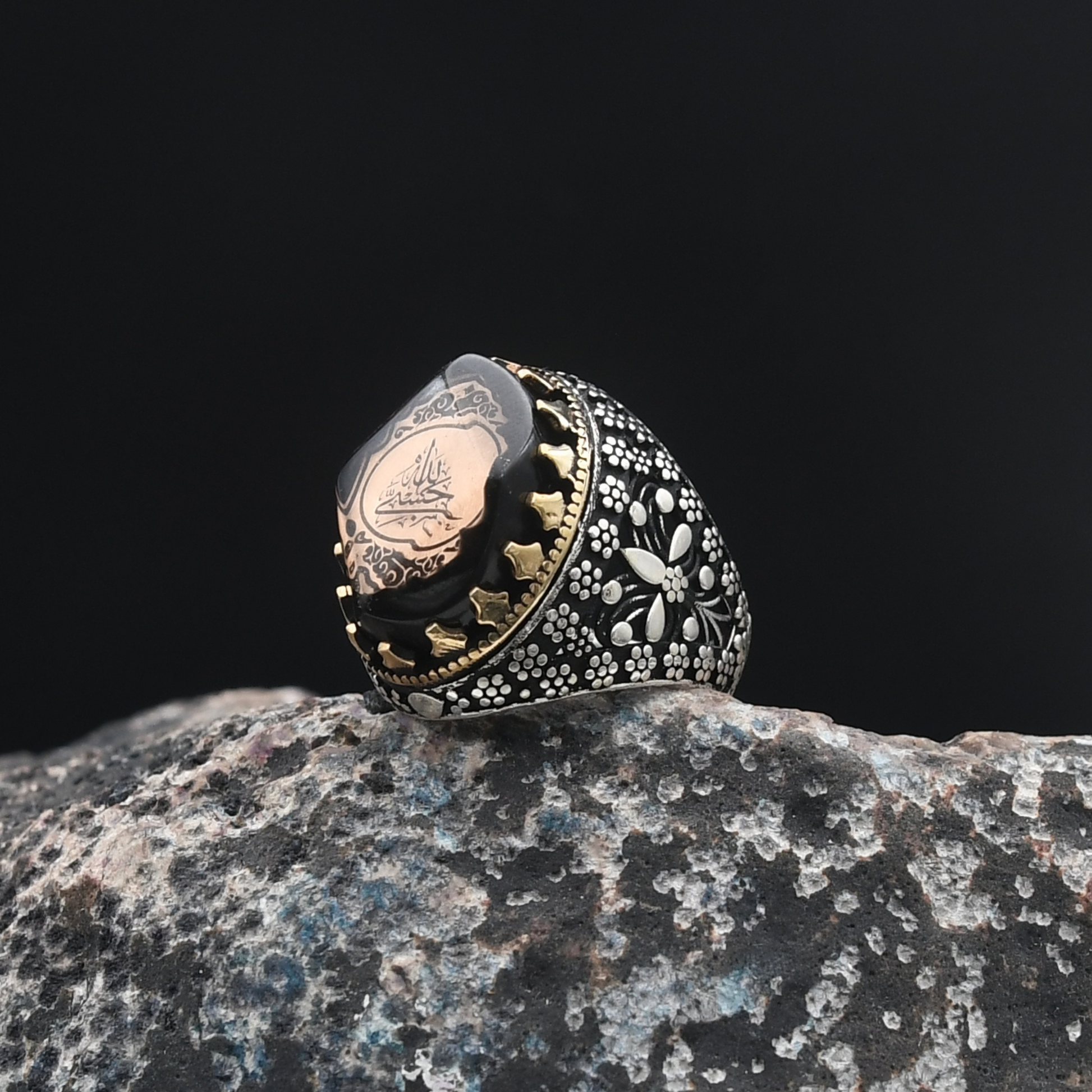 Maneviyat ve zarafetin mükemmel uyumu! "Hasbiallah" yazısı, bu yüzüğe derin bir anlam kazandırırken, merkezdeki sıkma kehribar taşı 🧿 benzersiz bir zarafet sunuyor. Kehribarın doğal parlaklığı ve enerjisi, yüzüğün güçlü tasarımını tamamlıyor. Şıklığı ve anlamı bir araya getiren bu tasarım, modern ve geleneksel dokunuşları harmanlayarak özel bir aksesuar haline geliyor.