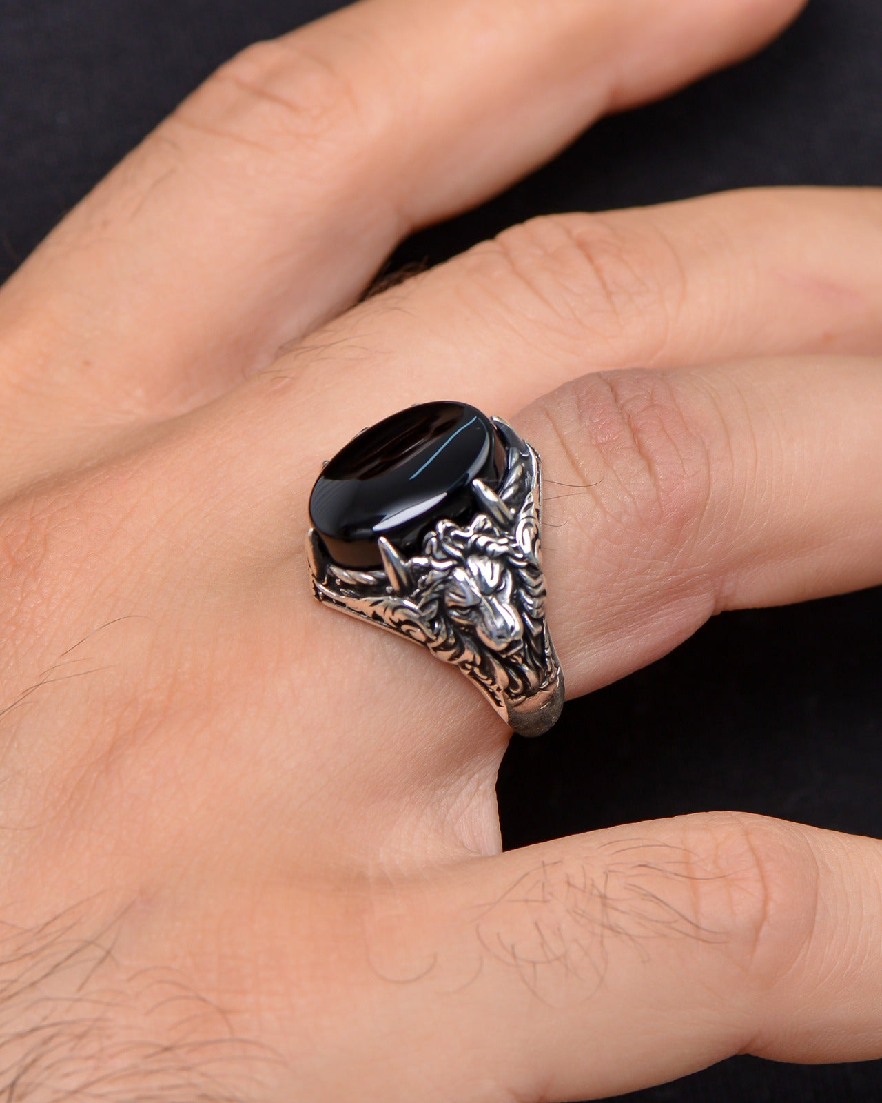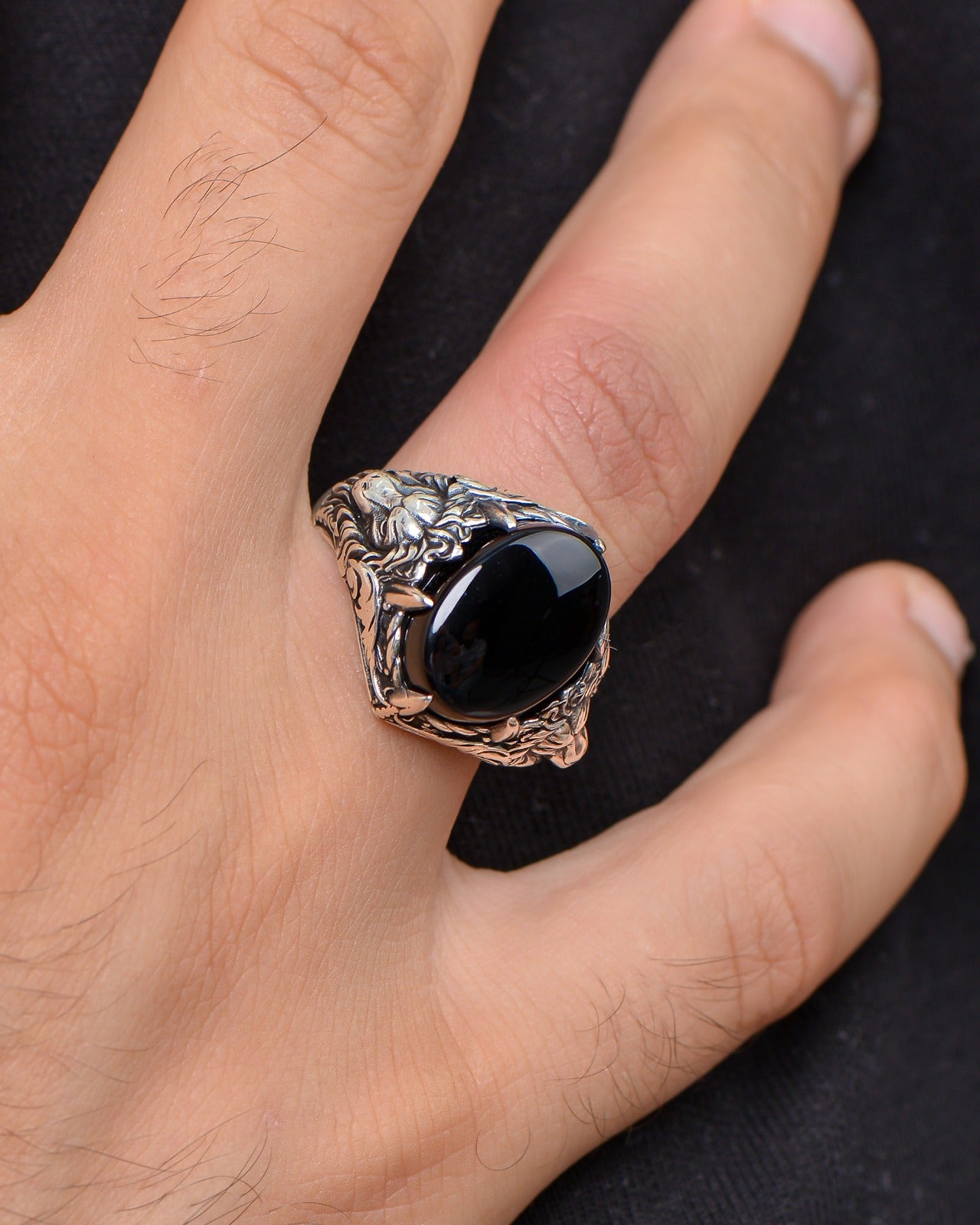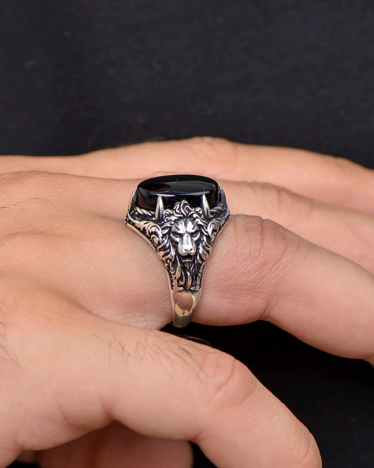 Güçlü ve cesur bir ifade için tasarlanmış bu erkek yüzük, aslan motifinin heybeti ve siyah oniks taşının şıklığı ile dikkat çekiyor.