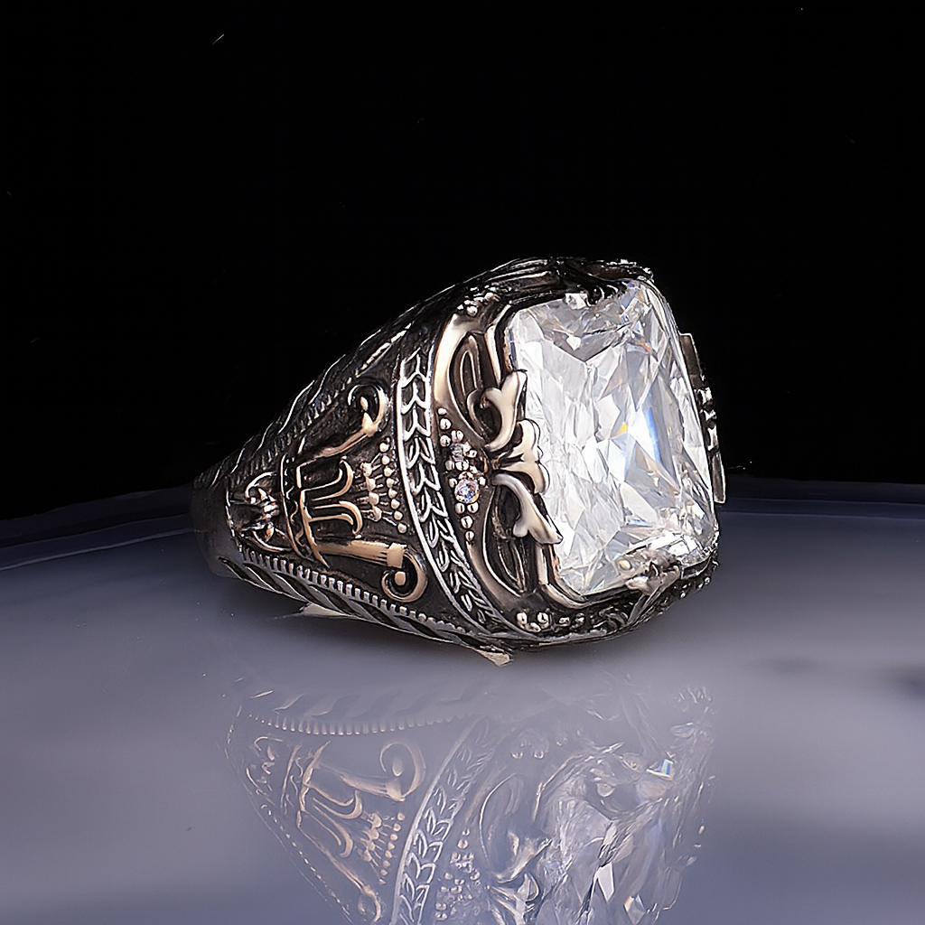 Saf ve zarif görünümüyle öne çıkan beyaz zirkon taşı, 925 ayar gümüşle birleşerek sade ama etkileyici bir yüzük tasarımı sunar. Yaklaşık 17 gram ağırlığındaki bu yüzük, tamamen el işçiliğiyle hazırlanmıştır.