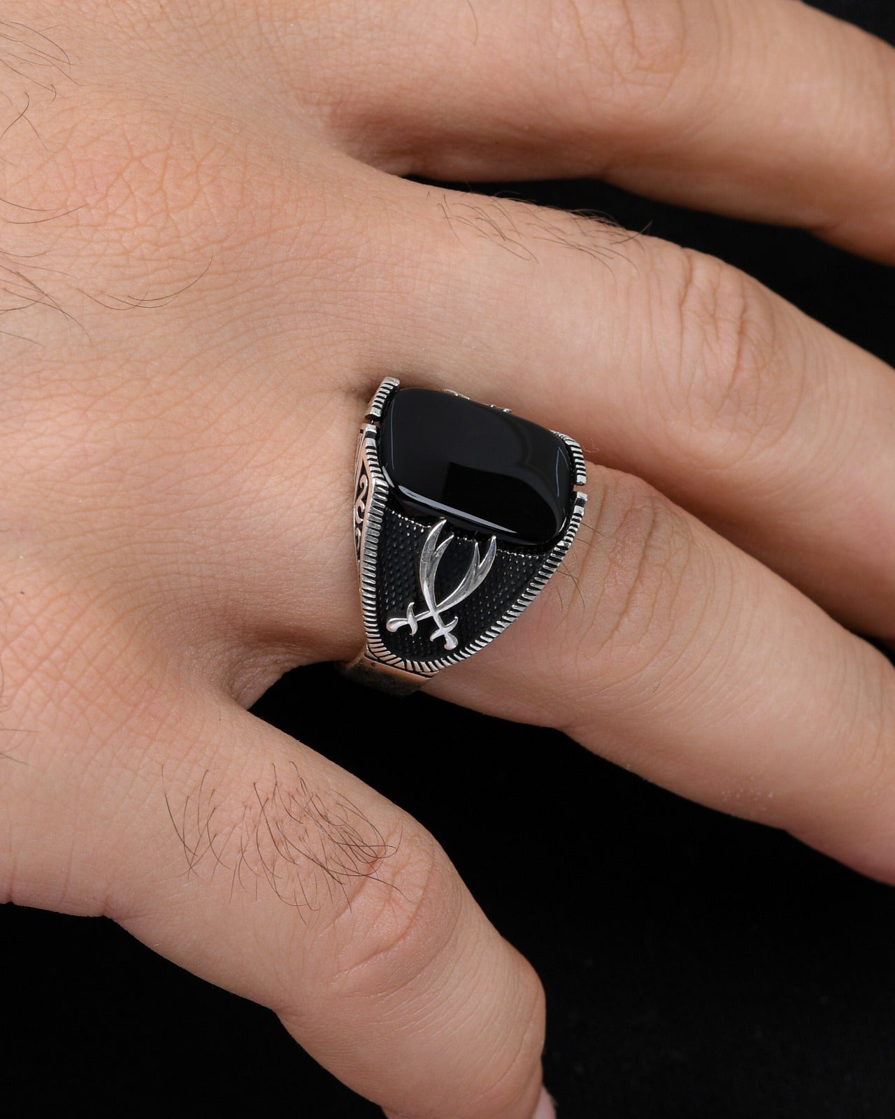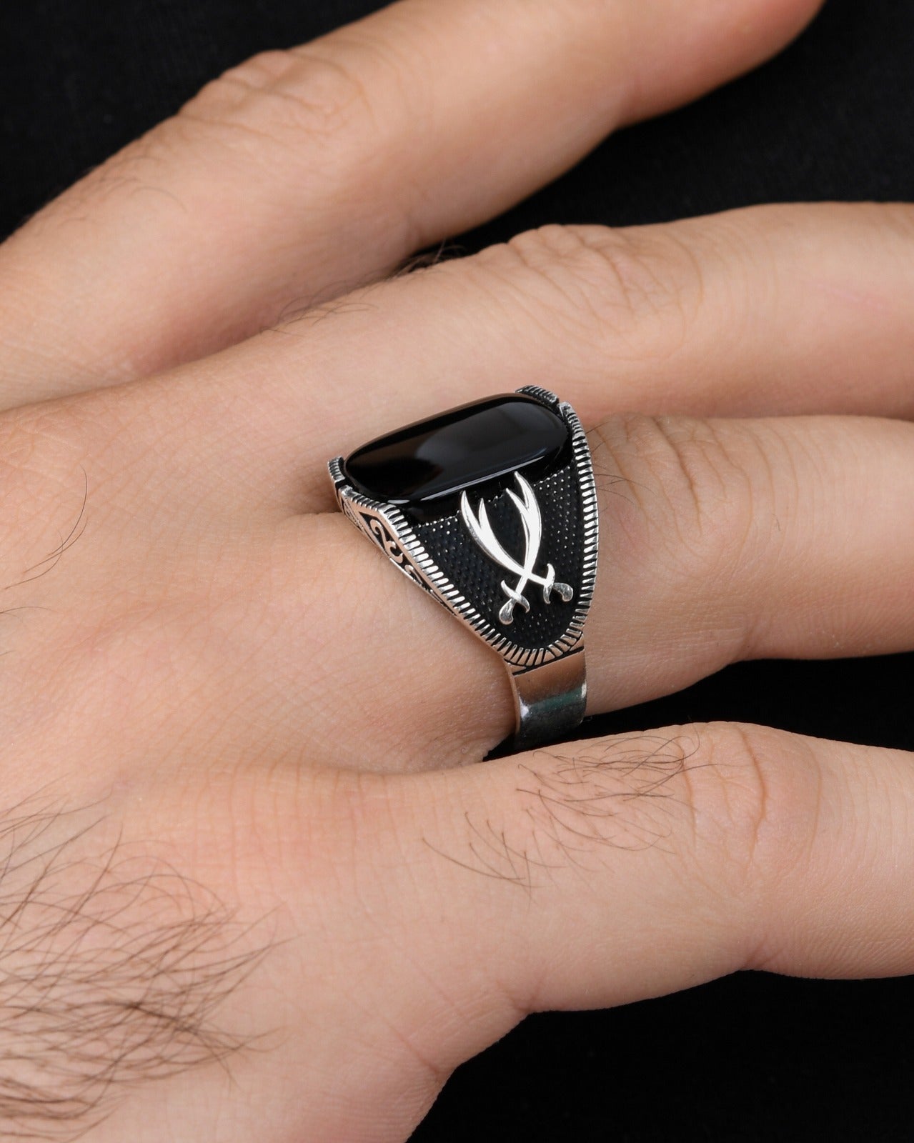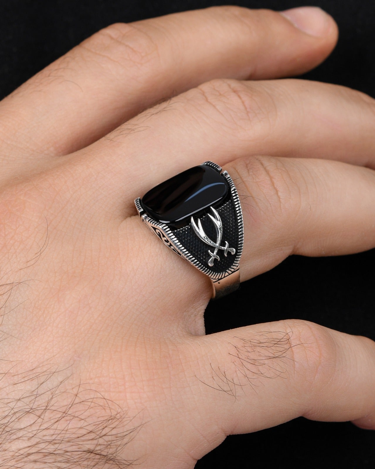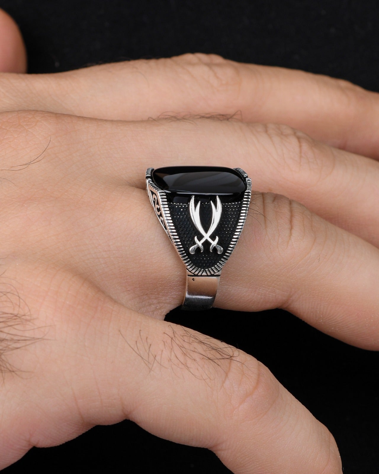 Güçlü ve karizmatik bir durma arayan erkekler için özel olarak tasarlanmış Çift Kılıç Motifli Erkek Yüzük, benzersiz tasarımı ile dikkat çekiyor.