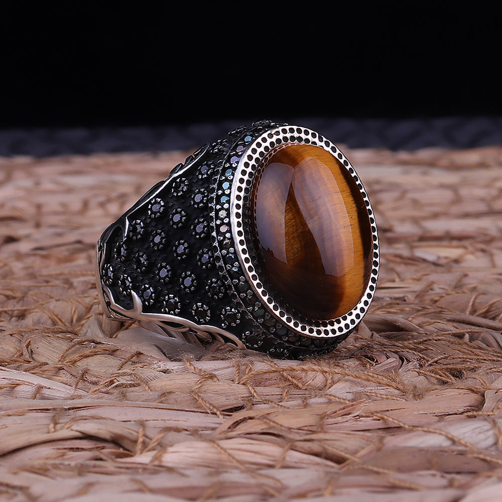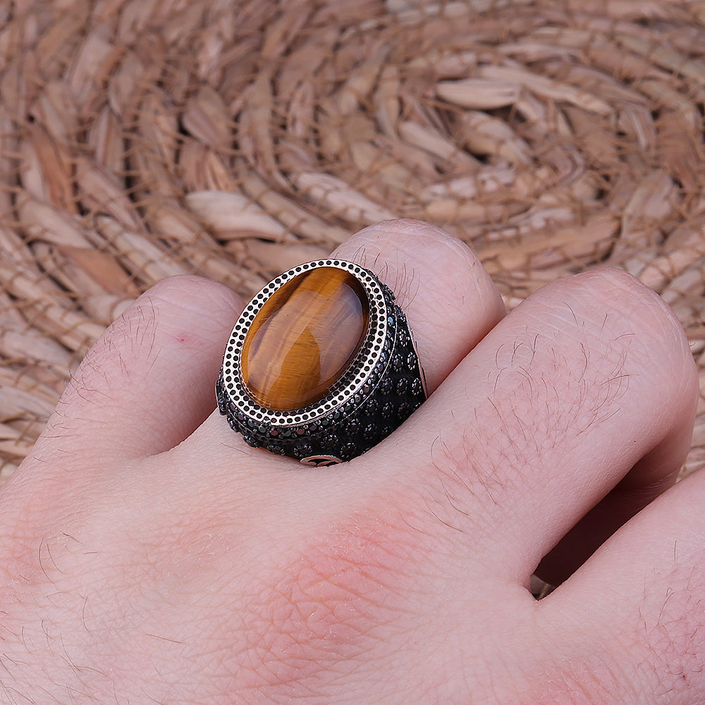 🐅💎 Kaplangözü Taşlı Erkek Gümüş Yüzük - 16 Gram 💎🐅