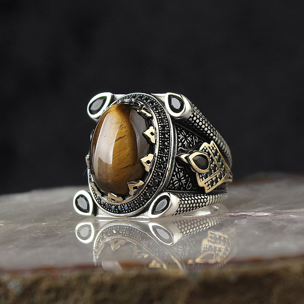 🌟 Kaplangözü Taşlı 925 Ayar Gümüş Erkek Yüzük - 20 Gram
