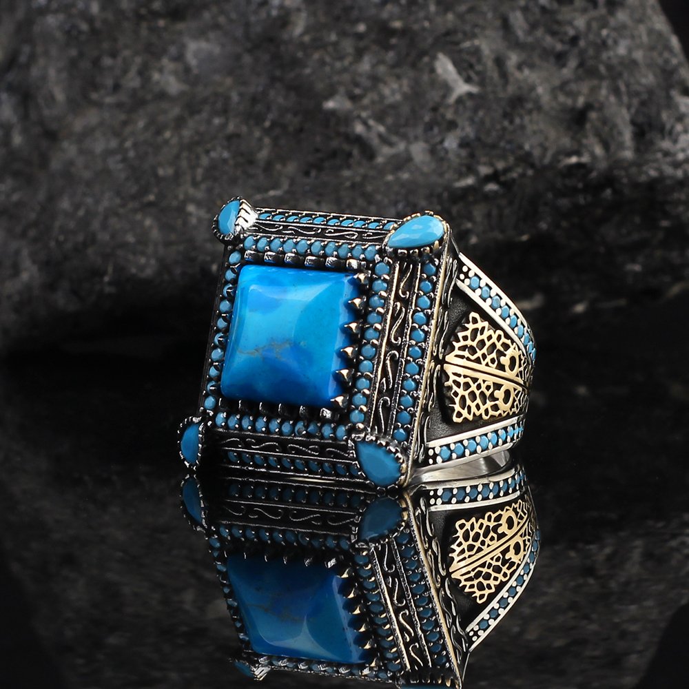Zirve Gümüş’ün şıklığını yansıtan bu kare firuze taşlı gümüş yüzük, 20 gram ağırlığıyla hem zarif hem de etkileyici bir parça.