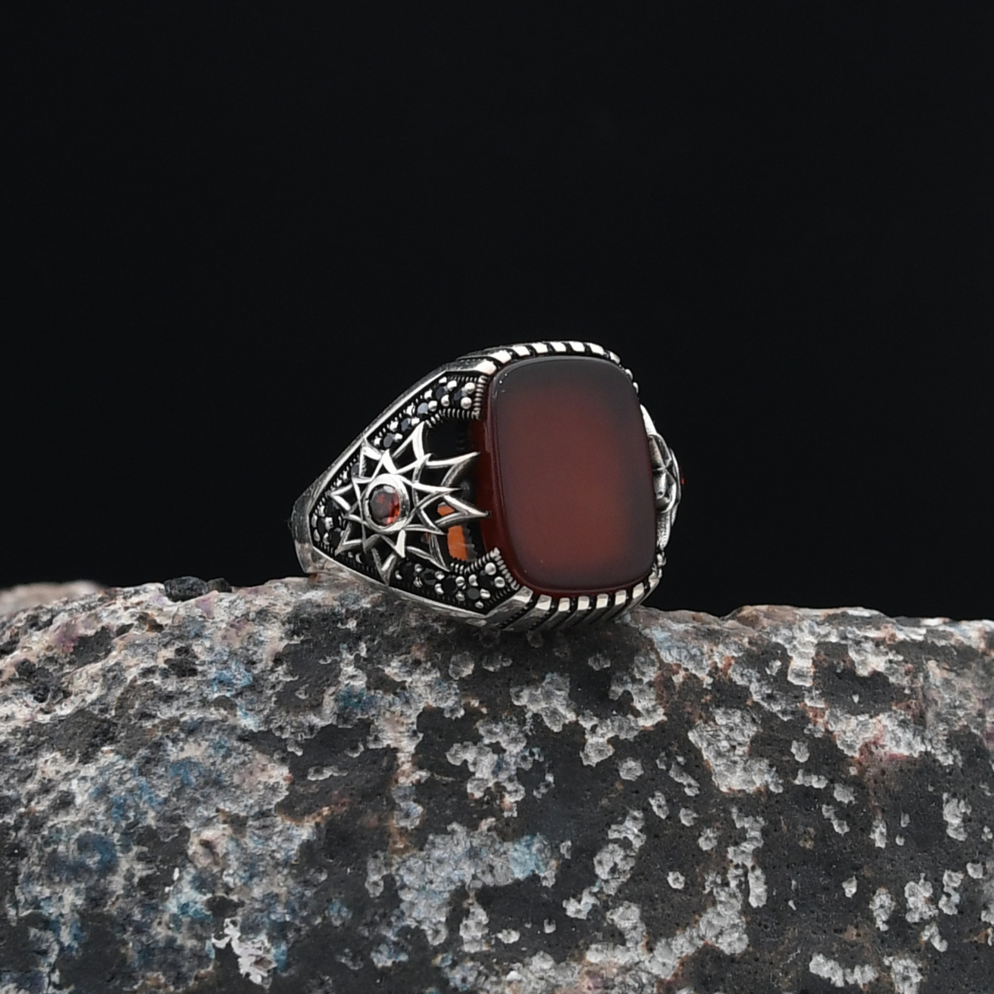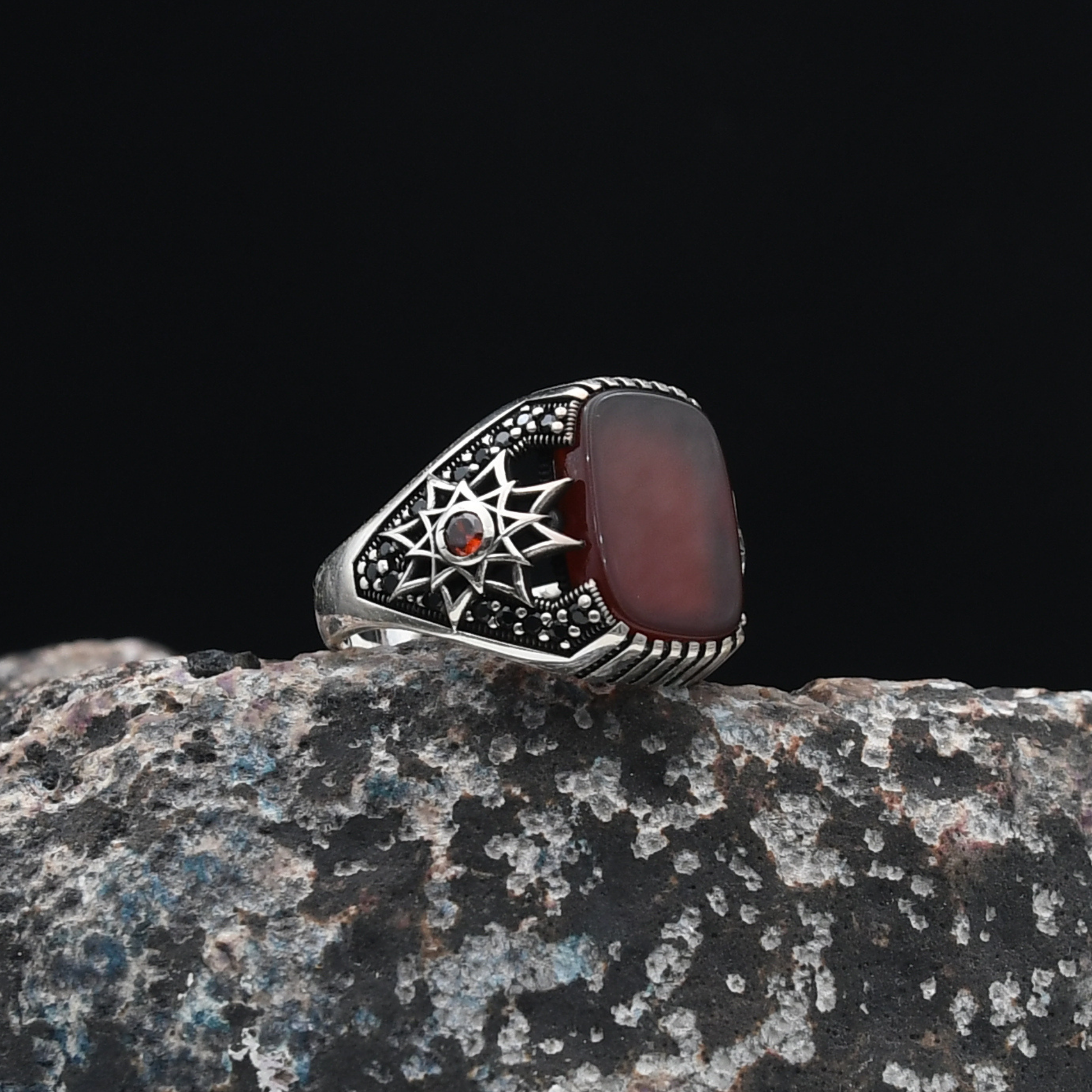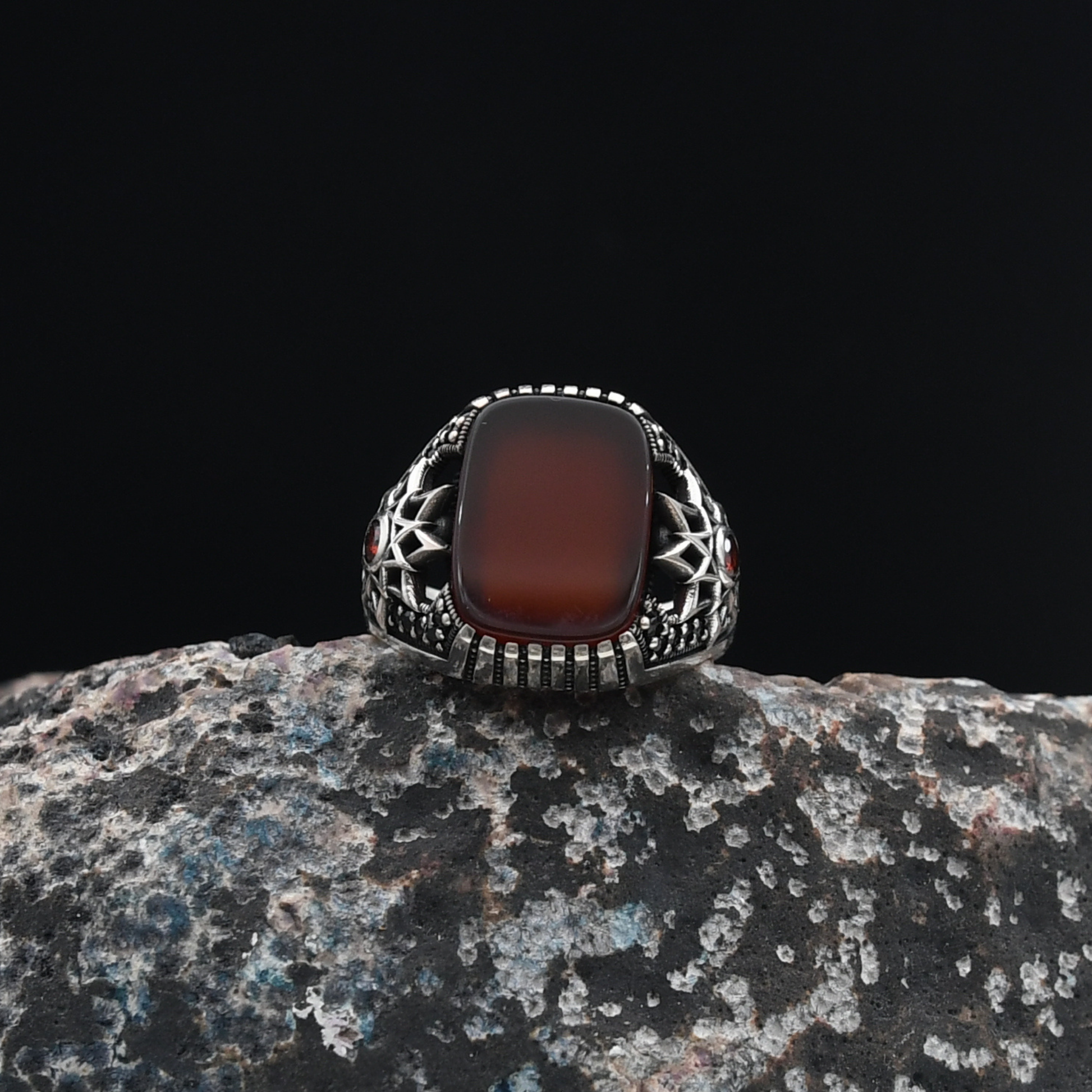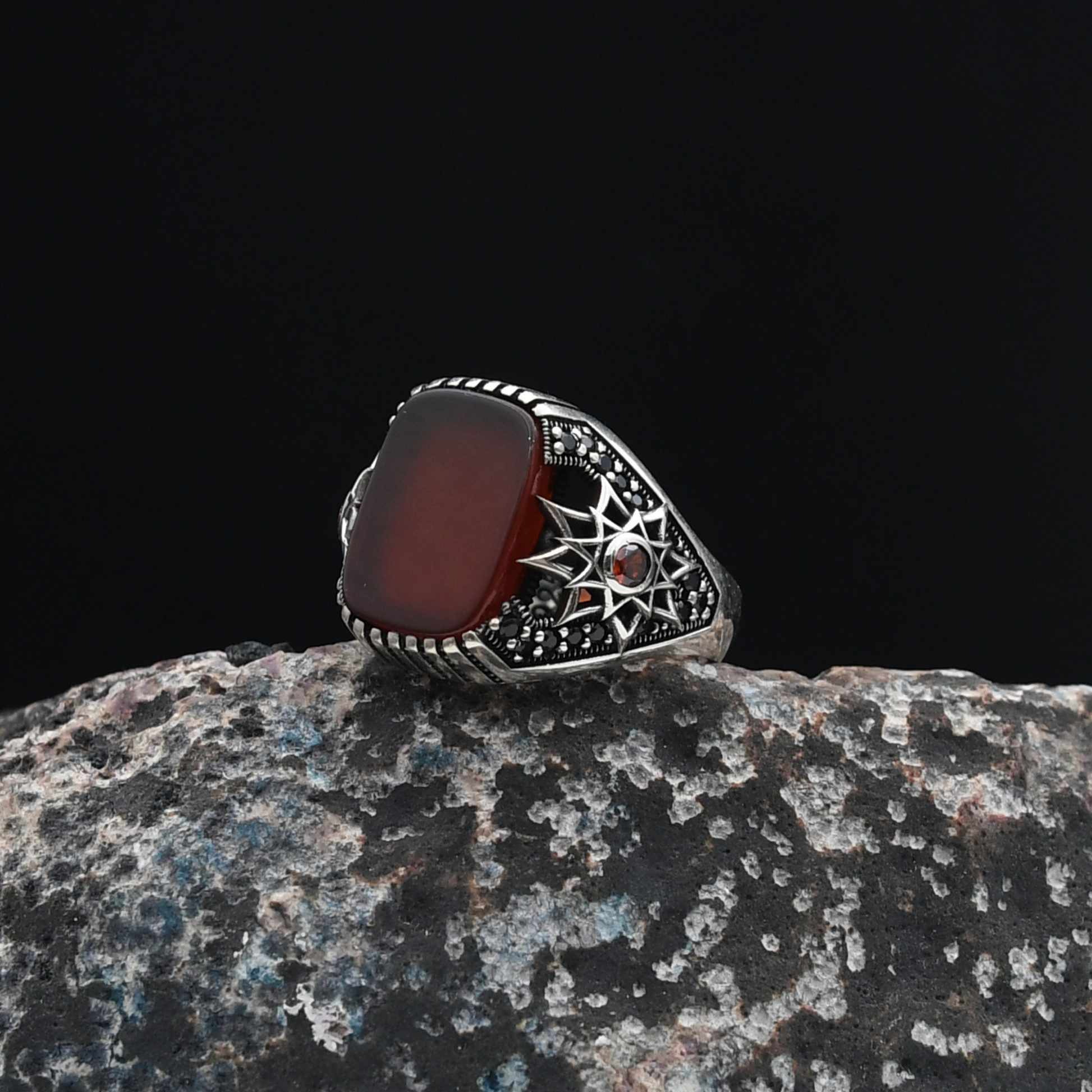 🔴 Kırmızı Akik Taşlı Gümüş Yüzük - 9 Gram 🔴