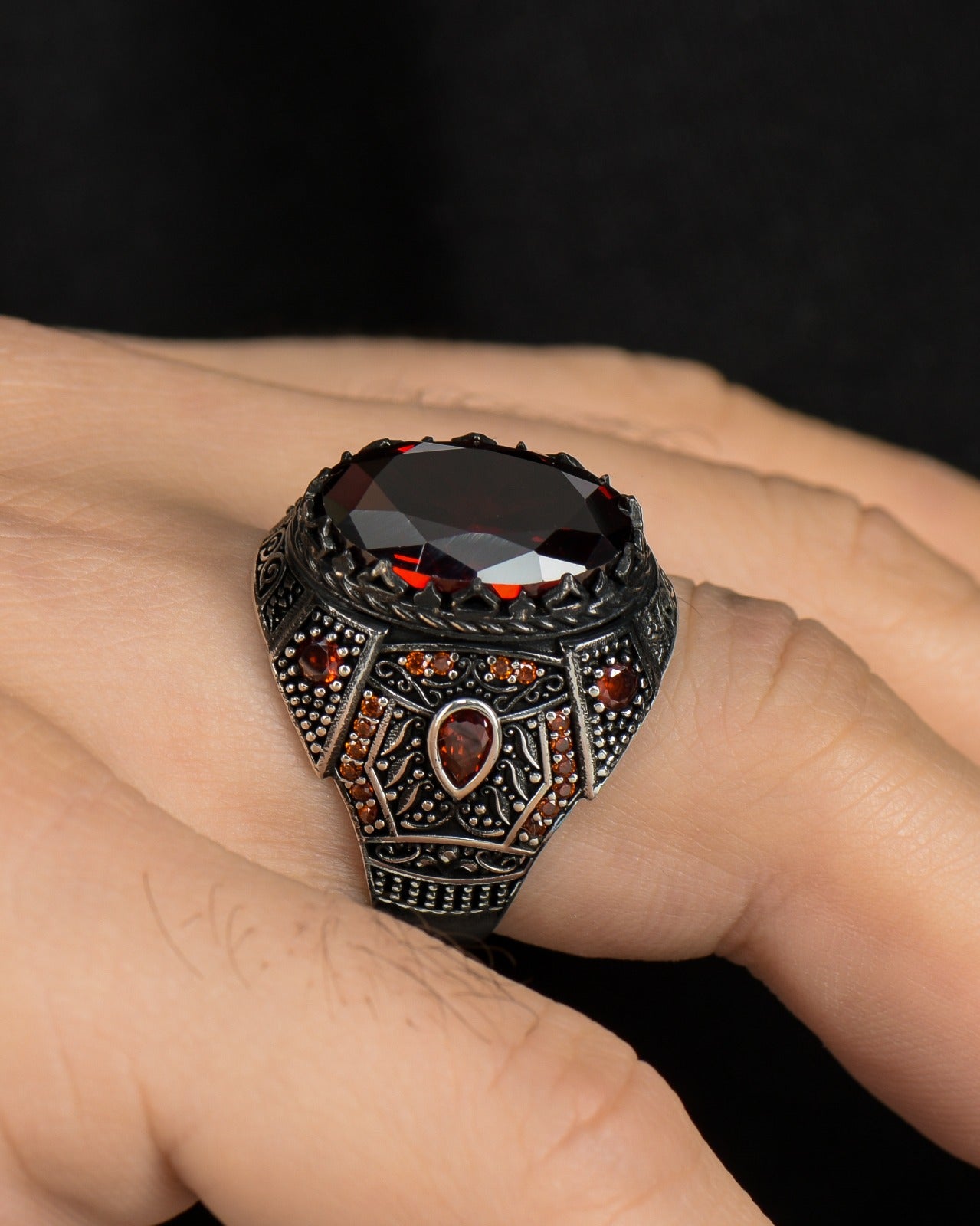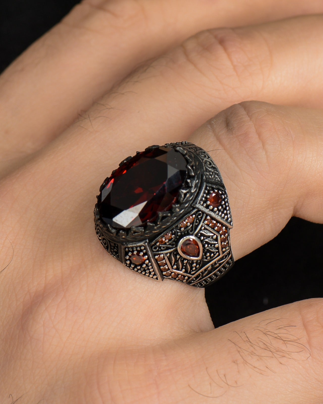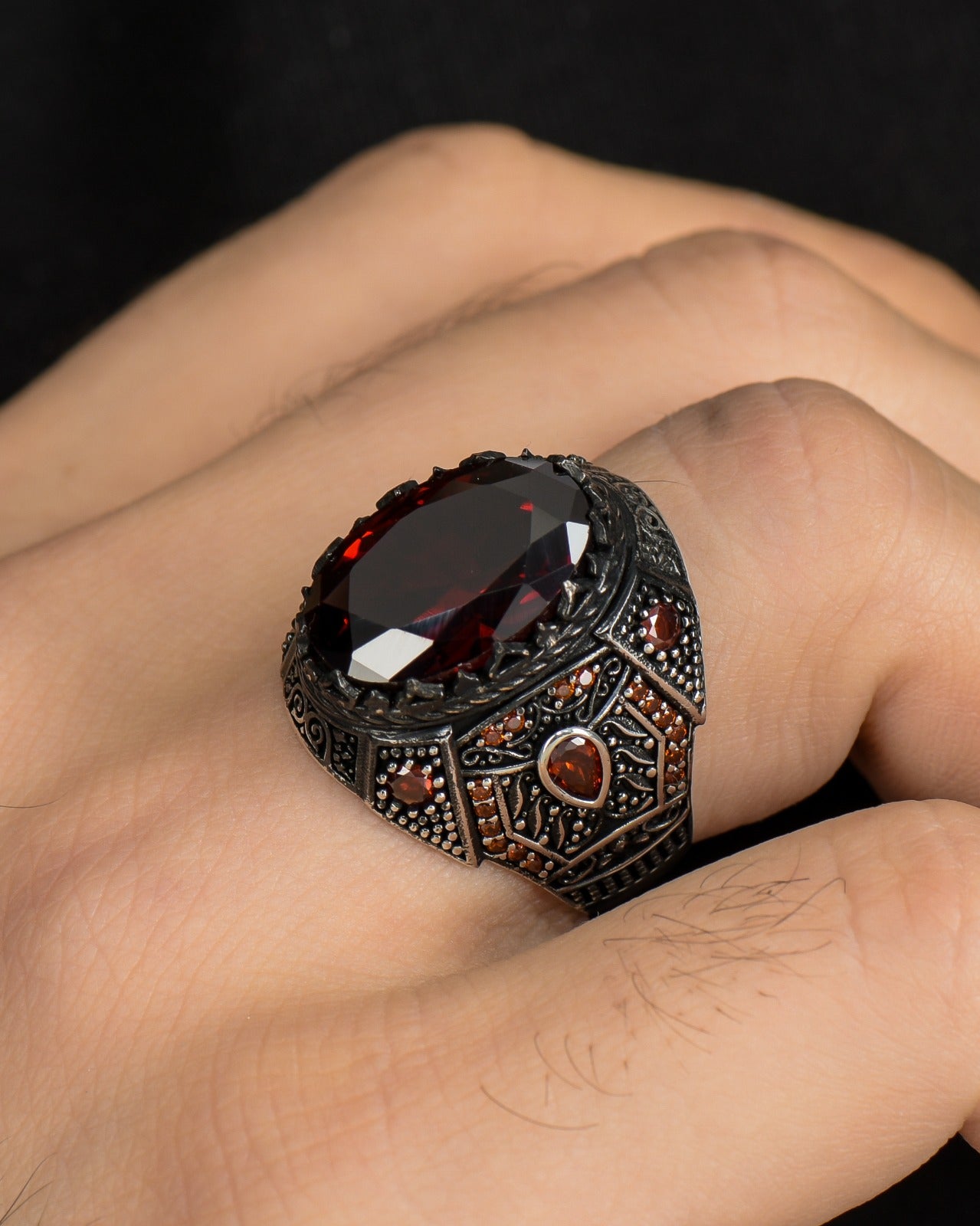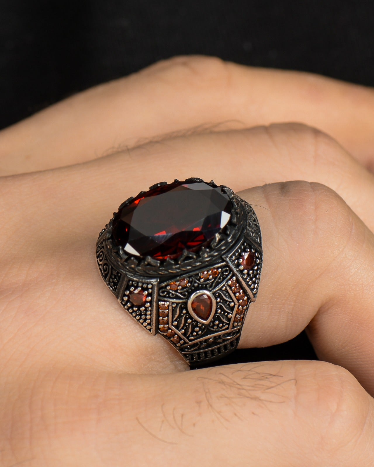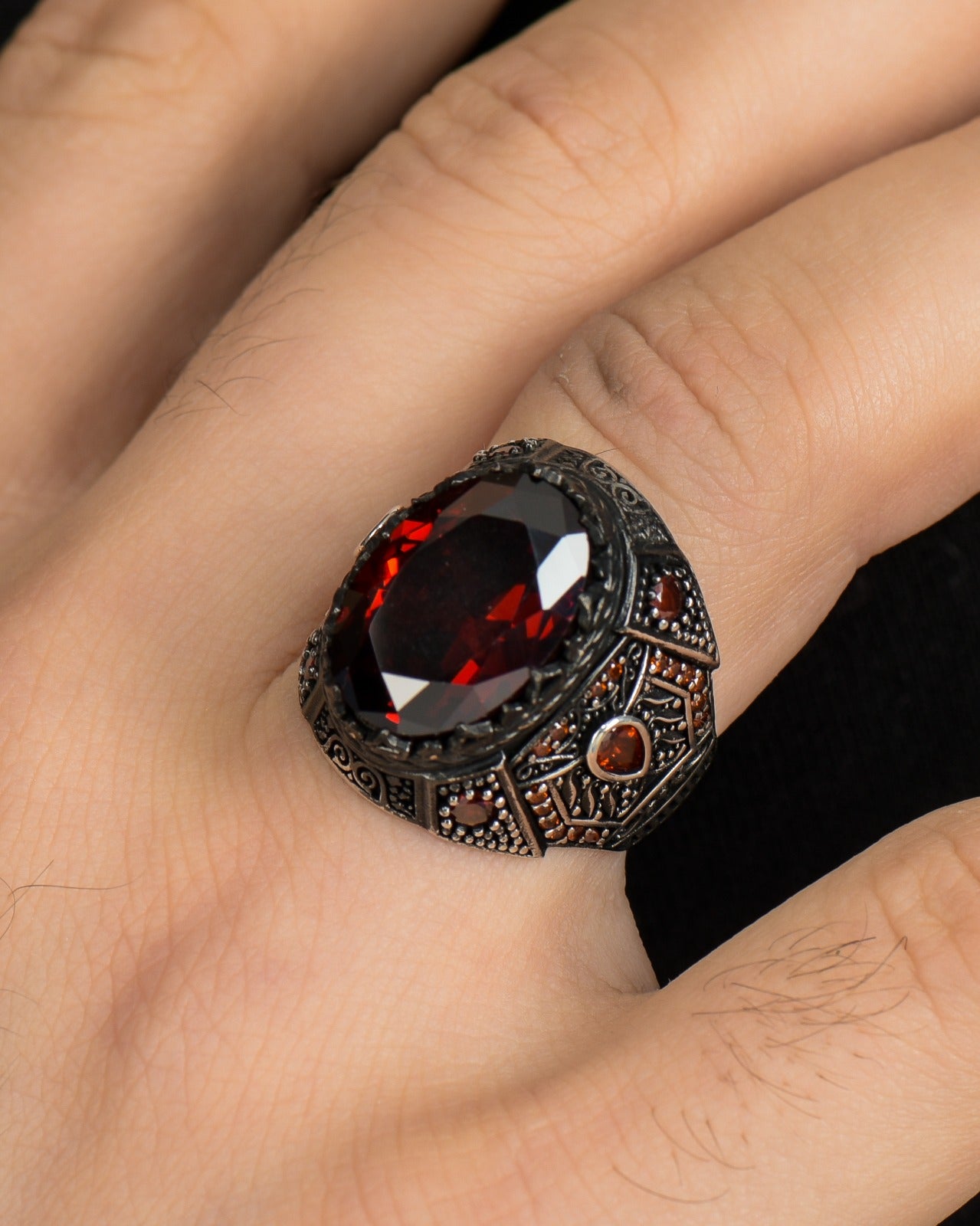 Kırmızı zirkon taşlı bu erkek yüzük, enerjisi ve şıklığı ile öne çıkıyor. Kendinizi veya sevdiklerinizi özel kılmak için ideal bir tercih. ❤️💫