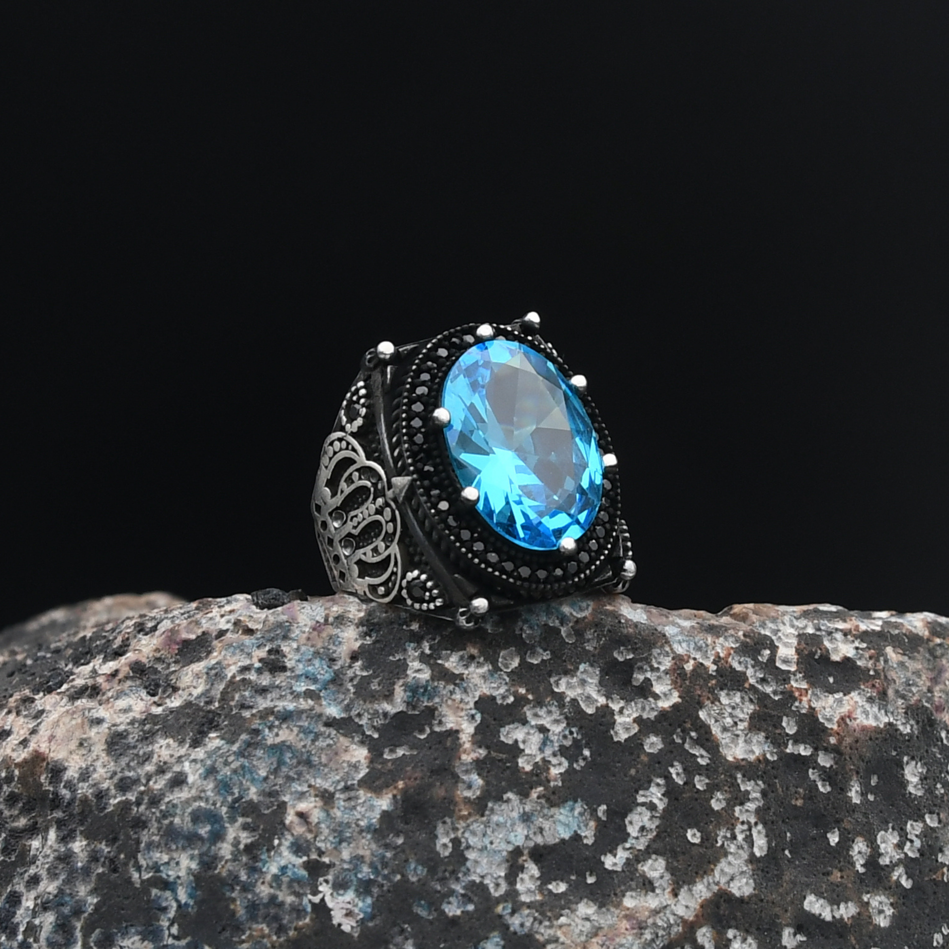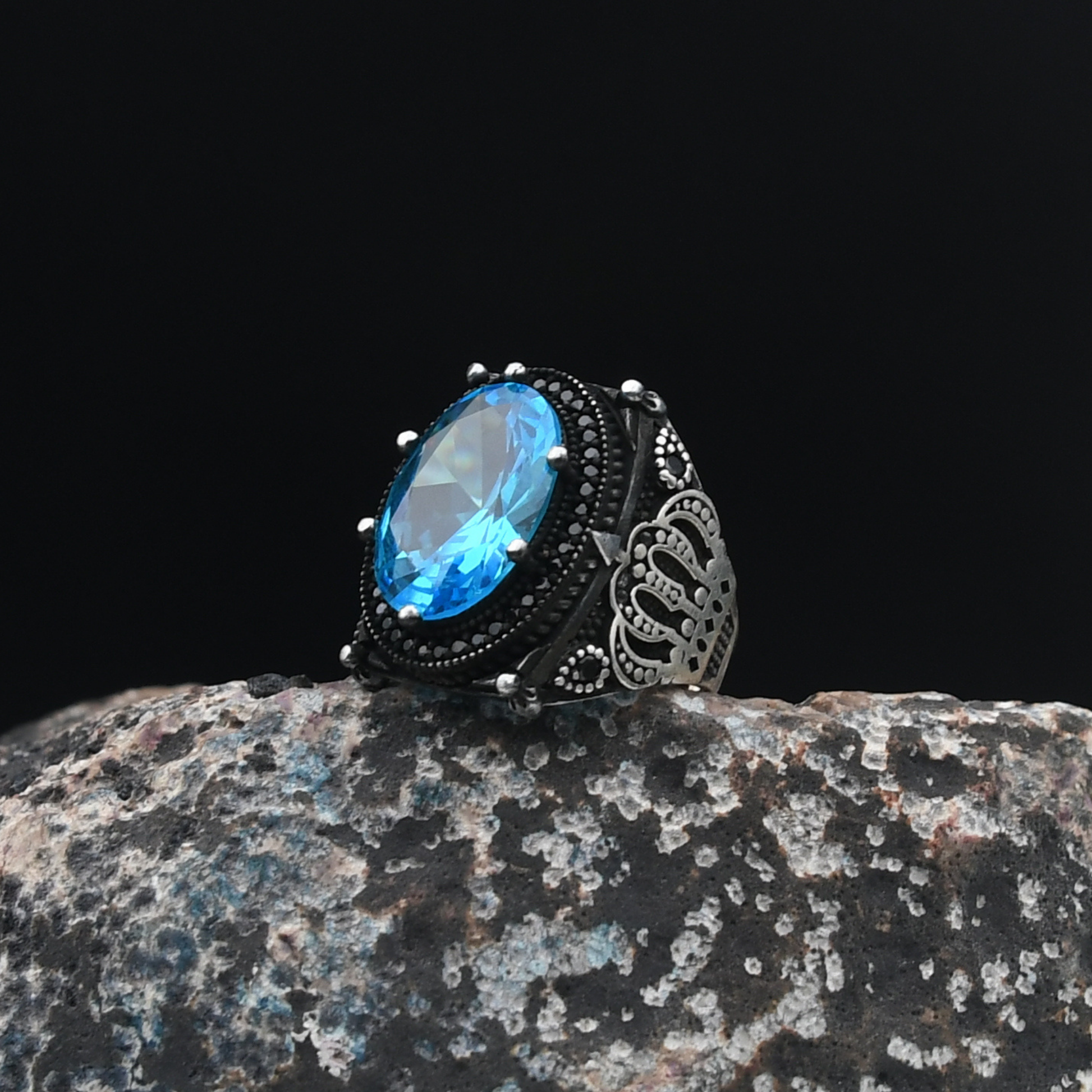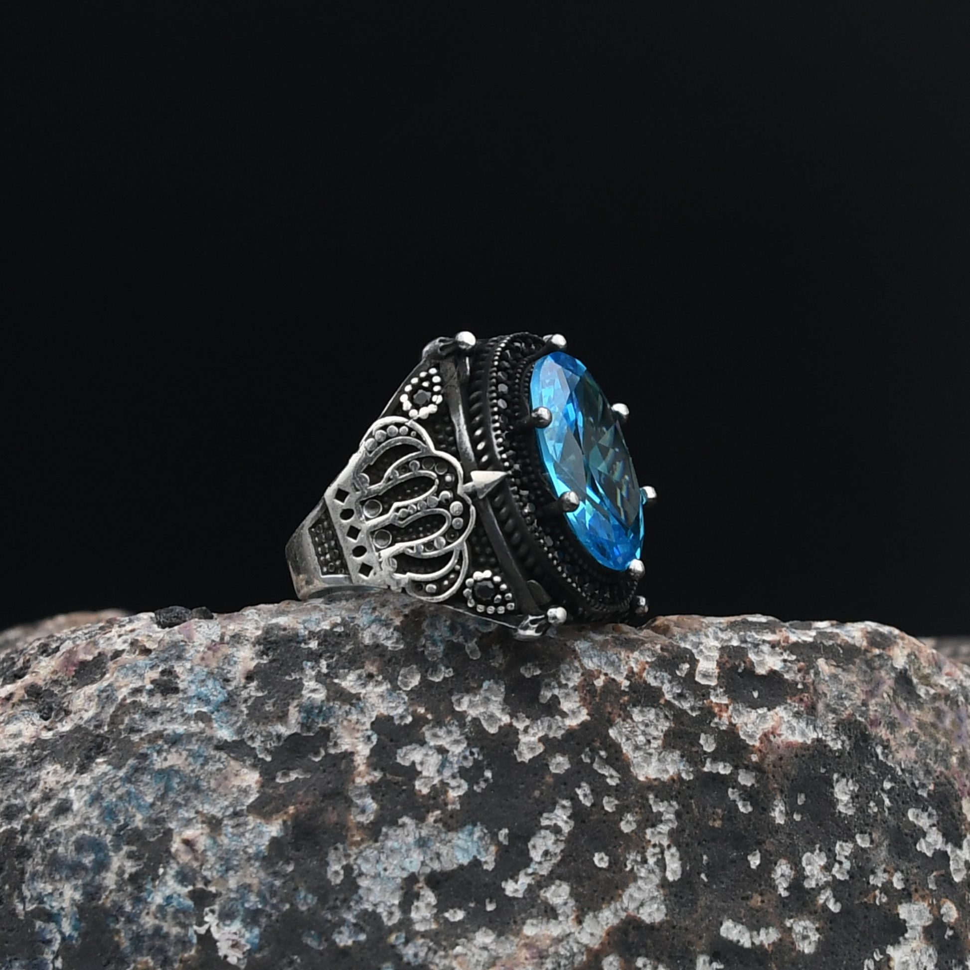 Merkezinde yer alan Aquamarine taşı, zarif ışıltısıyla yüzüğe modern ve güçlü bir hava katarken; yan kısımlardaki kral tacı motifi kudret, özgüven ve liderliği simgeler. %100 925 ayar saf gümüş kullanılarak üretilmiş olup uzun ömürlü kullanım sunar.
