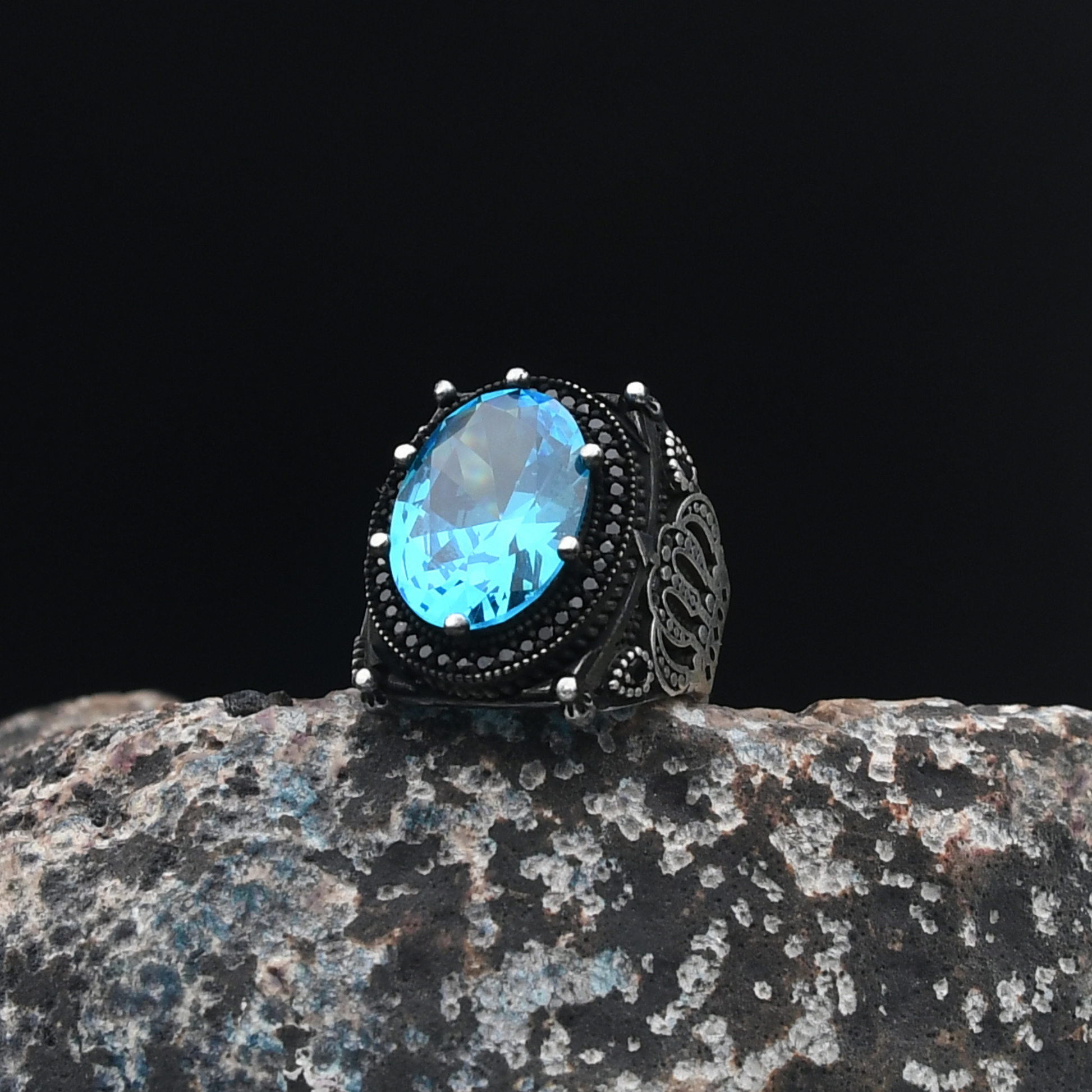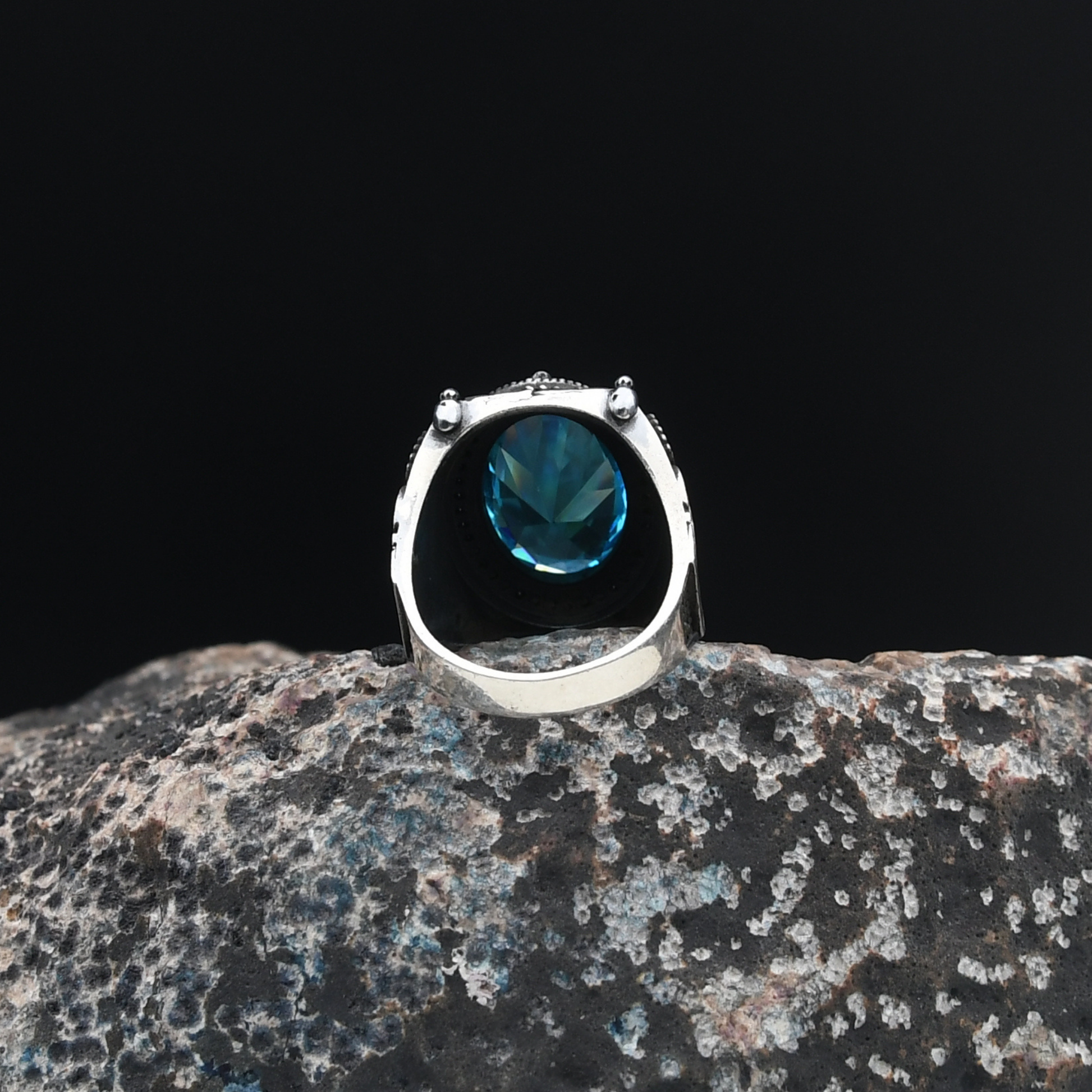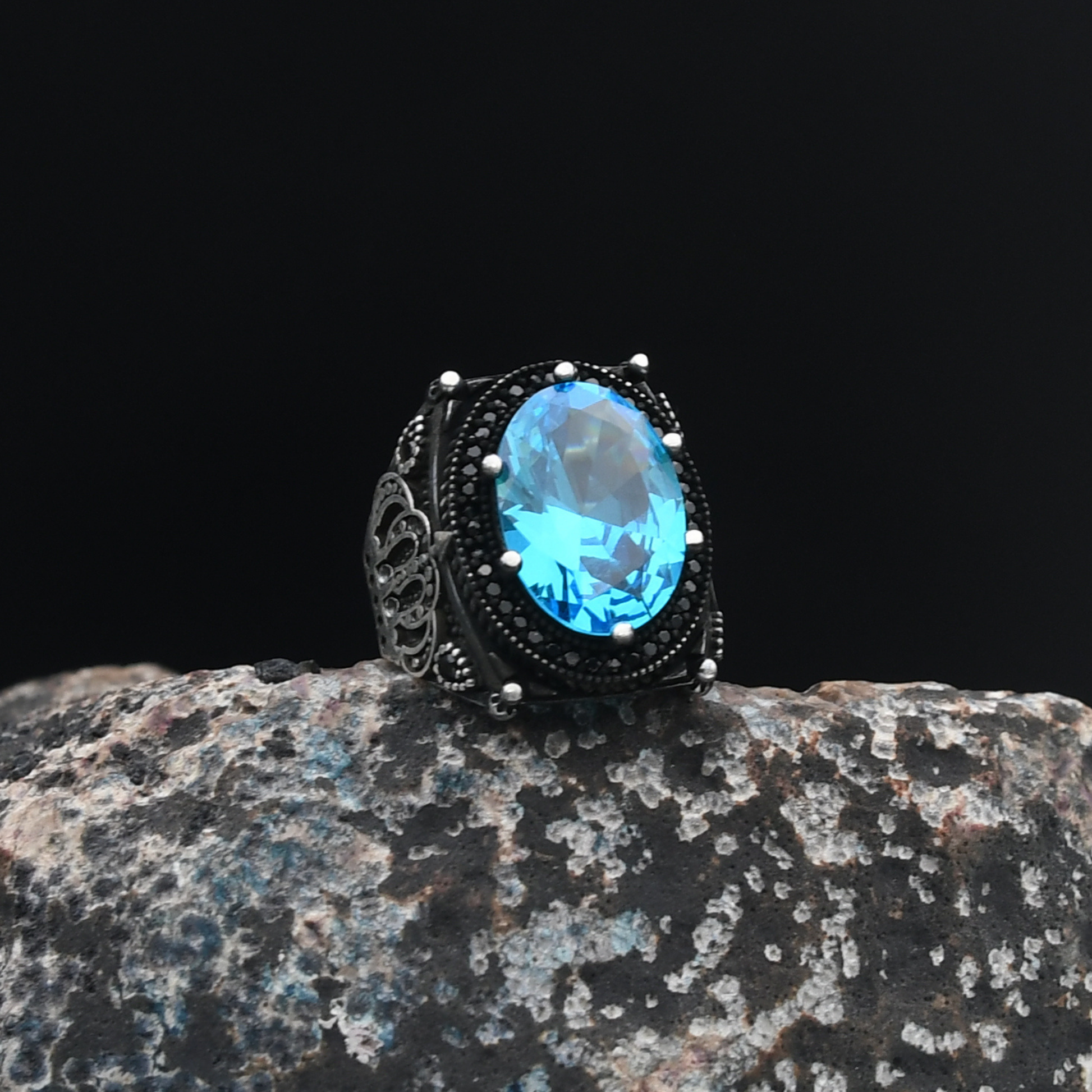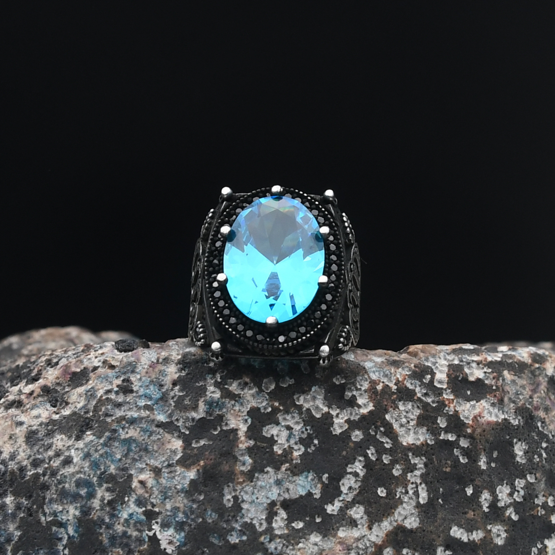 Merkezinde yer alan Aquamarine taşı, zarif ışıltısıyla yüzüğe modern ve güçlü bir hava katarken; yan kısımlardaki kral tacı motifi kudret, özgüven ve liderliği simgeler. %100 925 ayar saf gümüş kullanılarak üretilmiş olup uzun ömürlü kullanım sunar.