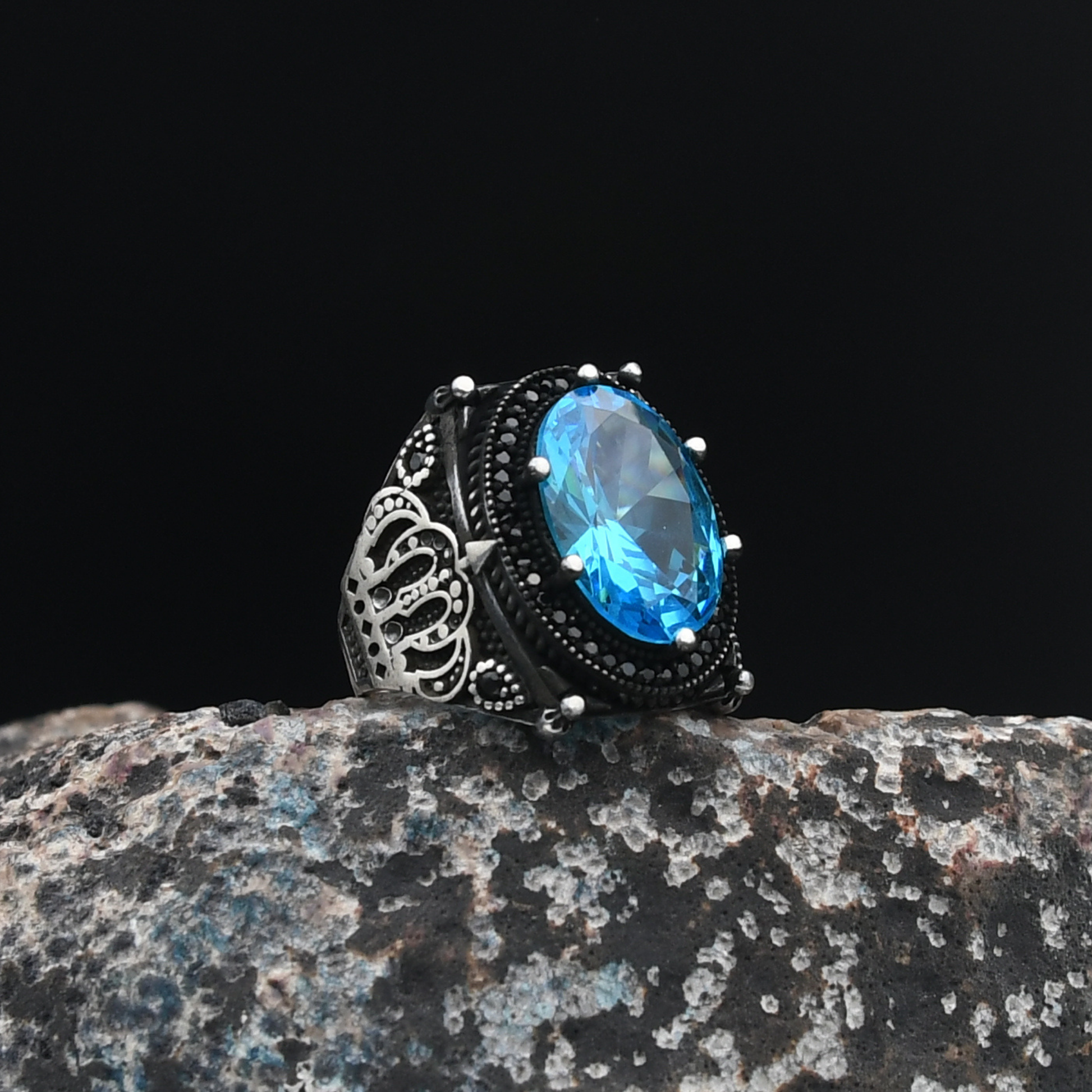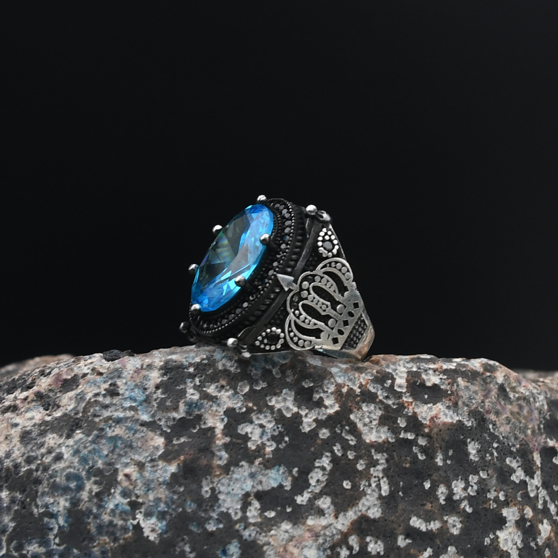 Kral Tacı Motifli Aquamarine Taşlı 925 Ayar Gümüş Erkek Yüzük