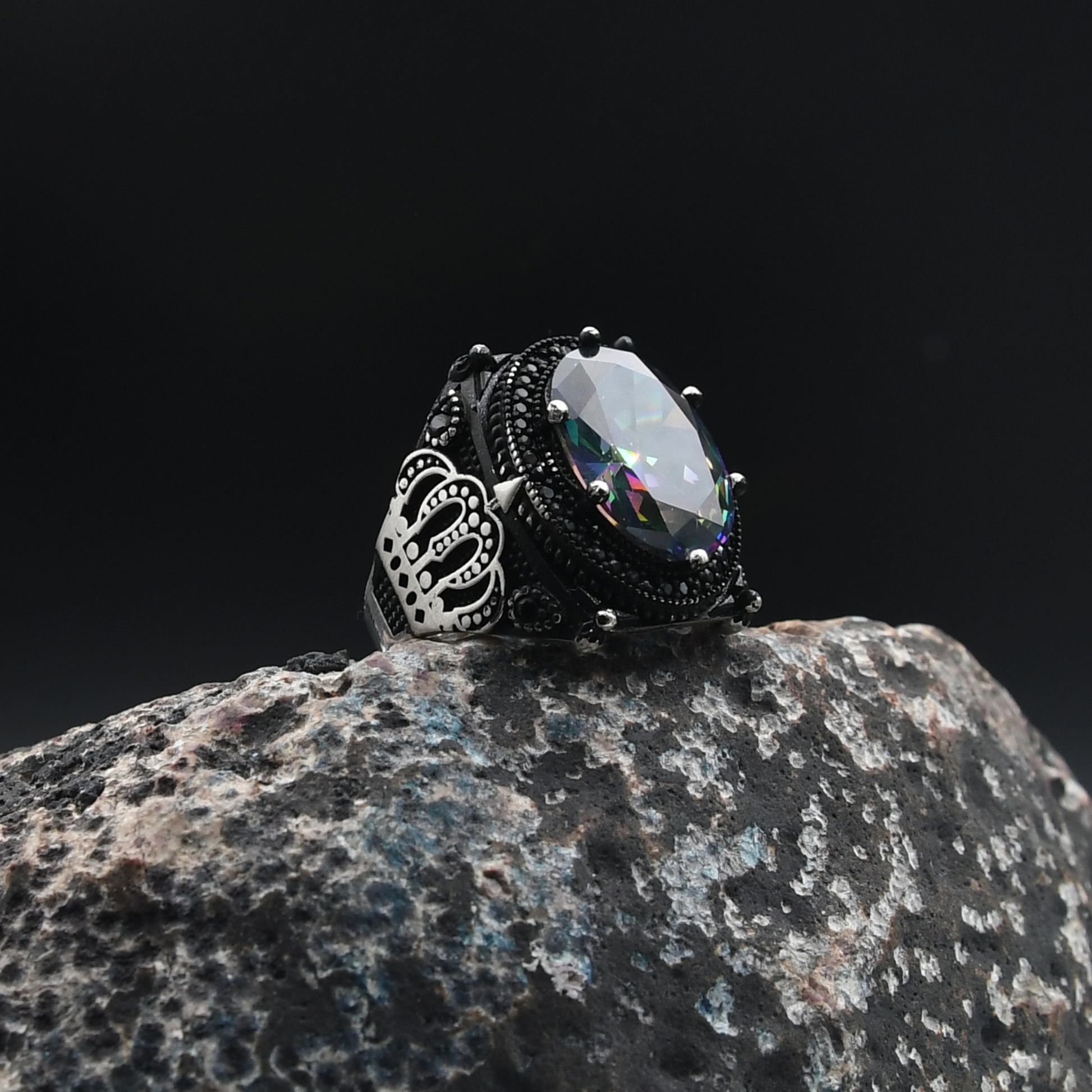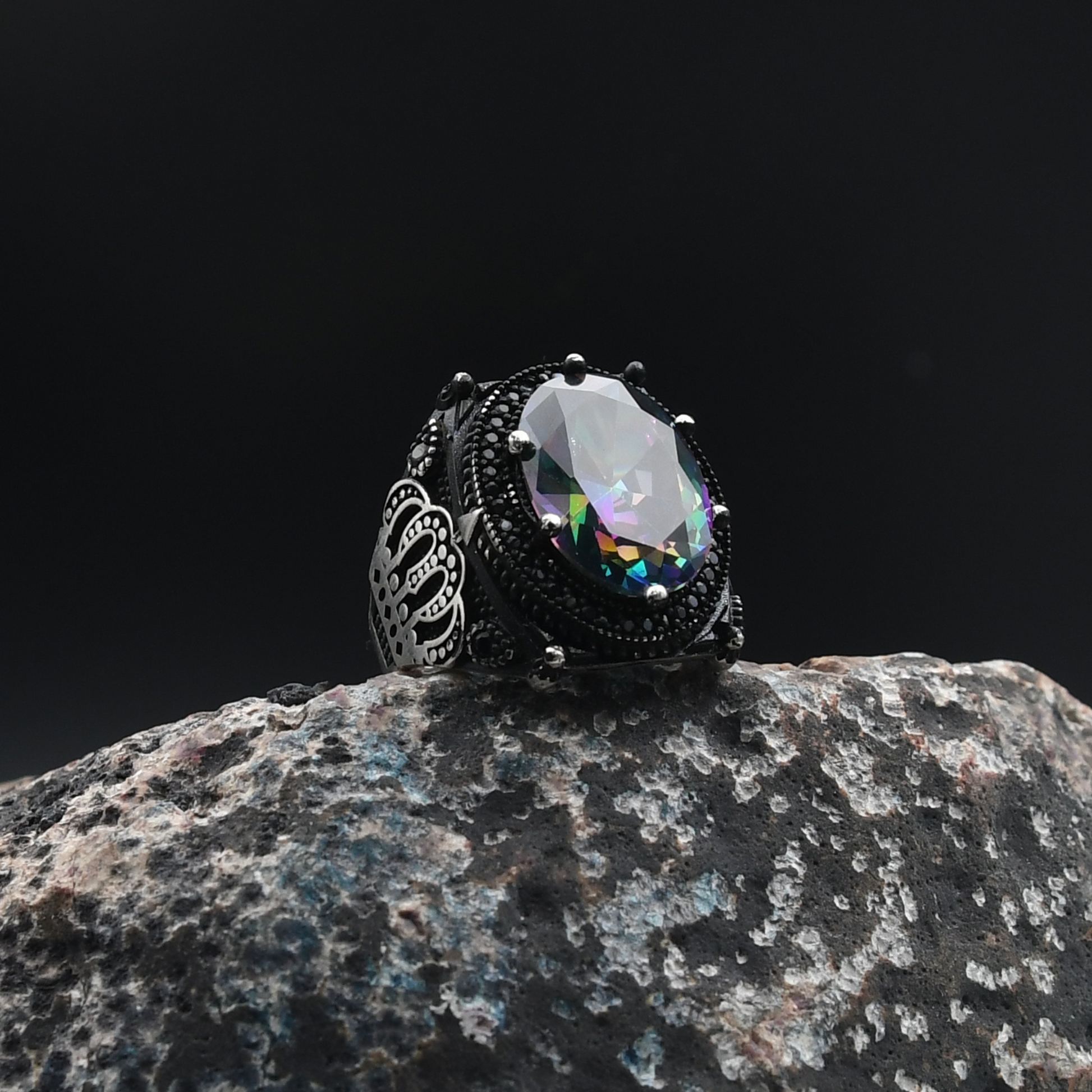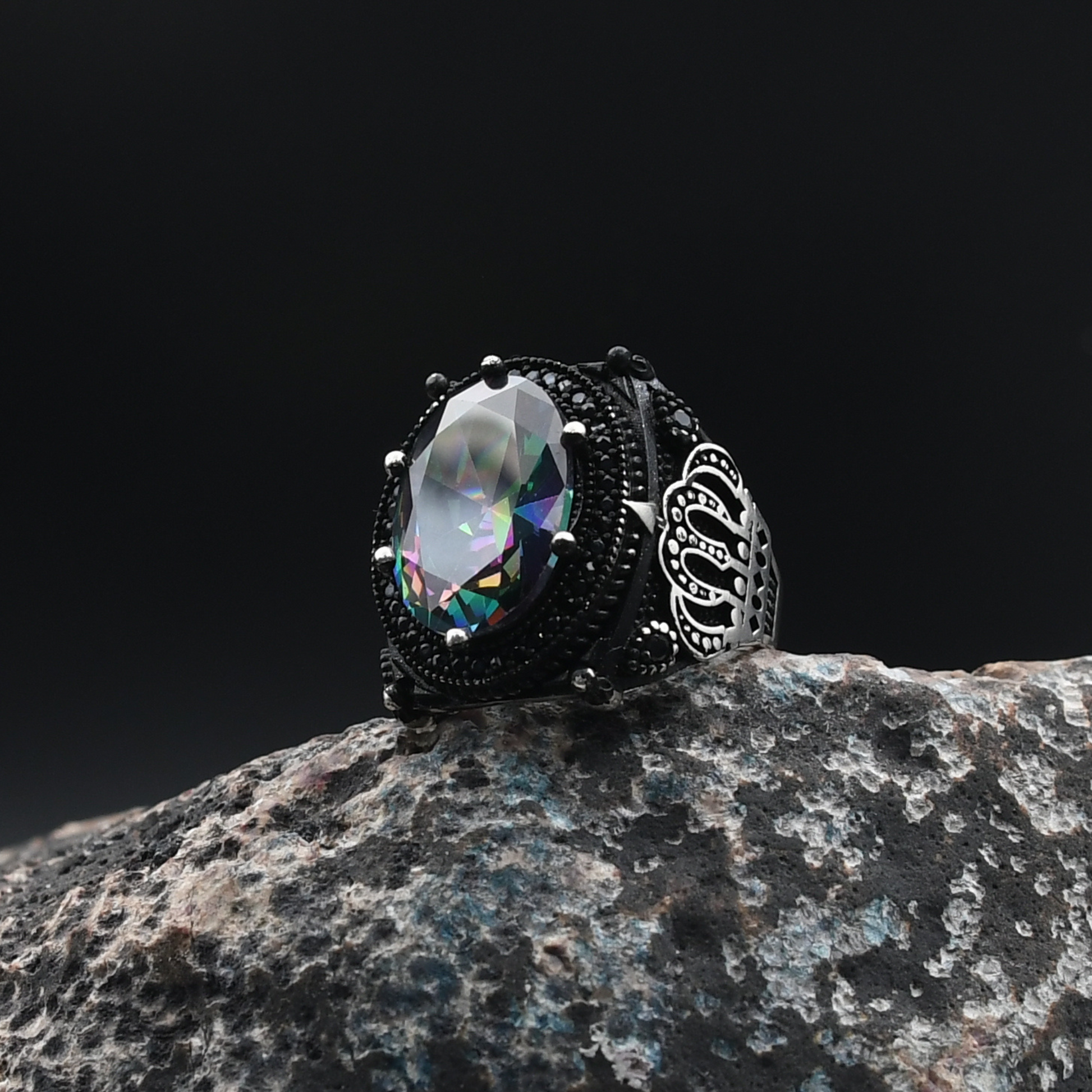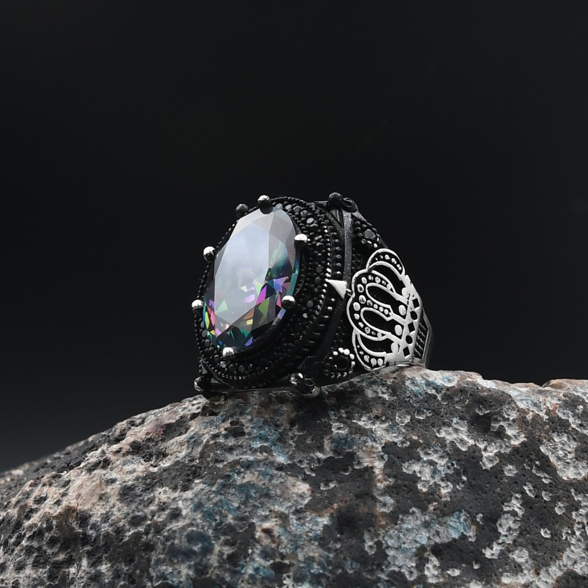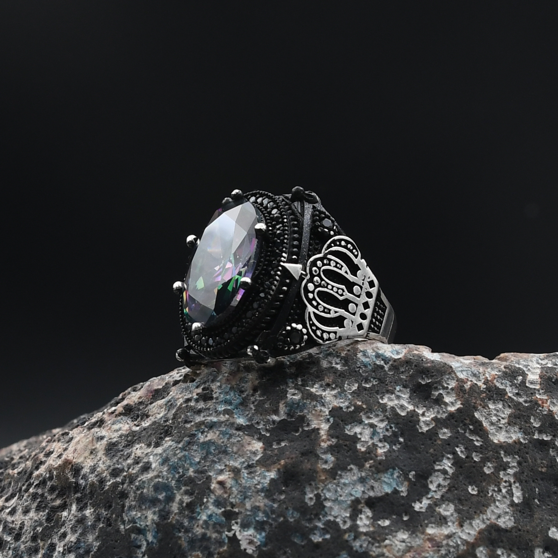 Göz alıcı renk geçişleriyle dikkat çeken Mistik Topaz taşı ve gücün simgesi kral tacı motifi bir araya gelerek modern ve etkileyici bir tasarım oluşturuyor. Özel işçilikle hazırlanan bu yüzük, günlük stiline karizma ve farklılık katmak isteyen erkekler için ideal bir parçadır.