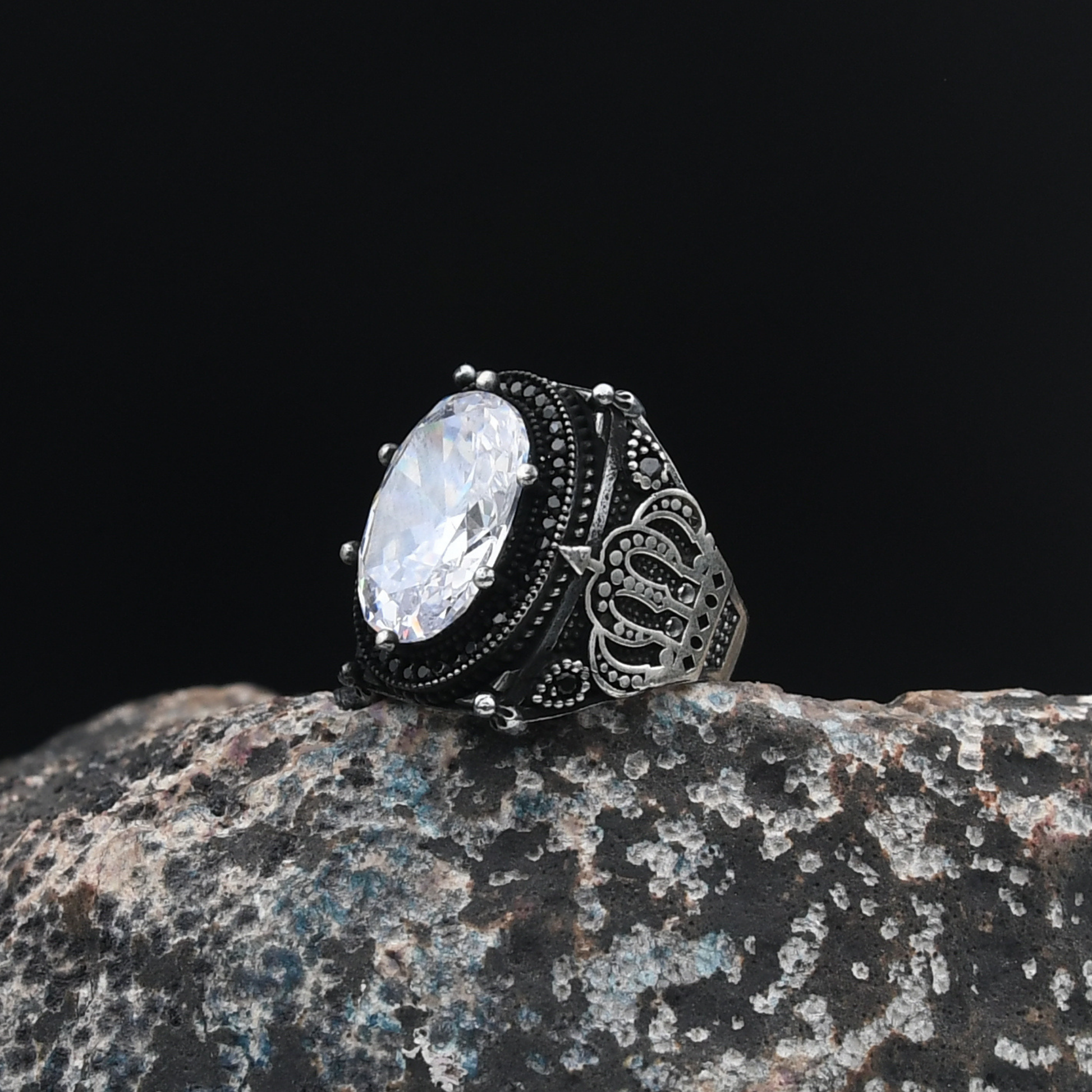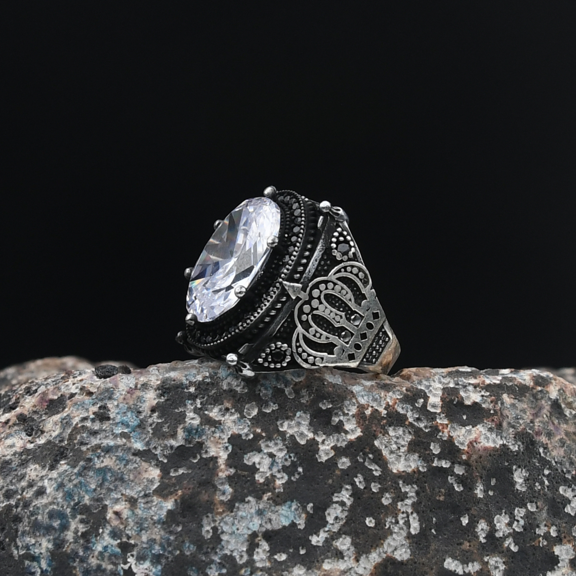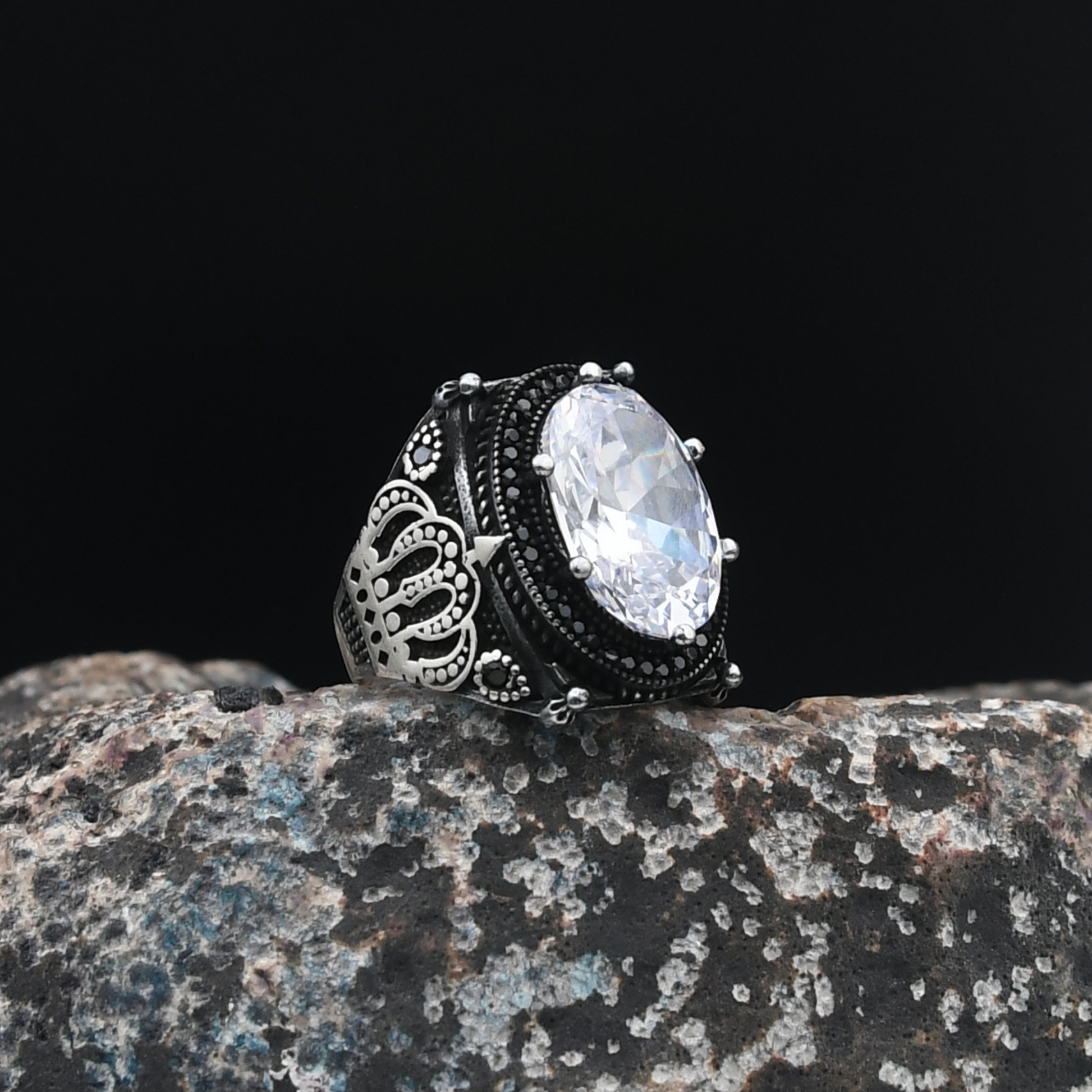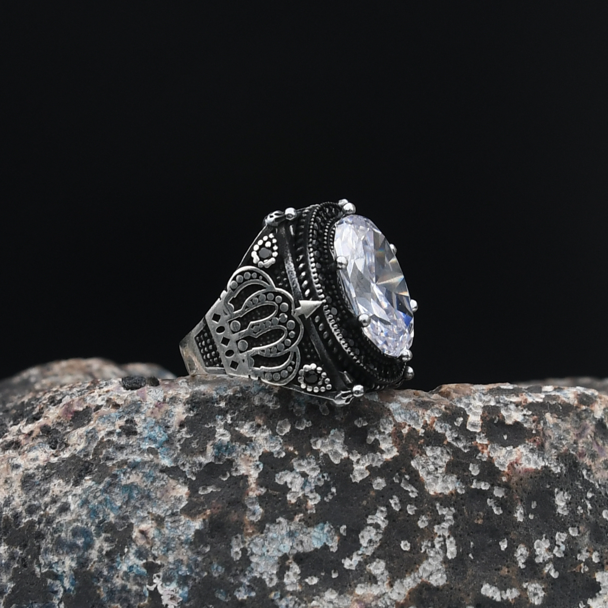 Kral Tacı Motifli Beyaz Zirkon Taşlı 925 Ayar Gümüş Erkek Yüzük