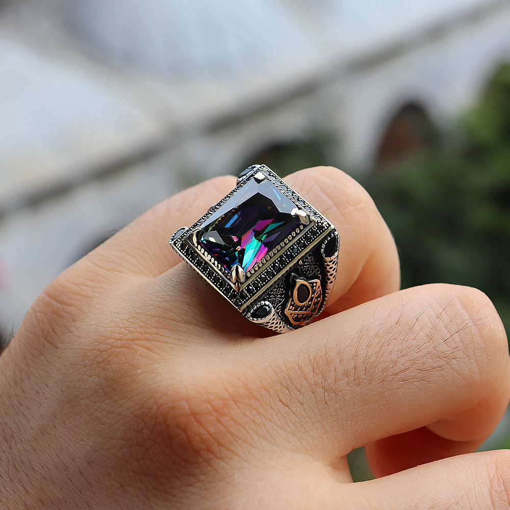 💍 Açıklama: Bu muazzam mistik topaz taşlı erkek yüzük, gizemli ve büyüleyici bir tarza sahip! 925 ayar gümüşten üretilmiş olan bu yüzük, etkileyici 20 gram ağırlığıyla dikkat çekiyor. Mistik topaz taşı, renk değiştiren büyüleyici özelliğiyle stilinize eşsiz bir dokunuş katıyor.