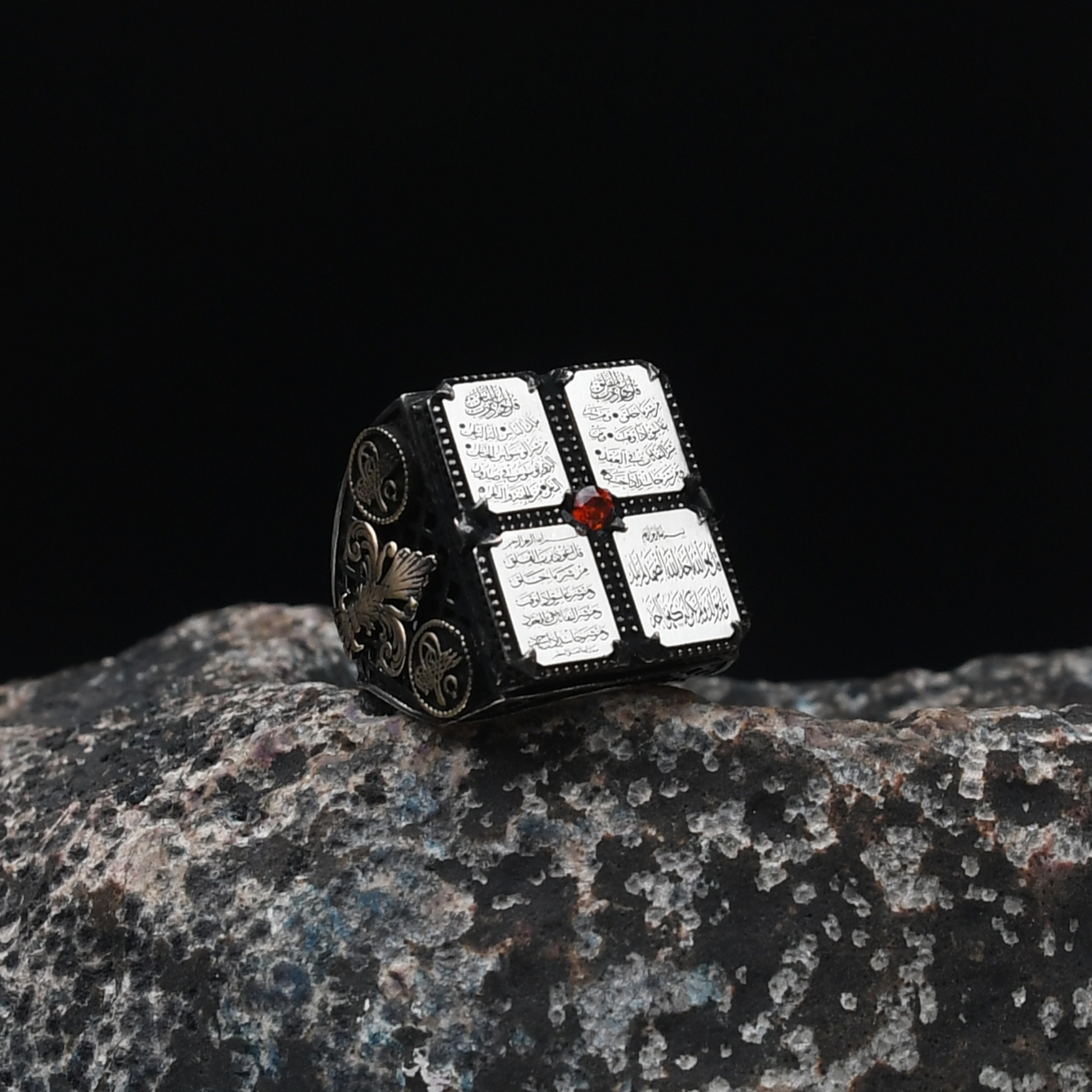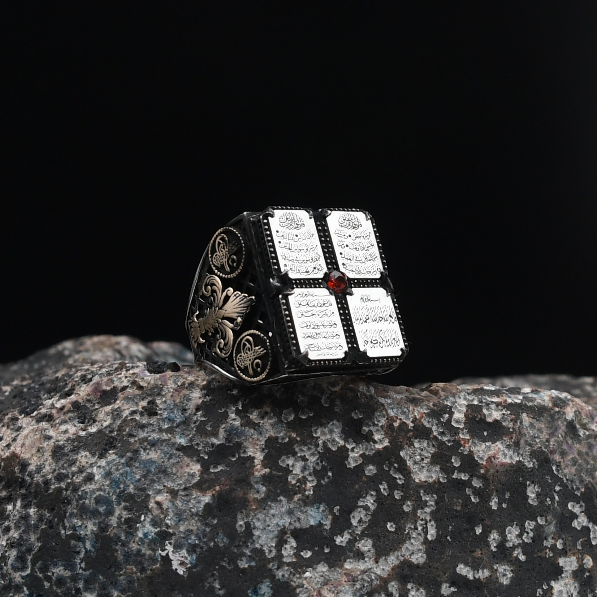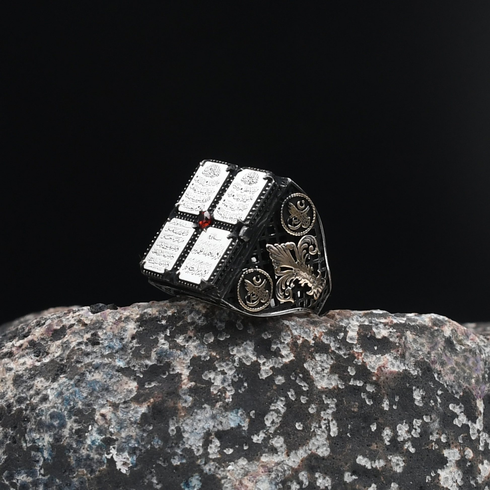 Üzerinde Kur’an-ı Kerim’in koruyucu sureleri olan Nas, Felak ve İhlas surelerinin yer aldığı bu özel yüzük, Osmanlı tuğrası ile birlikte hem manevi hem de tarihi bir anlam taşır. 18 gramlık 925 ayar gümüşten üretilmiş olan bu yüzük; inancını her an yanında taşımak isteyenler ve aynı zamanda şık bir aksesuar arayanlar için tasarlandı.