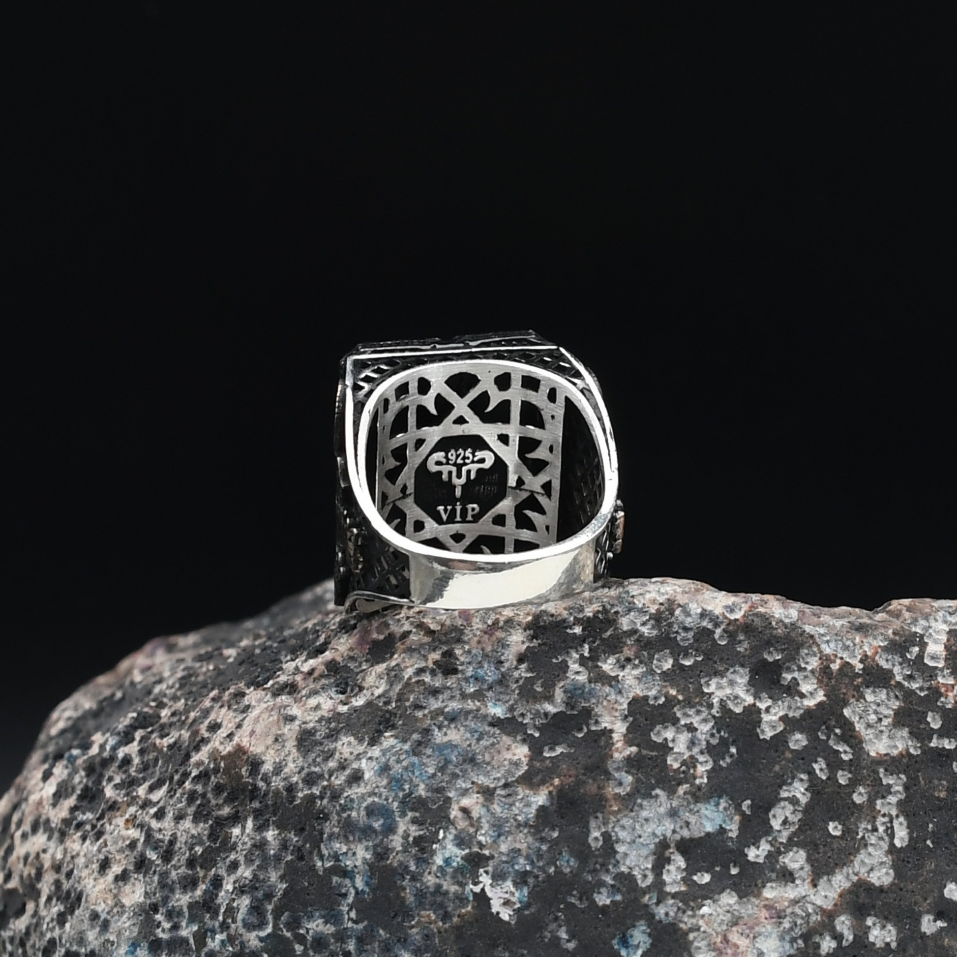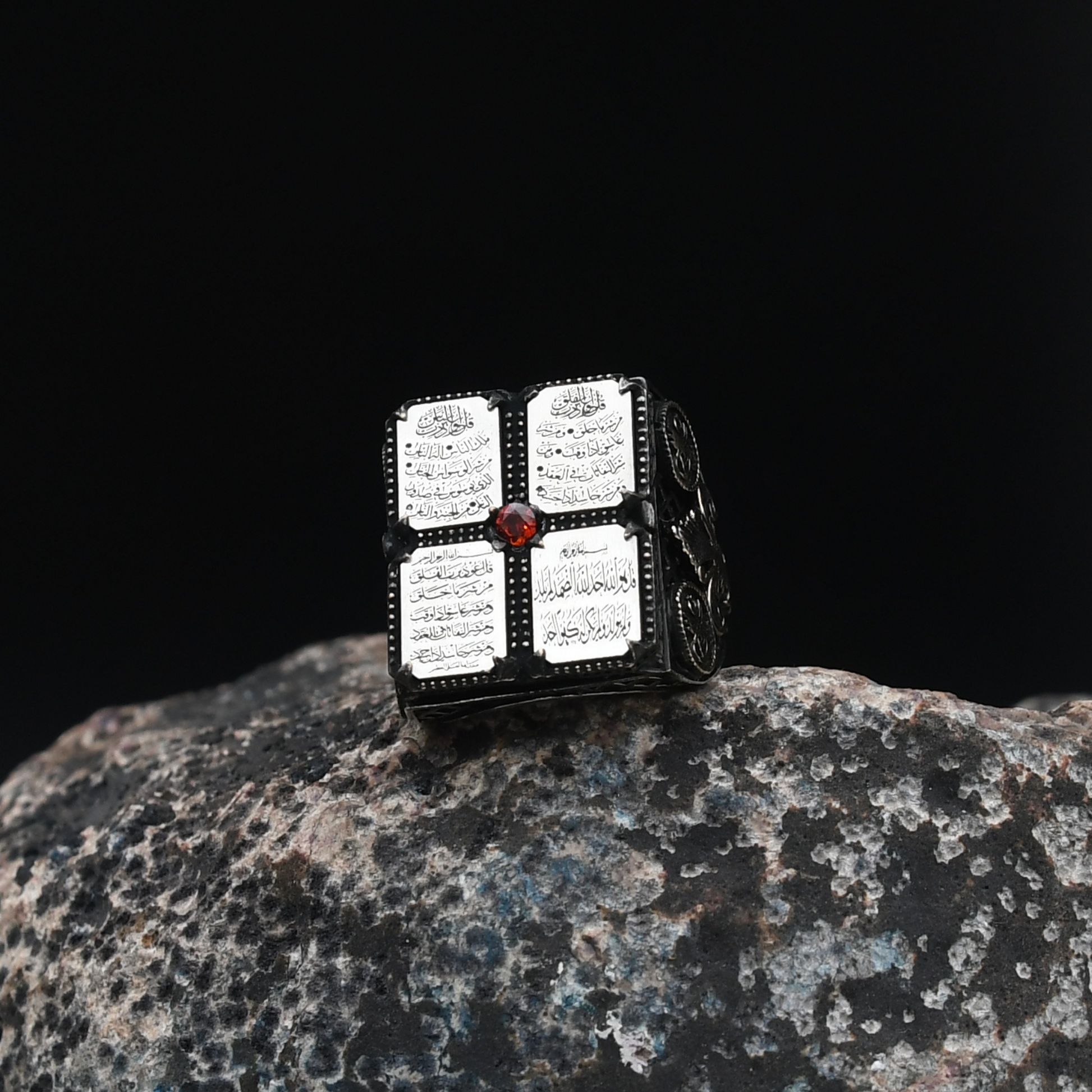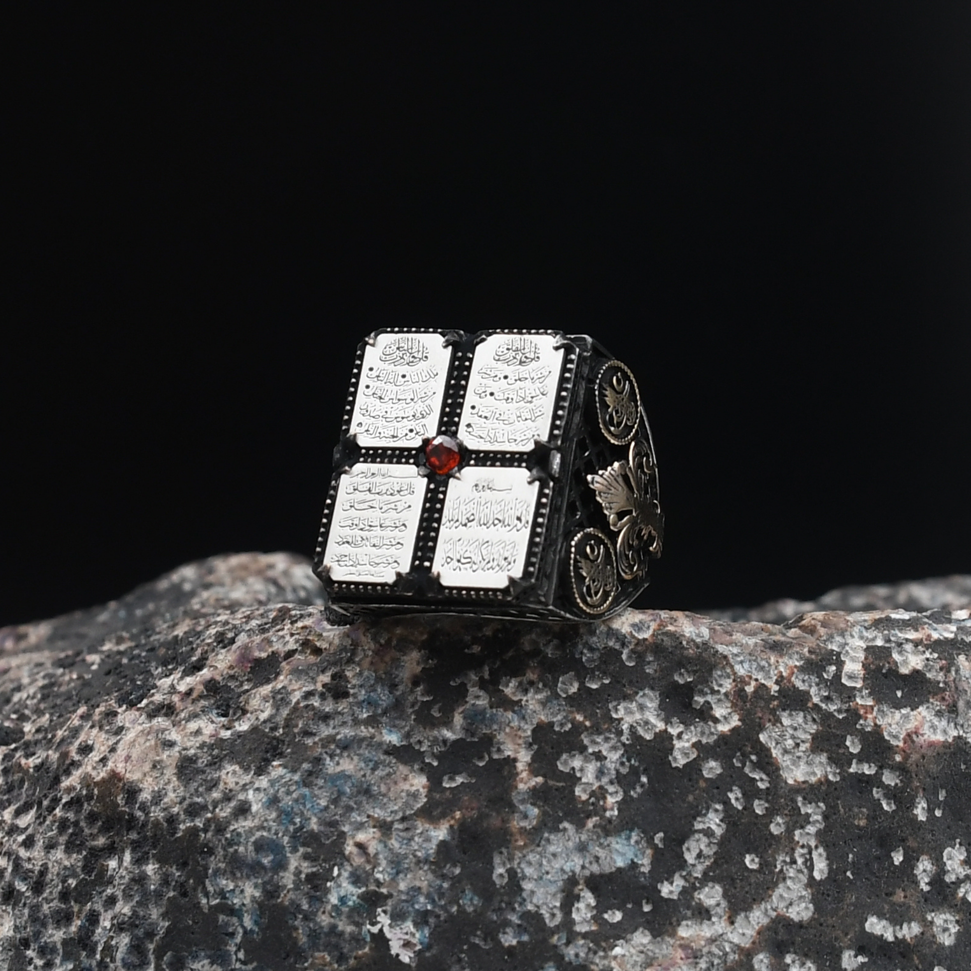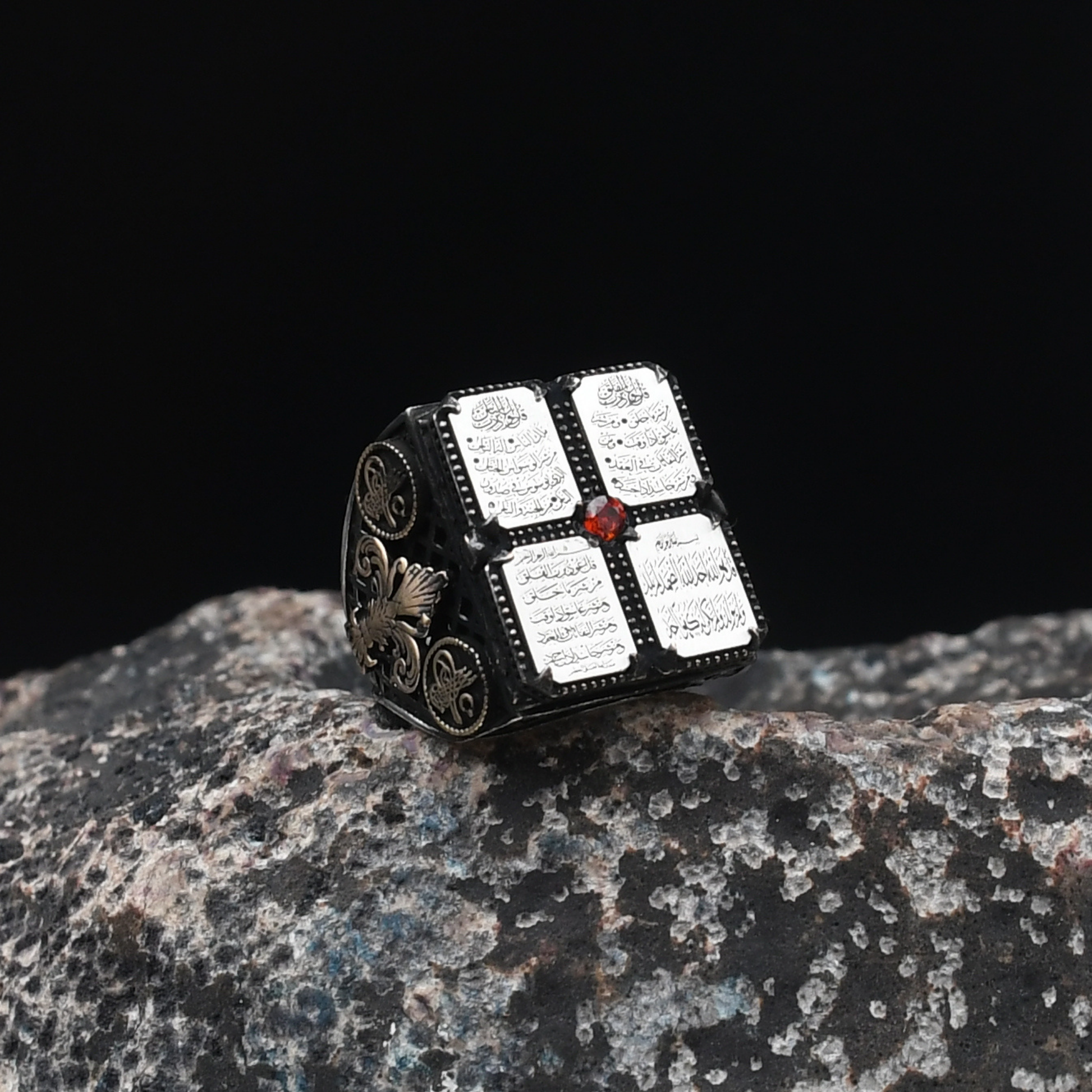 Üzerinde Kur’an-ı Kerim’in koruyucu sureleri olan Nas, Felak ve İhlas surelerinin yer aldığı bu özel yüzük, Osmanlı tuğrası ile birlikte hem manevi hem de tarihi bir anlam taşır. 18 gramlık 925 ayar gümüşten üretilmiş olan bu yüzük; inancını her an yanında taşımak isteyenler ve aynı zamanda şık bir aksesuar arayanlar için tasarlandı.