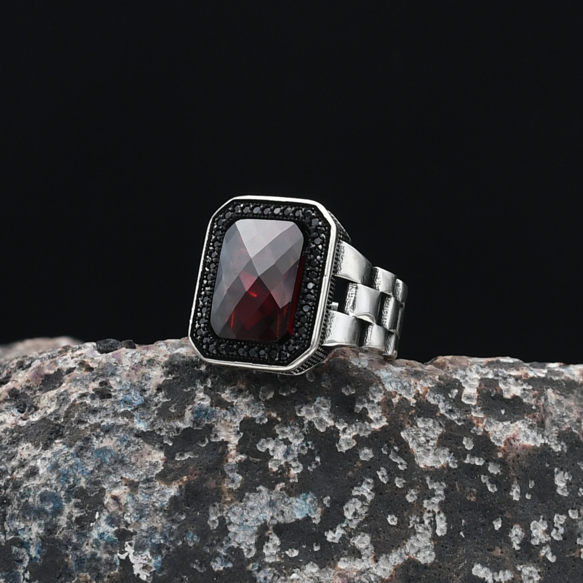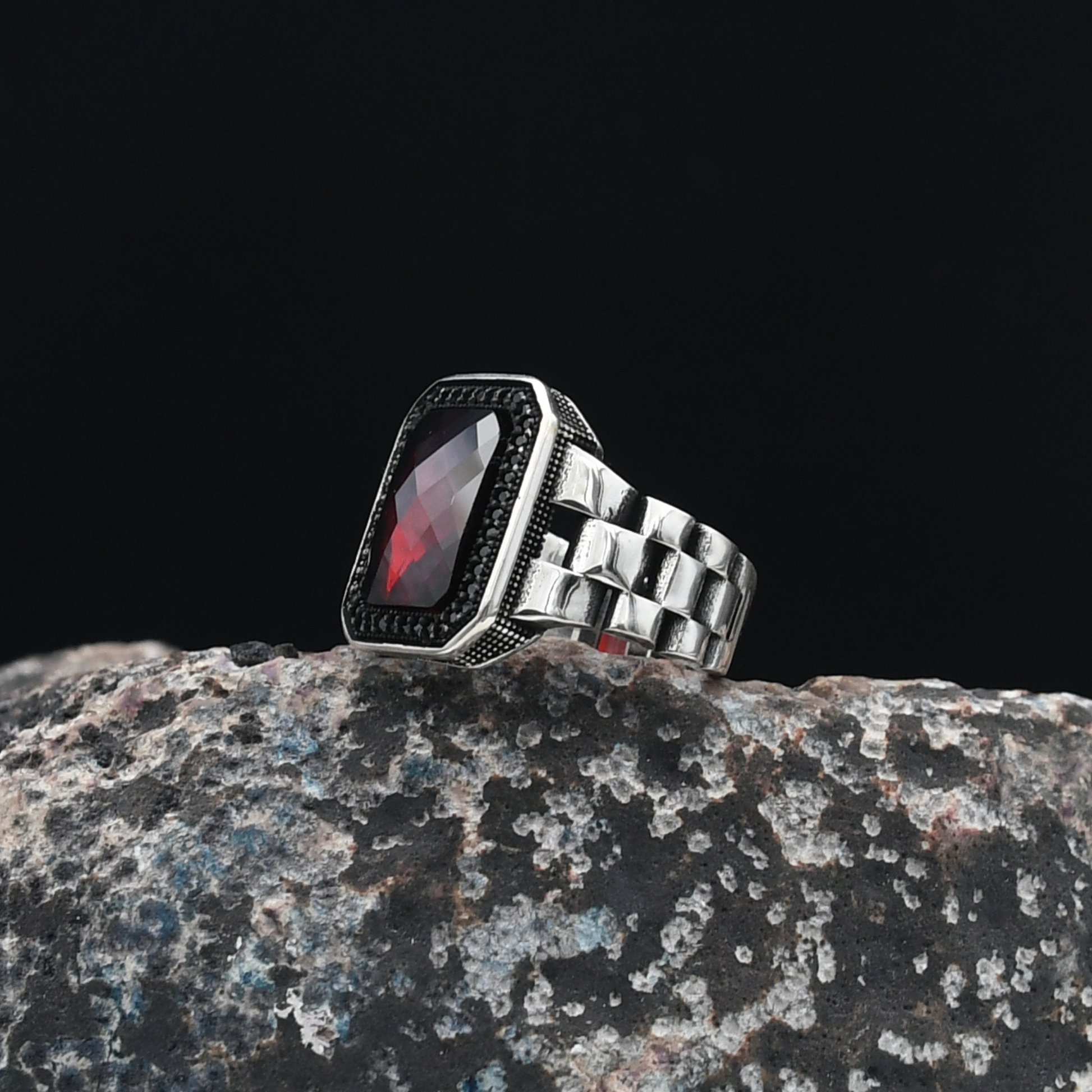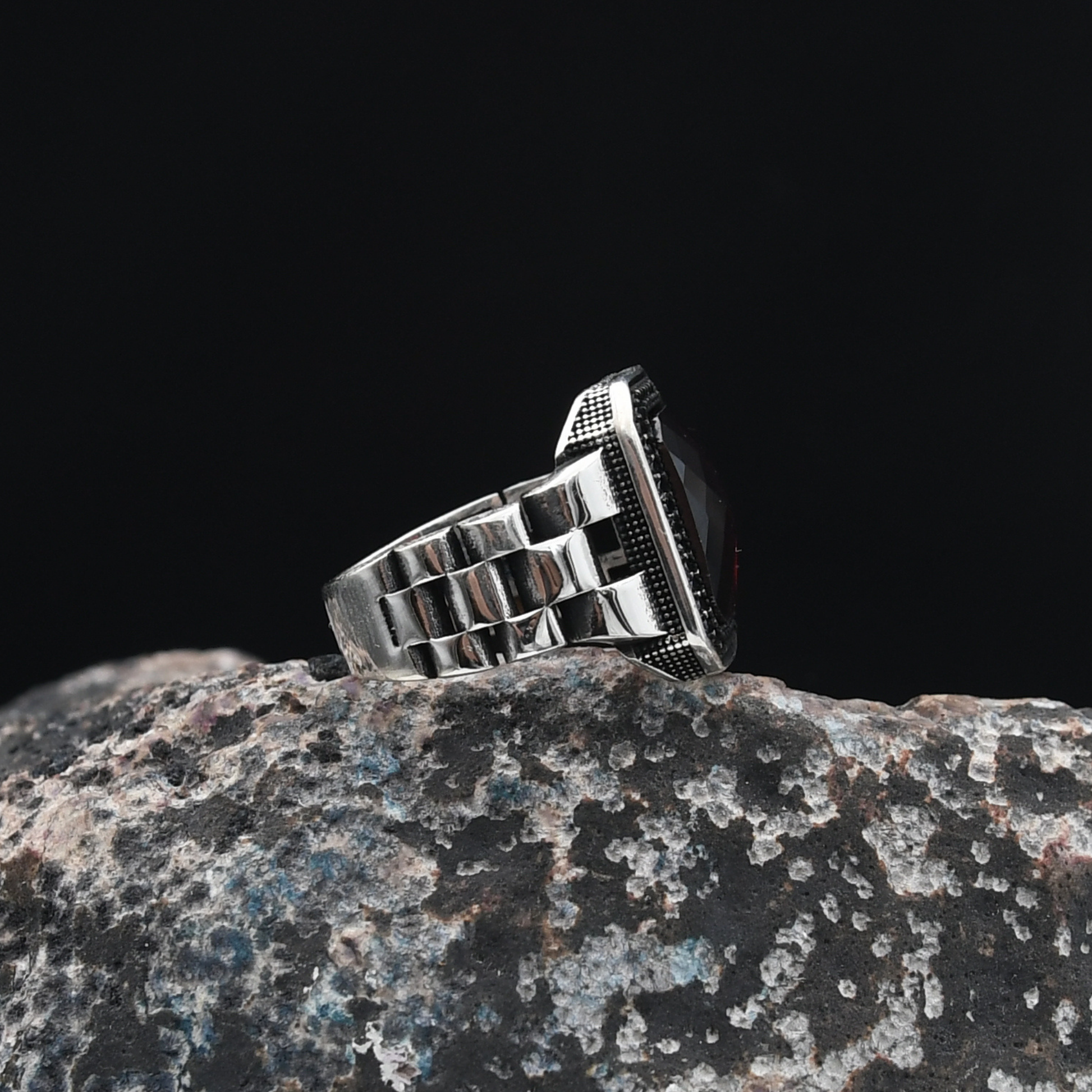 Saat Kordonu Tasarımlı Kırmızı Taşlı 925 Ayar Gümüş Erkek Yüzük – Yüzükçü Farkıyla