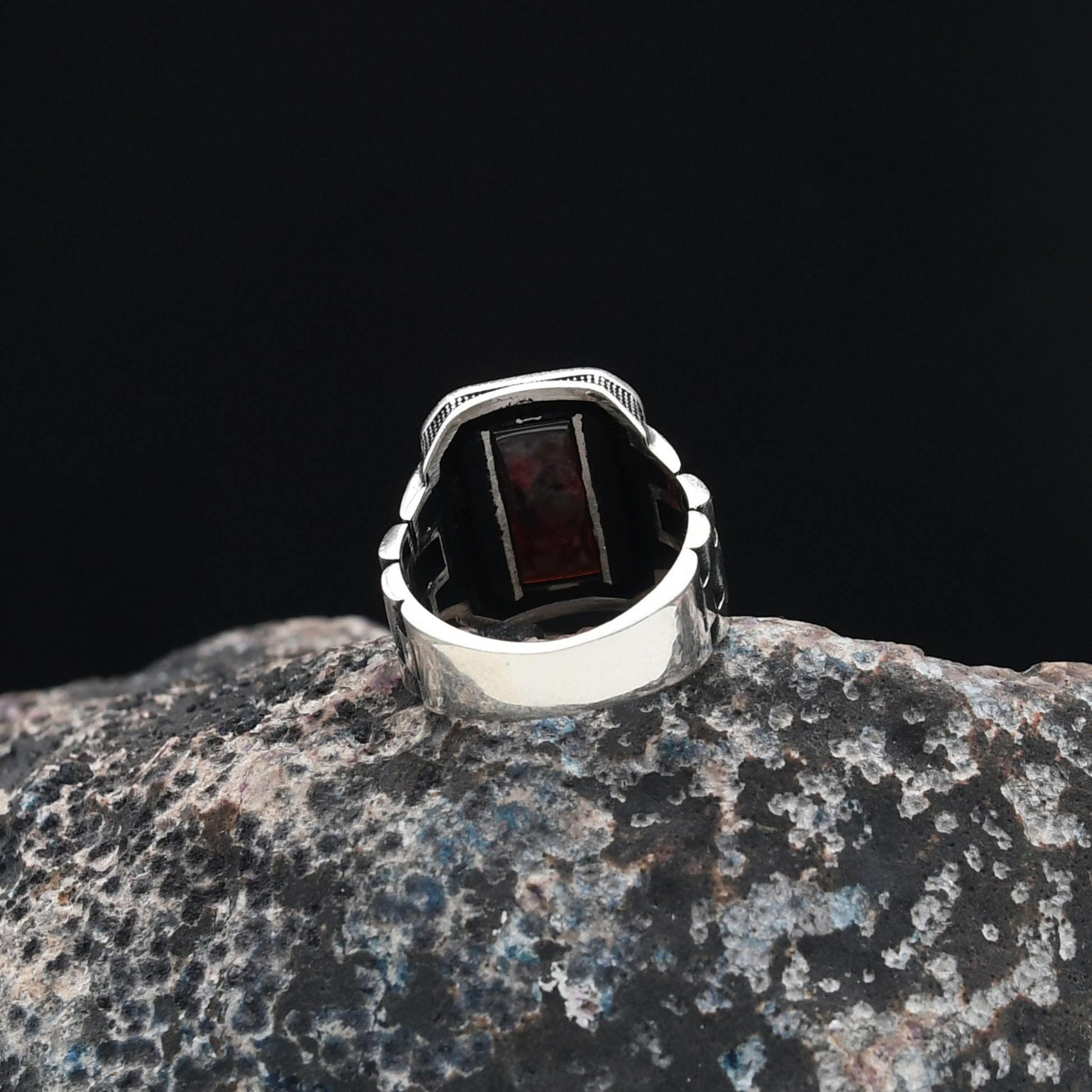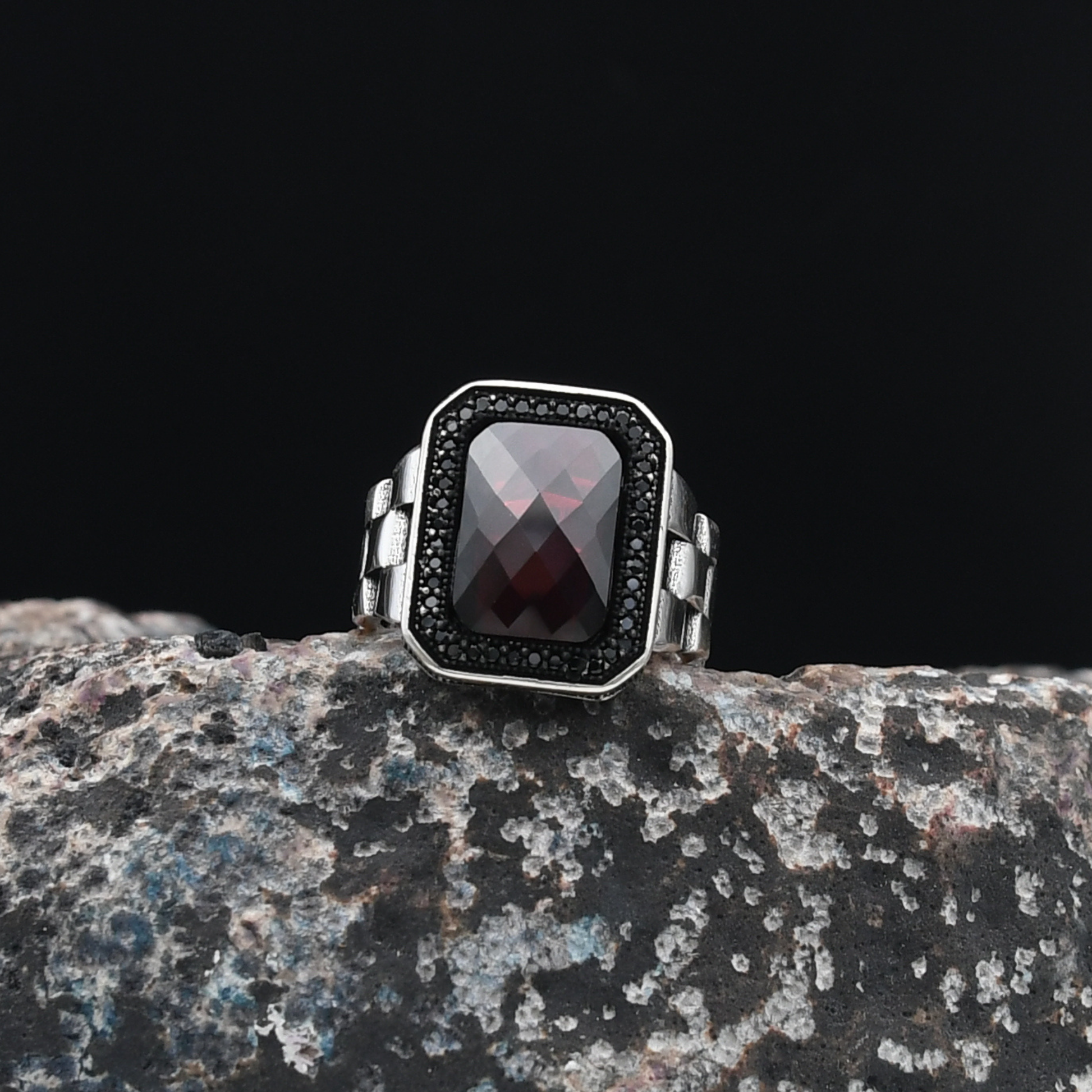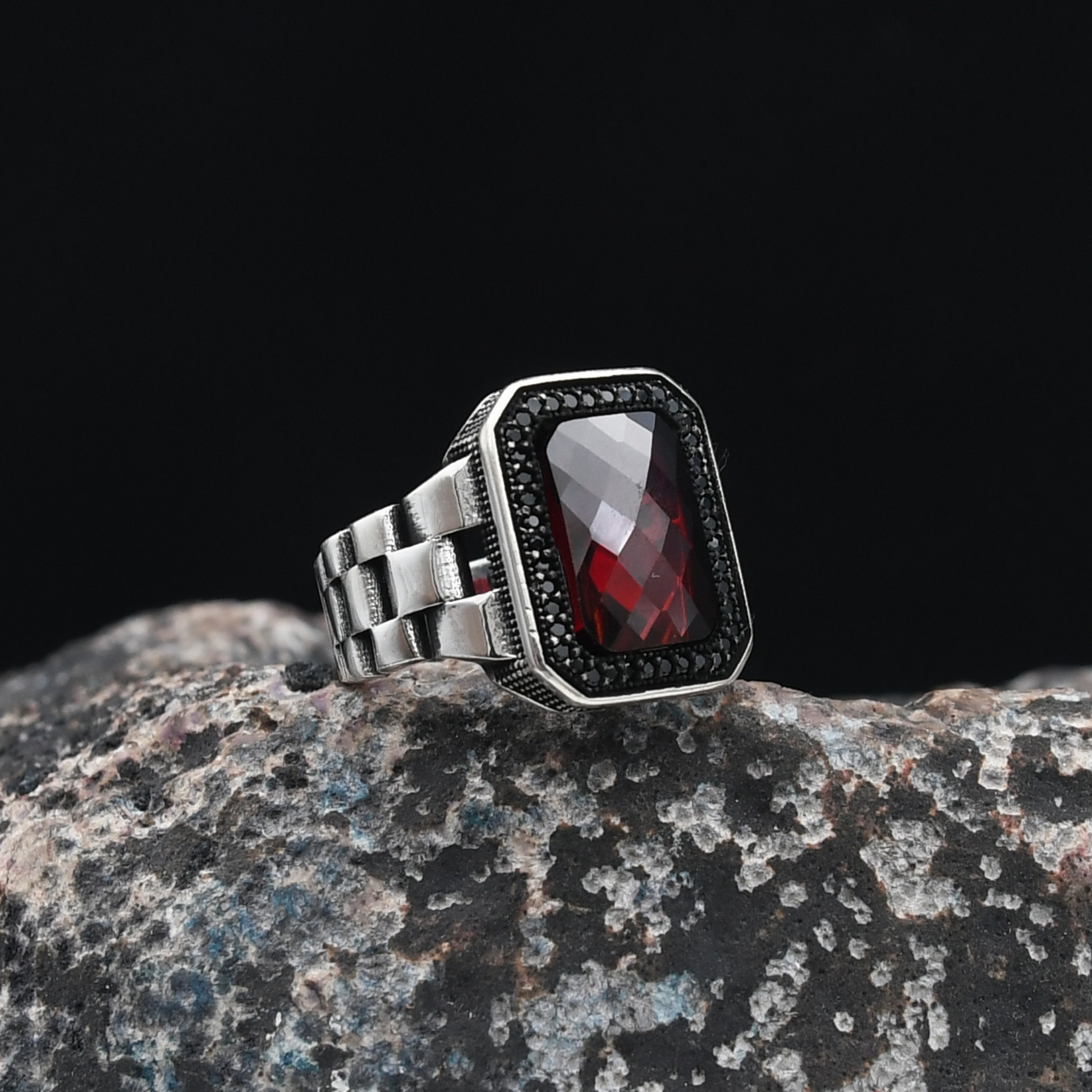 Saat Kordonu Tasarımlı Kırmızı Taşlı 925 Ayar Gümüş Erkek Yüzük – Yüzükçü Farkıyla
