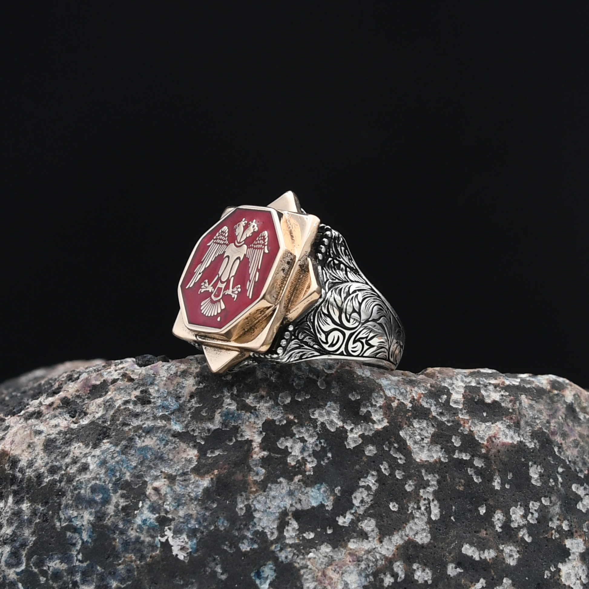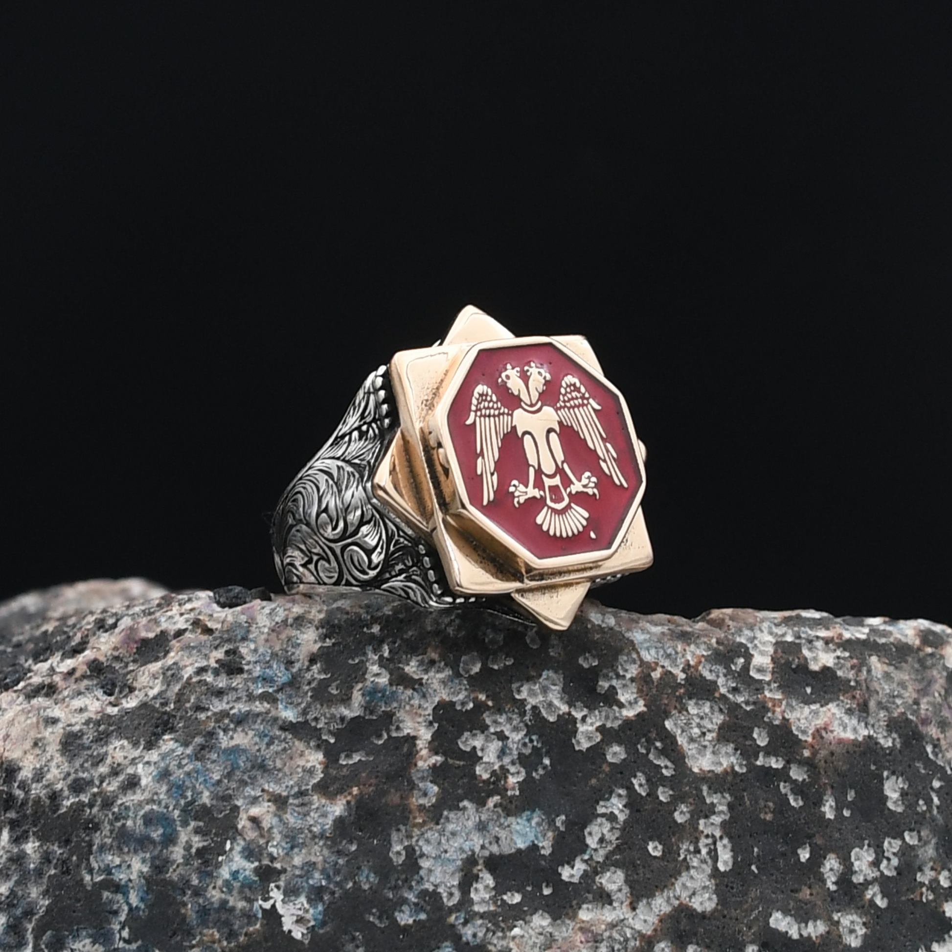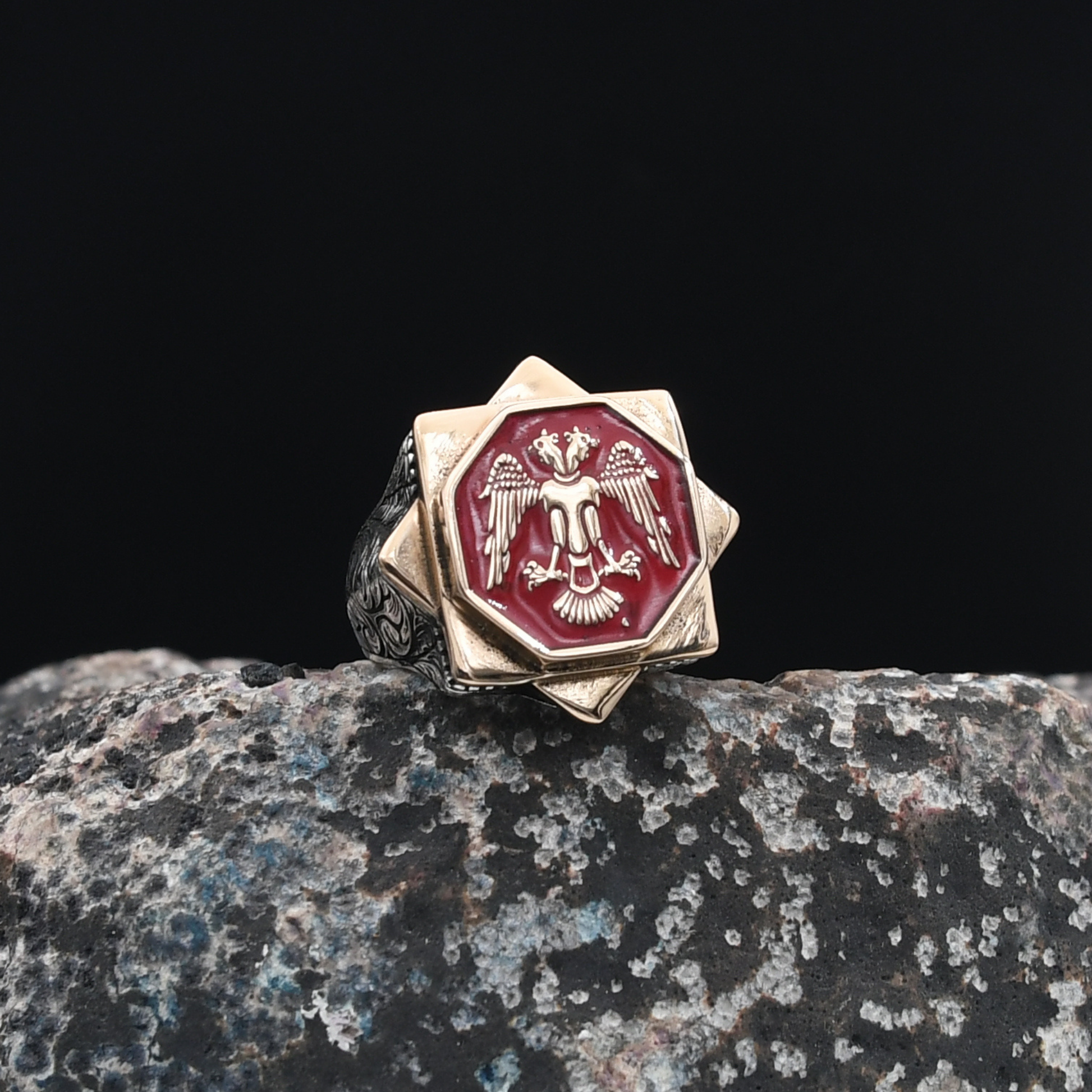 Tarihin güçlü simgelerinden biri olan Selçuklu Kartalı 🦅, bu yüzükte ustalıkla işlenerek erkek stiline tarihi bir anlam ve asil bir duruş katıyor. Çift başlı kartal, gücü, iktidarı ve bilgeliği temsil ederken yüzüğün detaylı işçiliği ile şıklığı bir araya getiriyor. Kendine güvenen, geçmişin güçlü mirasını günümüze taşımak isteyen erkekler için tasarlandı.