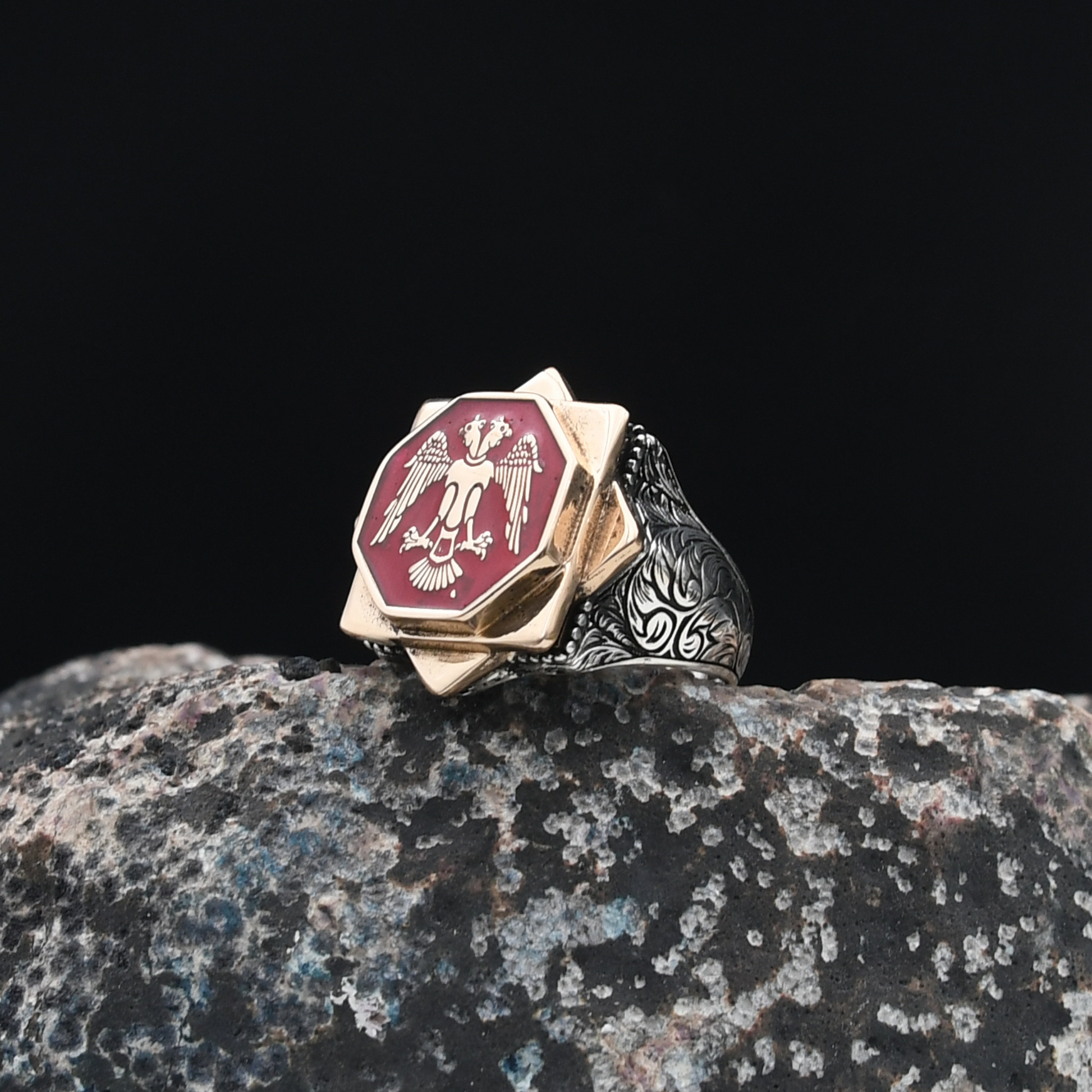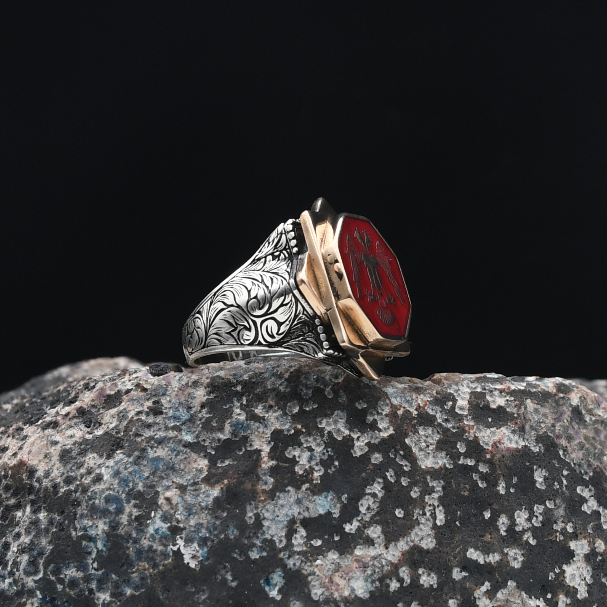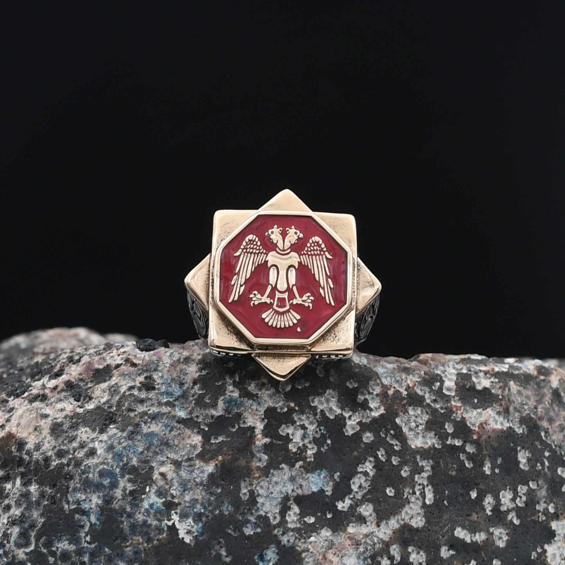 Tarihin güçlü simgelerinden biri olan Selçuklu Kartalı 🦅, bu yüzükte ustalıkla işlenerek erkek stiline tarihi bir anlam ve asil bir duruş katıyor. Çift başlı kartal, gücü, iktidarı ve bilgeliği temsil ederken yüzüğün detaylı işçiliği ile şıklığı bir araya getiriyor. Kendine güvenen, geçmişin güçlü mirasını günümüze taşımak isteyen erkekler için tasarlandı.