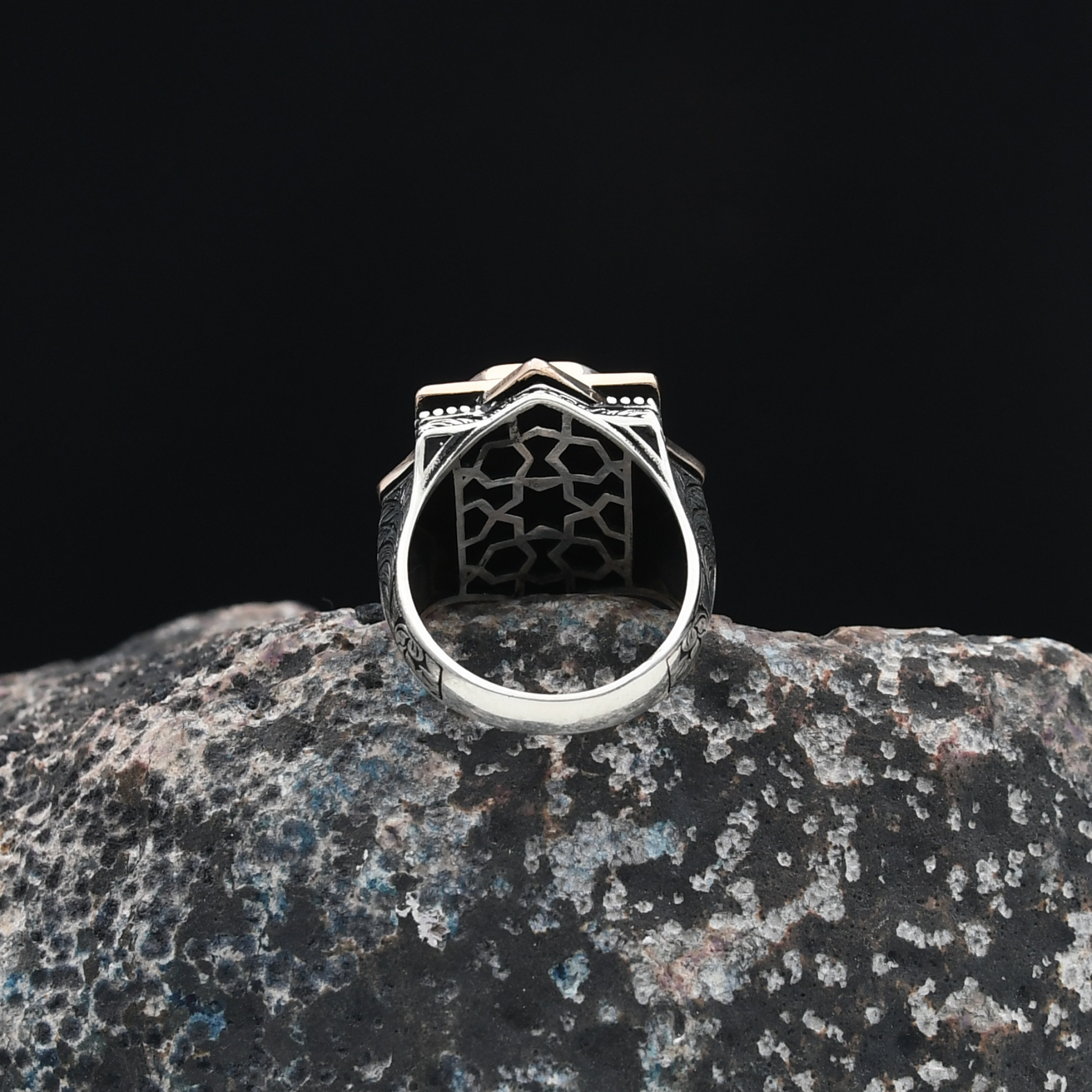 ⚖️ 14 gram ağırlığında ve 925 ayar saf gümüş 🪙 kalitesiyle üretilen bu yüzük, hafifliği ve sağlamlığıyla günlük kullanımda rahatlık sunar. Usta işçilikle işlenmiş detayları sayesinde göz alıcı bir tasarıma sahiptir ve güçlü duruşunuzun altını çizer.
