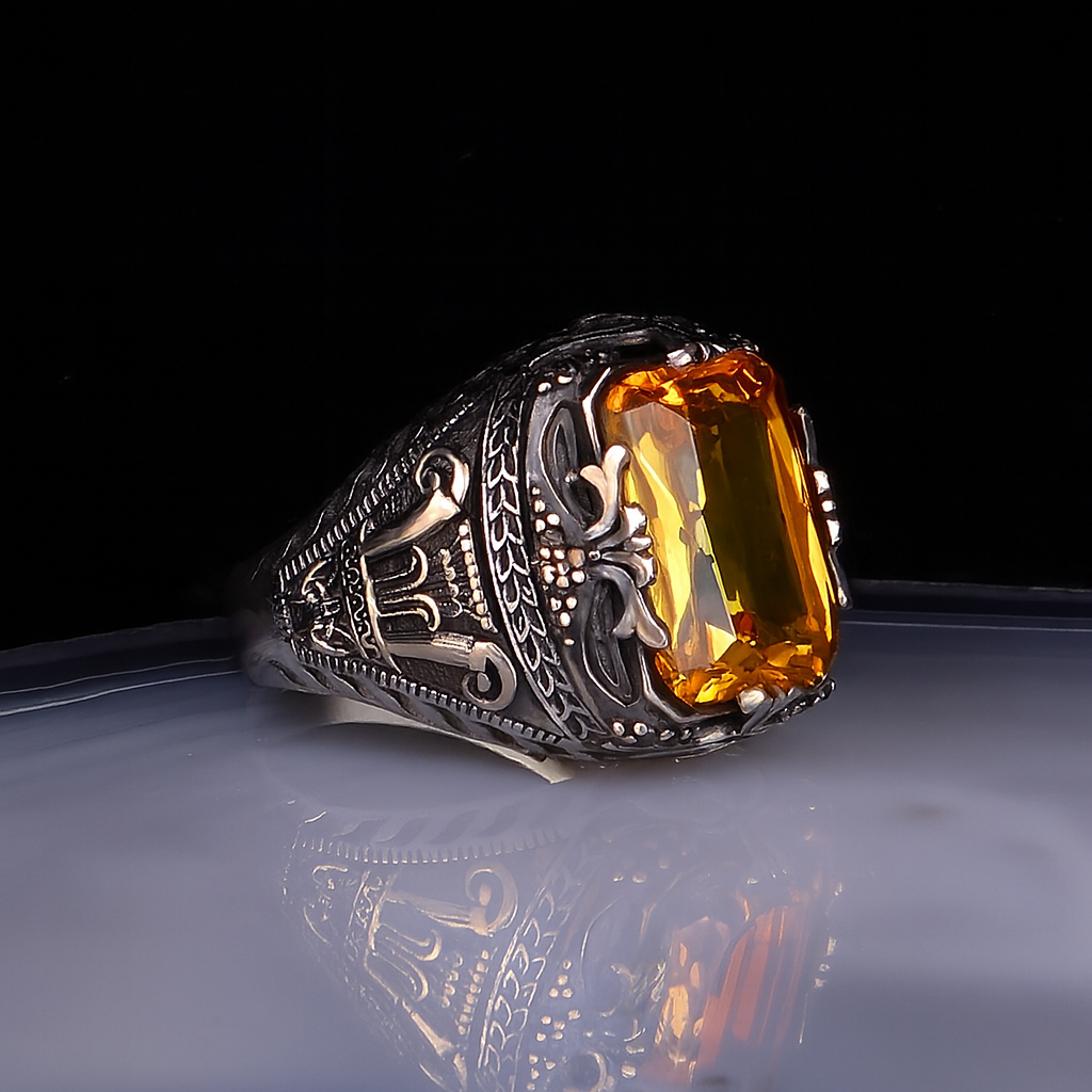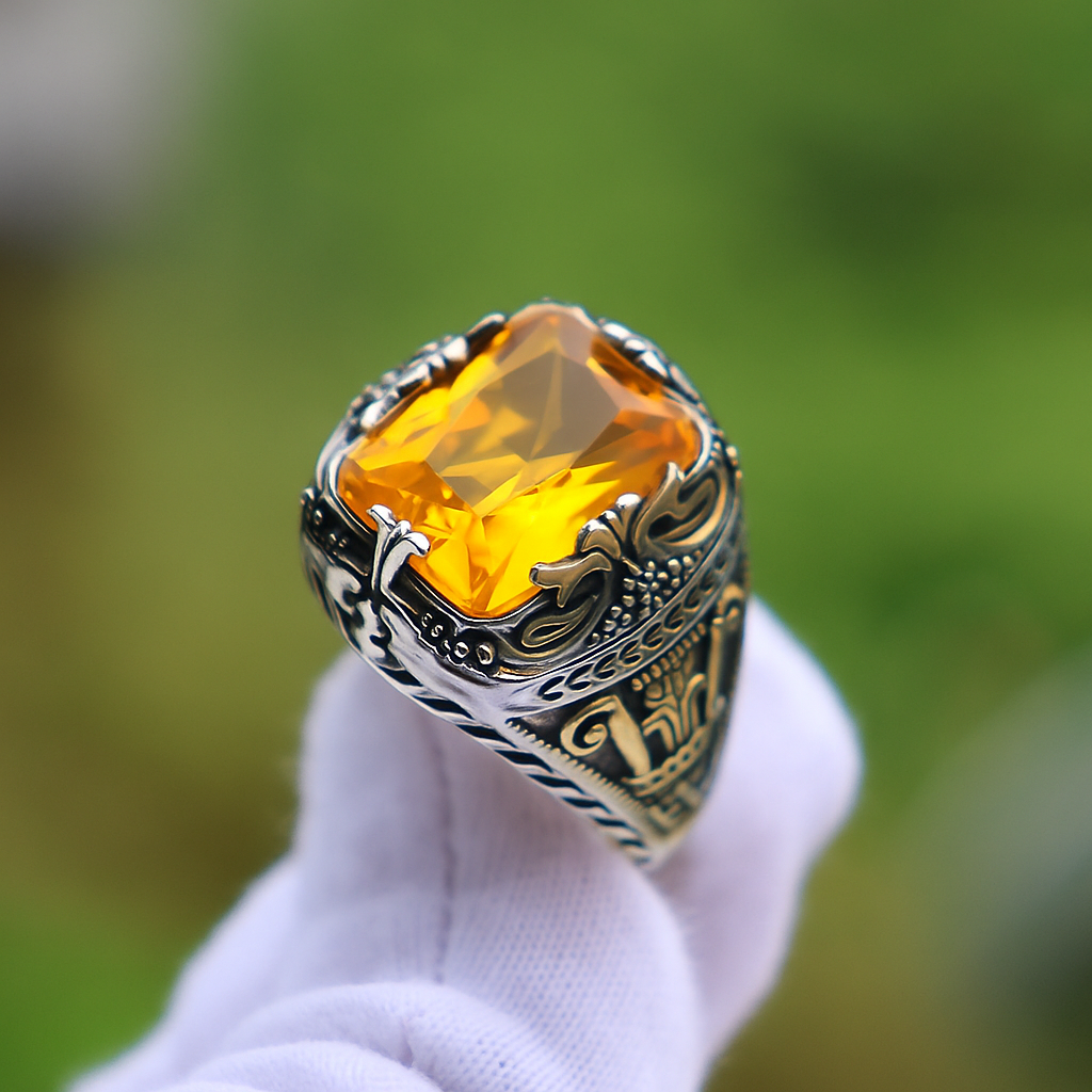 Saf ve zarif görünümüyle öne çıkan sitrin taşı, 925 ayar gümüşle birleşerek sade ama etkileyici bir yüzük tasarımı sunar. Yaklaşık 17 gram ağırlığındaki bu yüzük, tamamen el işçiliğiyle hazırlanmıştır.