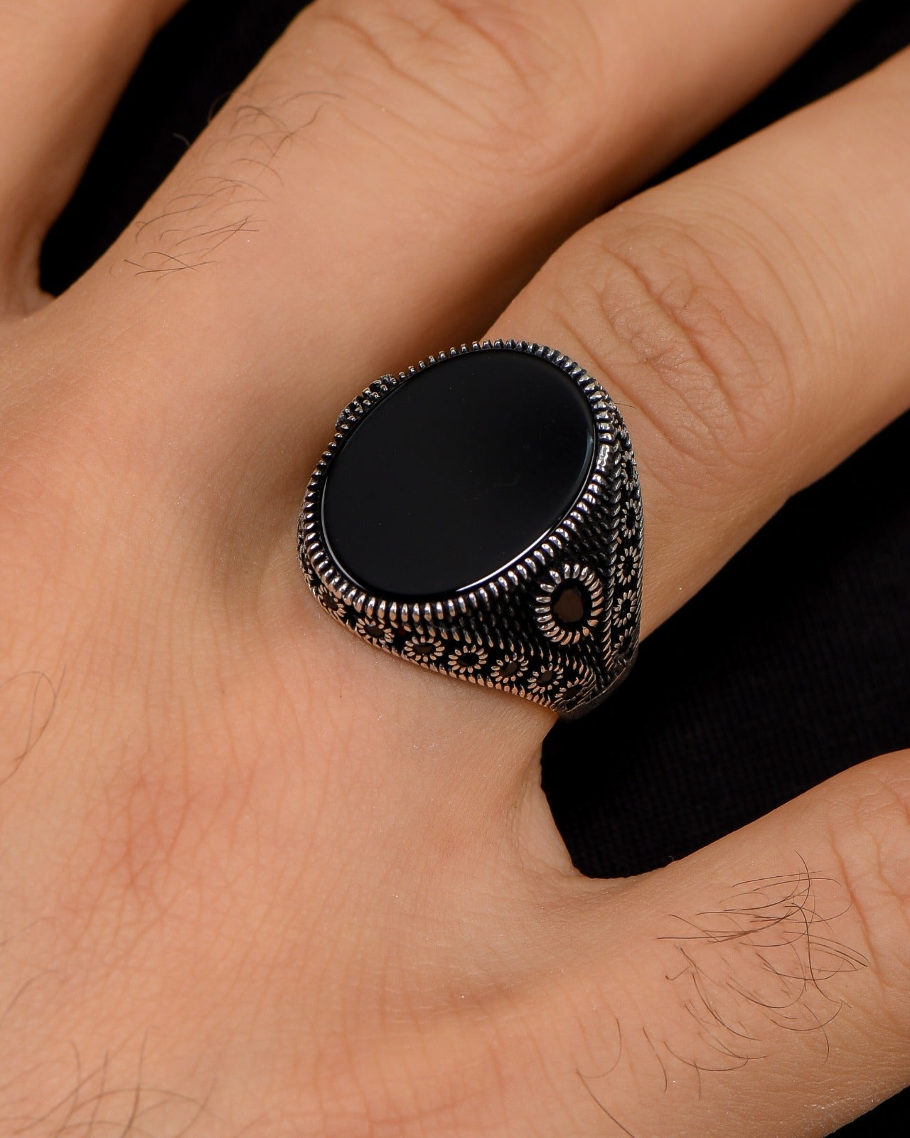 - Siyah oniks taşı, yüzüğe derinlik ve şıklık katıyor.