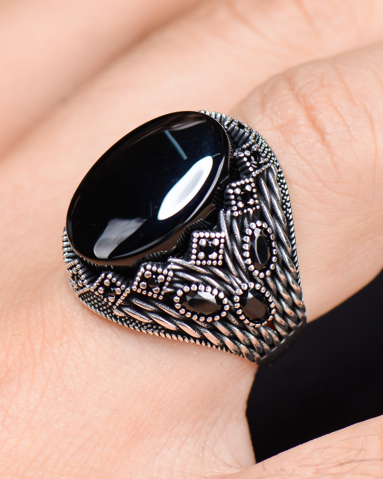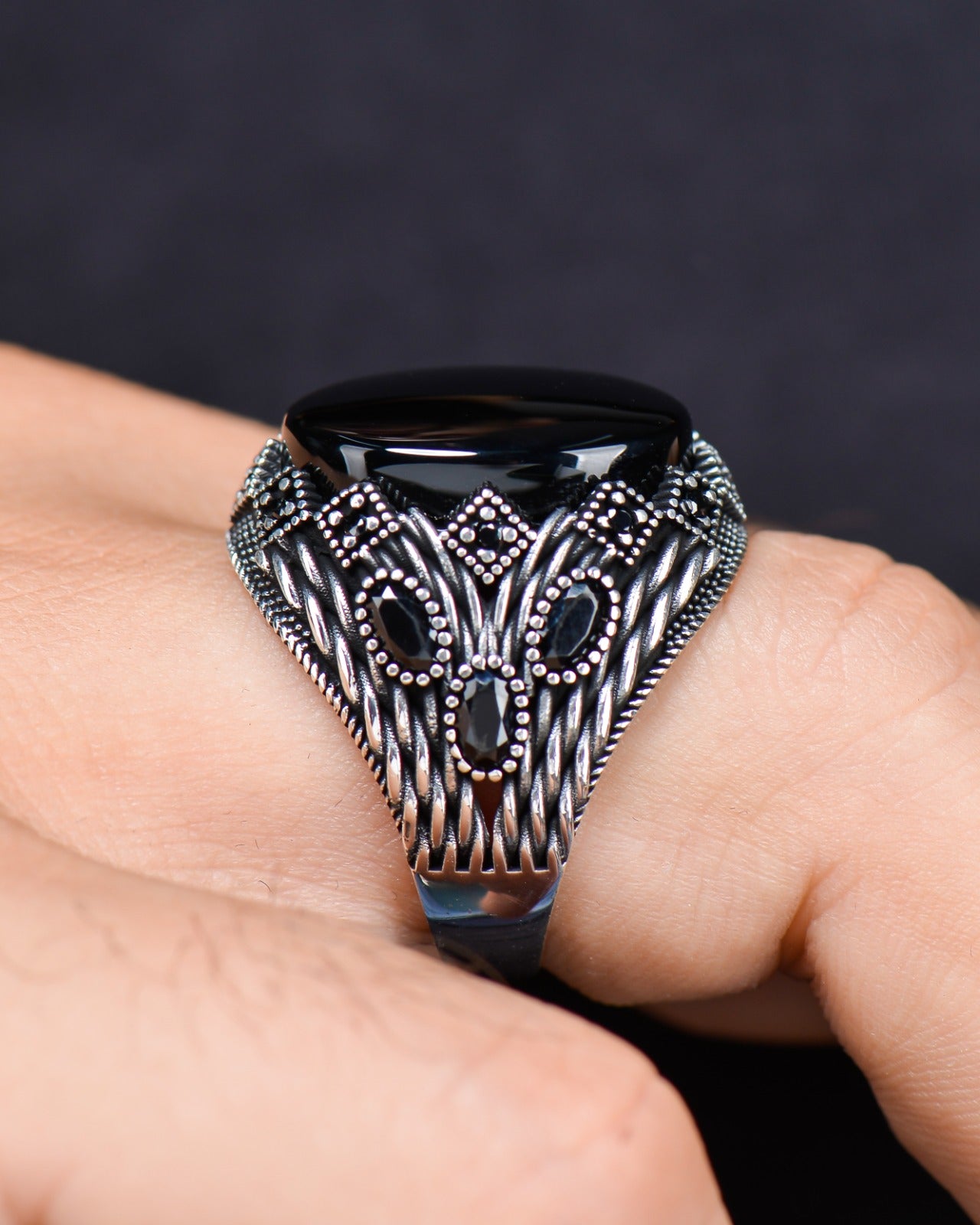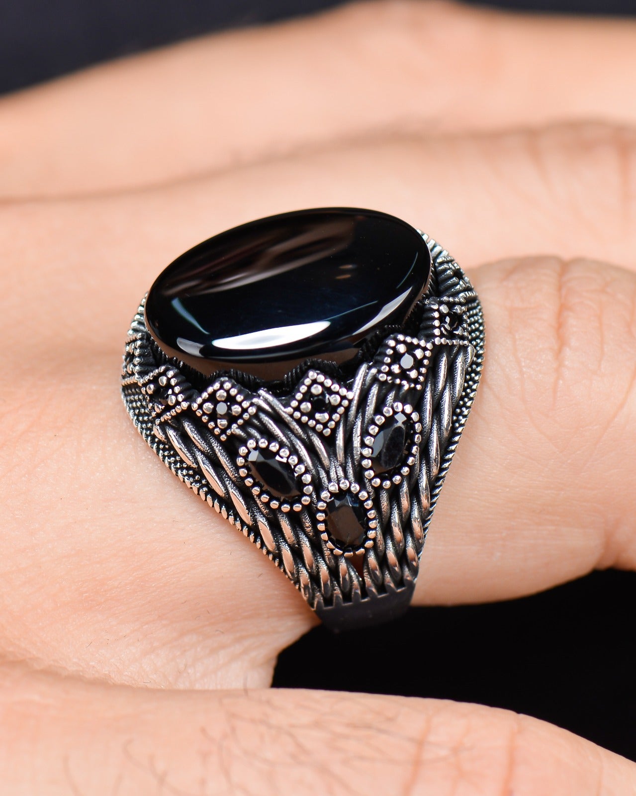 - Siyah oniks taşı, yüzüğe derinlik ve şıklık katıyor.