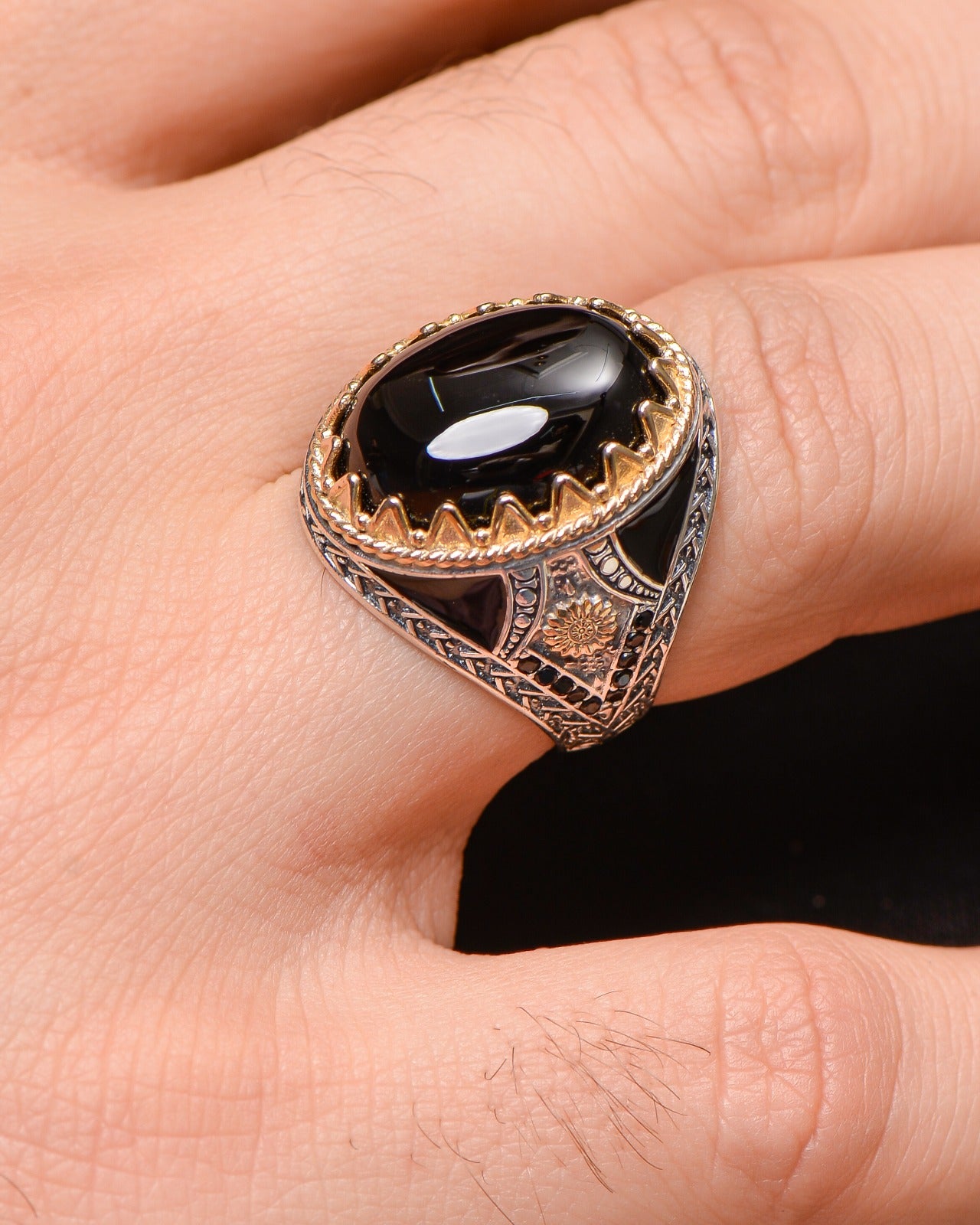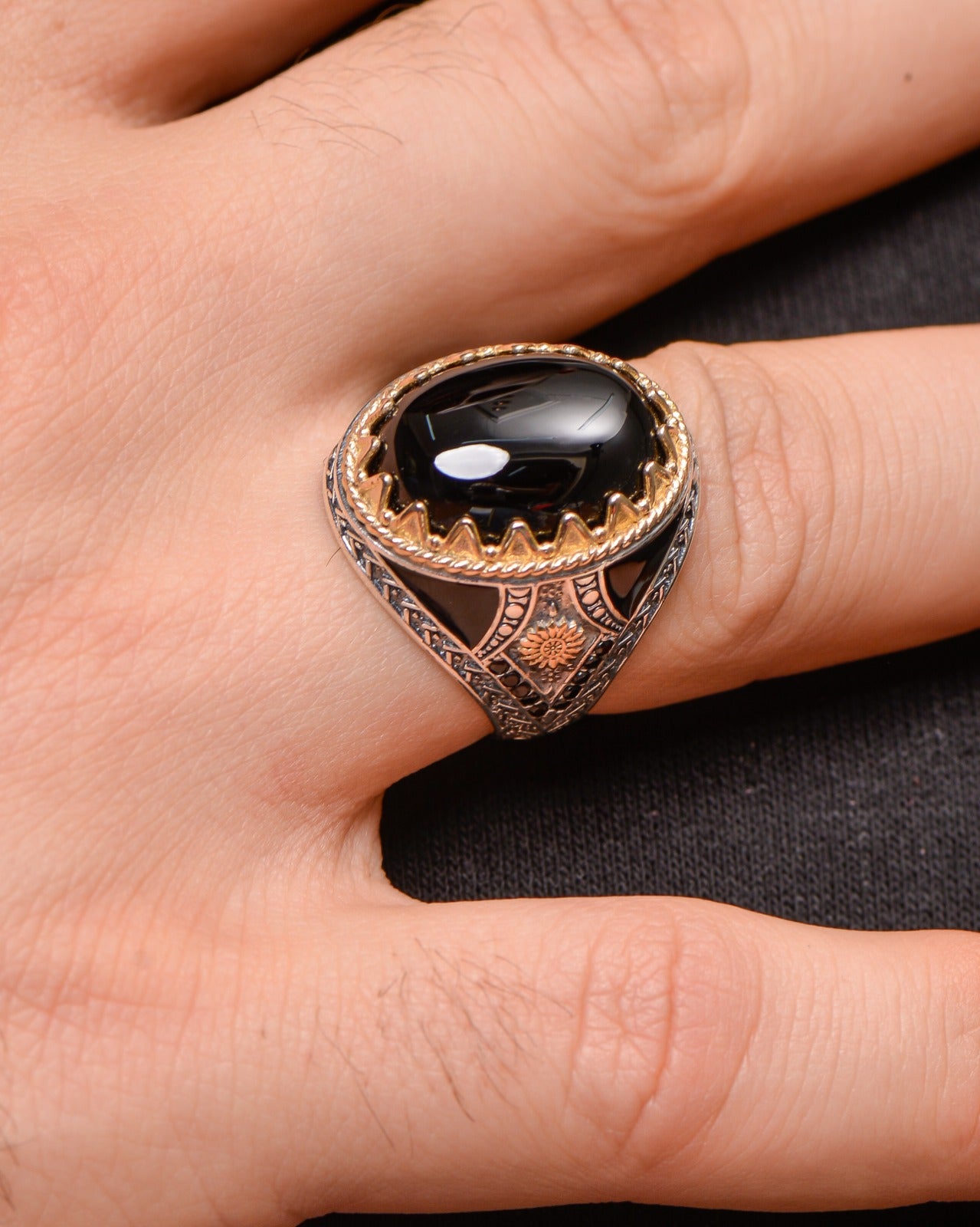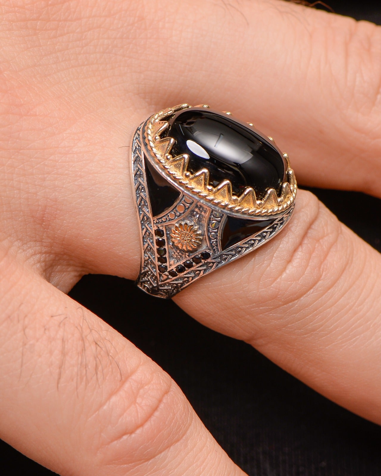 Zarafetin ve asaletin sembolü olan siyah oniks taşıyla tasarlanan bu yüzük, gizemli ve etkileyici duruşuyla dikkatleri üzerine çeker. 🖤 925 ayar gümüşten üretilmiş olan bu yüzük, kaliteli işçiliği ve dayanıklılığıyla uzun ömürlü bir aksesuardır. Siyah oniksin güçlü enerjisini taşıyan bu yüzük, tarzınıza sofistike bir dokunuş katmak isteyenler için idealdir. 💍