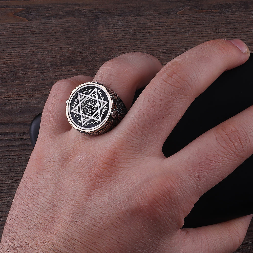 Süleyman Mührü, tarih boyunca önemli bir sembol olmuştur ve bu yüzük, bu sembolü modern tasarım ile birleştirerek benzersiz bir parça sunar. Hemen sipariş verin ve gücün ve anlamın simgesiyle tarzınızı tamamlayın! ✨