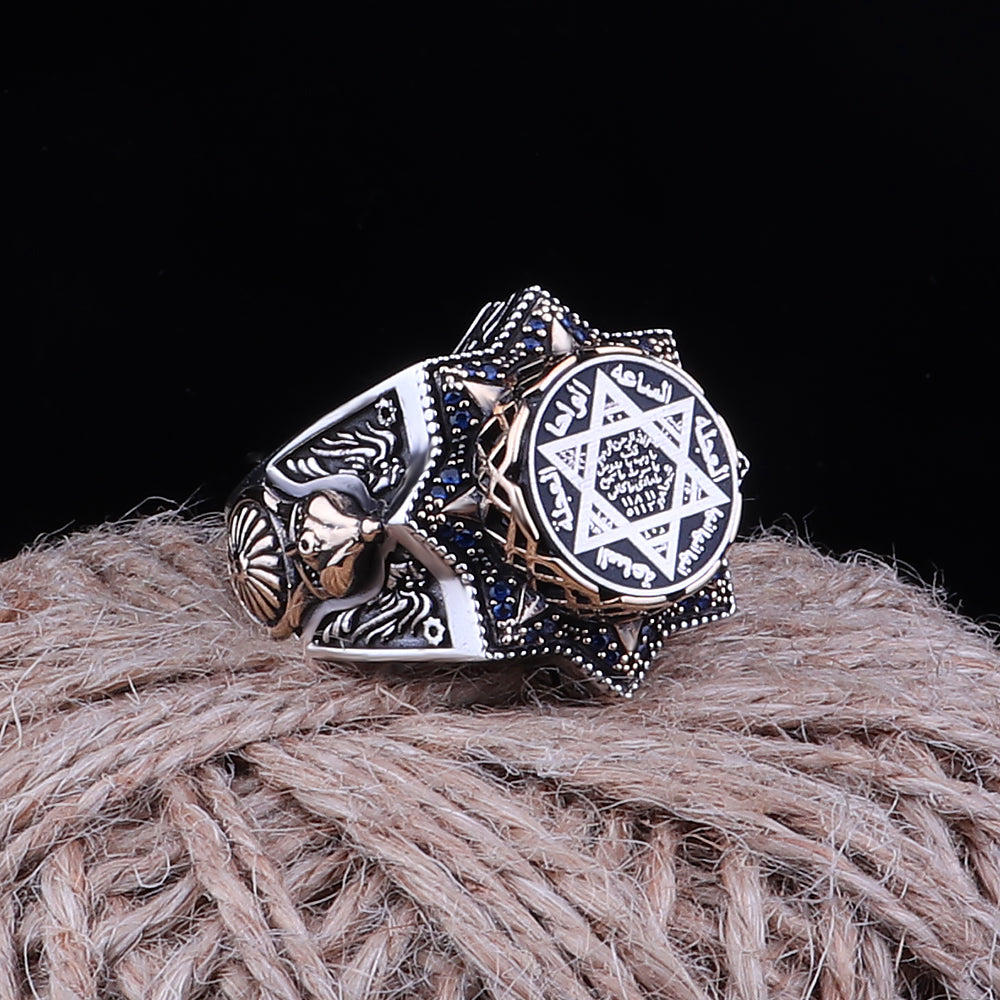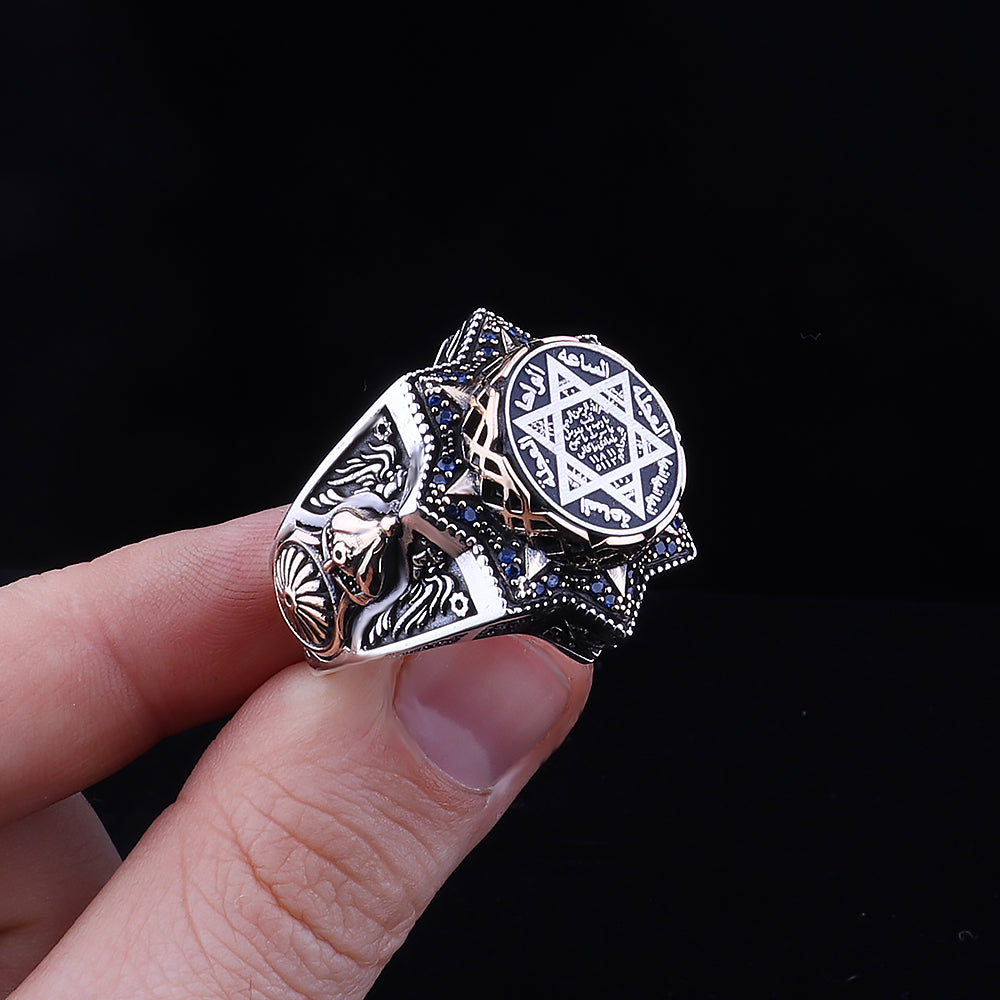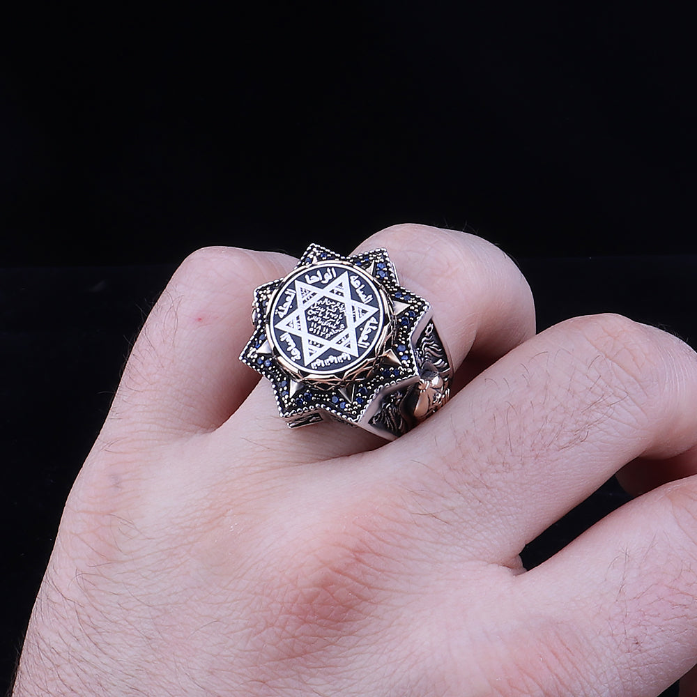 Tarihi ve manevi anlamı derin olan Süleyman Mührü, güçlü bir duruş sergileyen bu özel yüzükle buluşuyor. Yaklaşık 24 gram ağırlığındaki bu model, tamamen el işçiliğiyle titizlikle hazırlanmış ve 925 ayar gümüş kullanılarak üretilmiştir. Detaylı işçiliği ve simgesel anlamıyla hem estetik hem de anlamlı bir parça sunar.