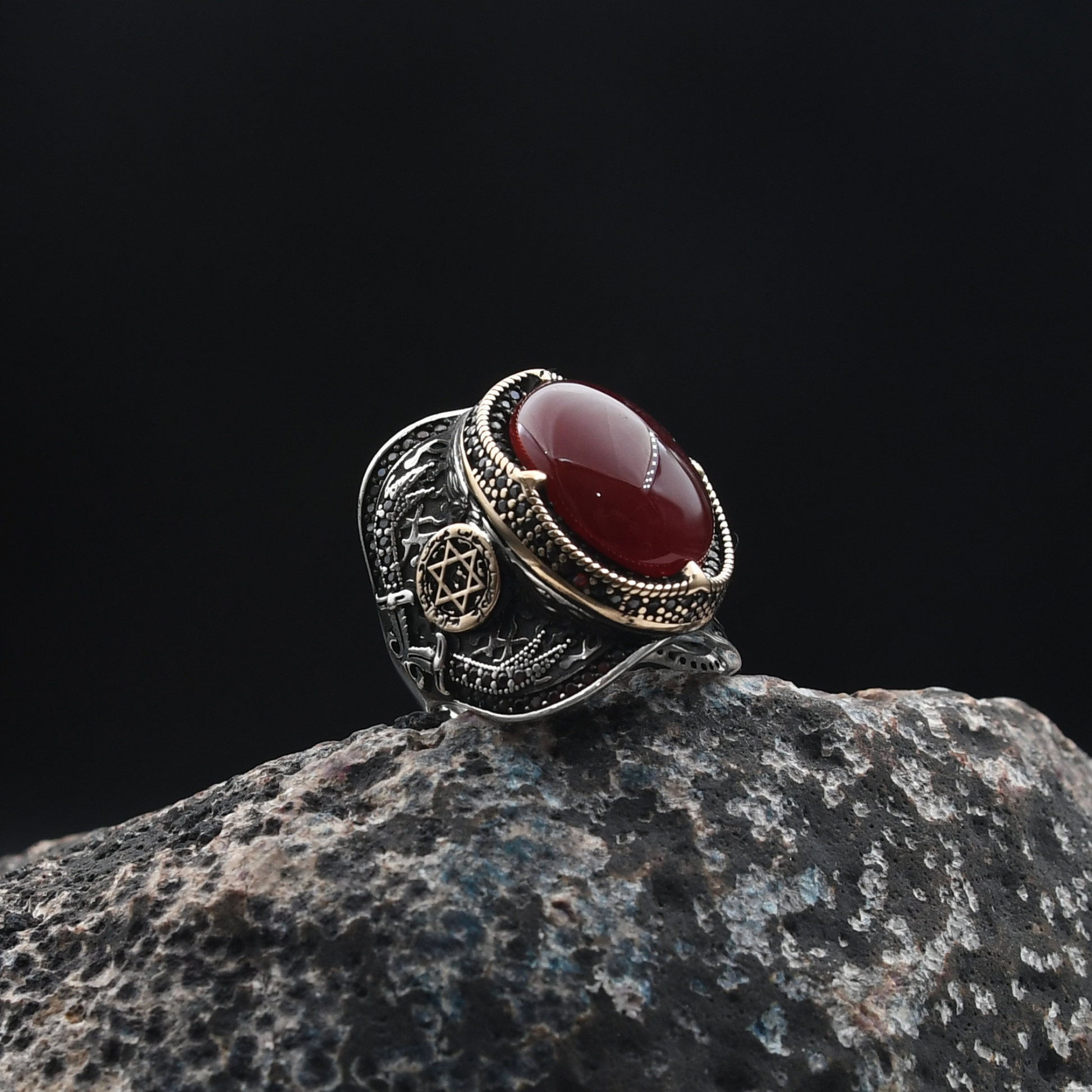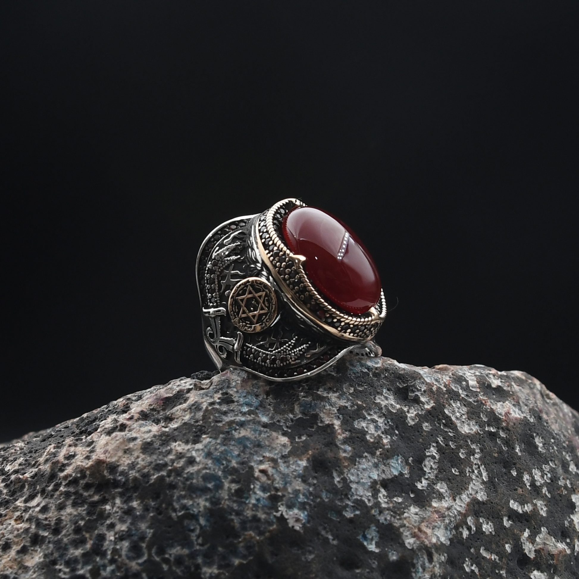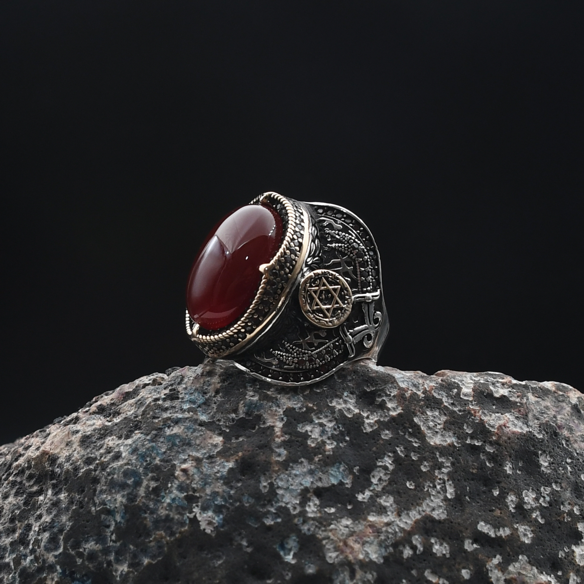 Güç ve mistisizmin simgesi Süleyman mührü, doğal akik taşıyla buluşuyor. Yaklaşık 18 gram ağırlığındaki bu yüzük, 925 ayar gümüşten el işçiliğiyle özenle üretilmiştir. Her detayında tarih ve estetik barındıran bu özel parça, stilinize anlam katıyor.