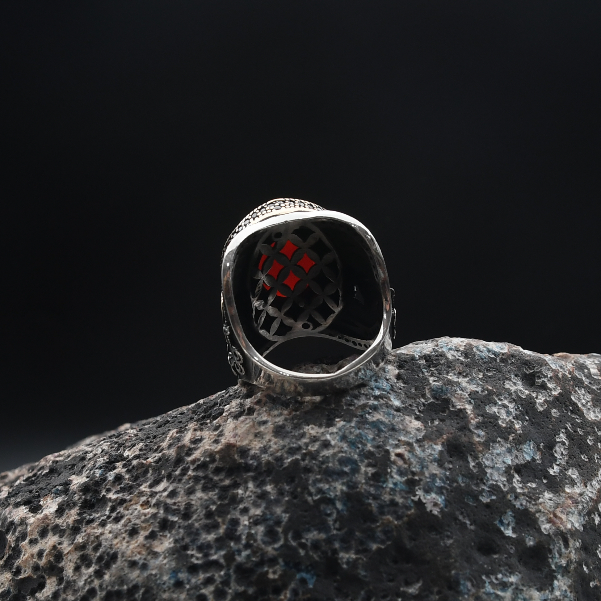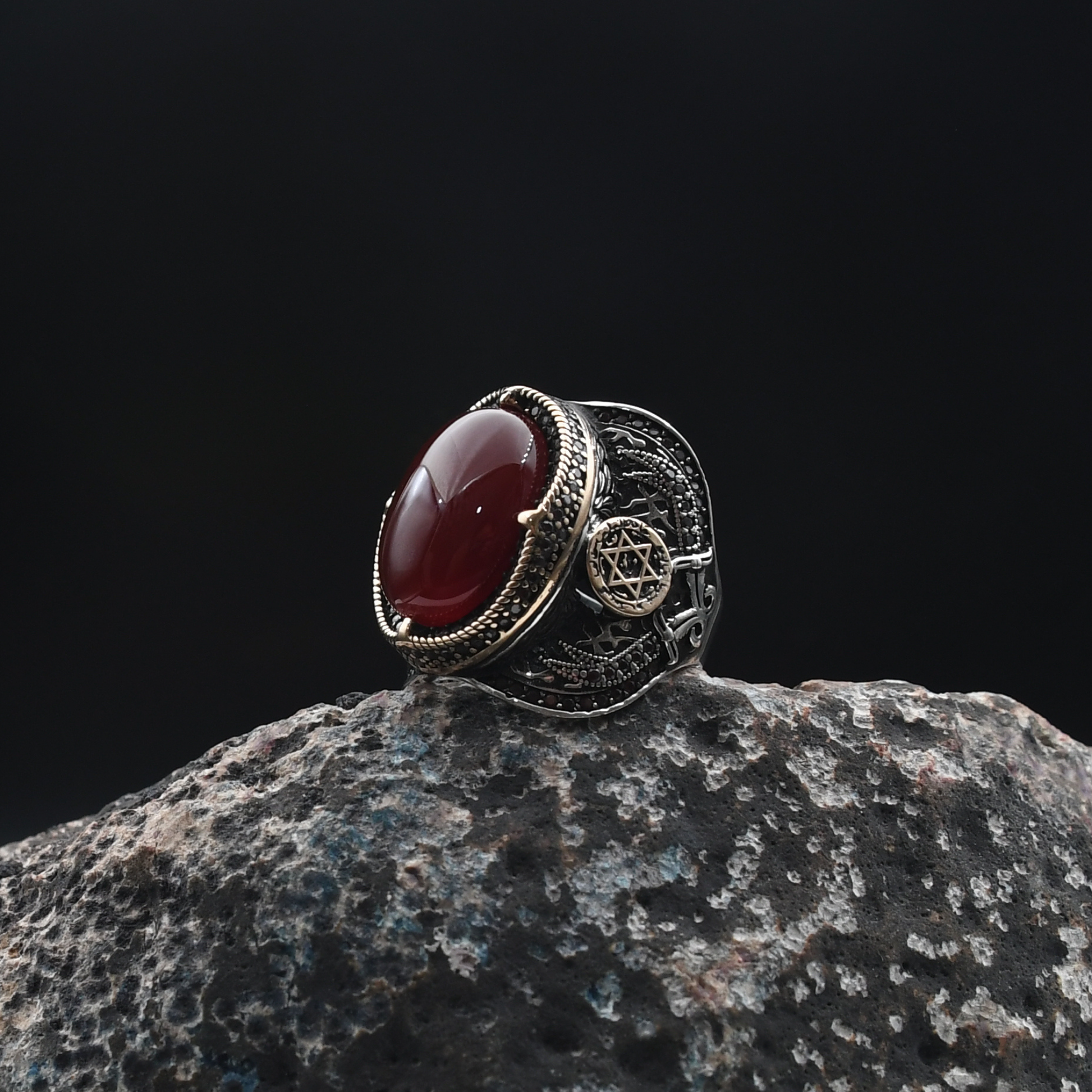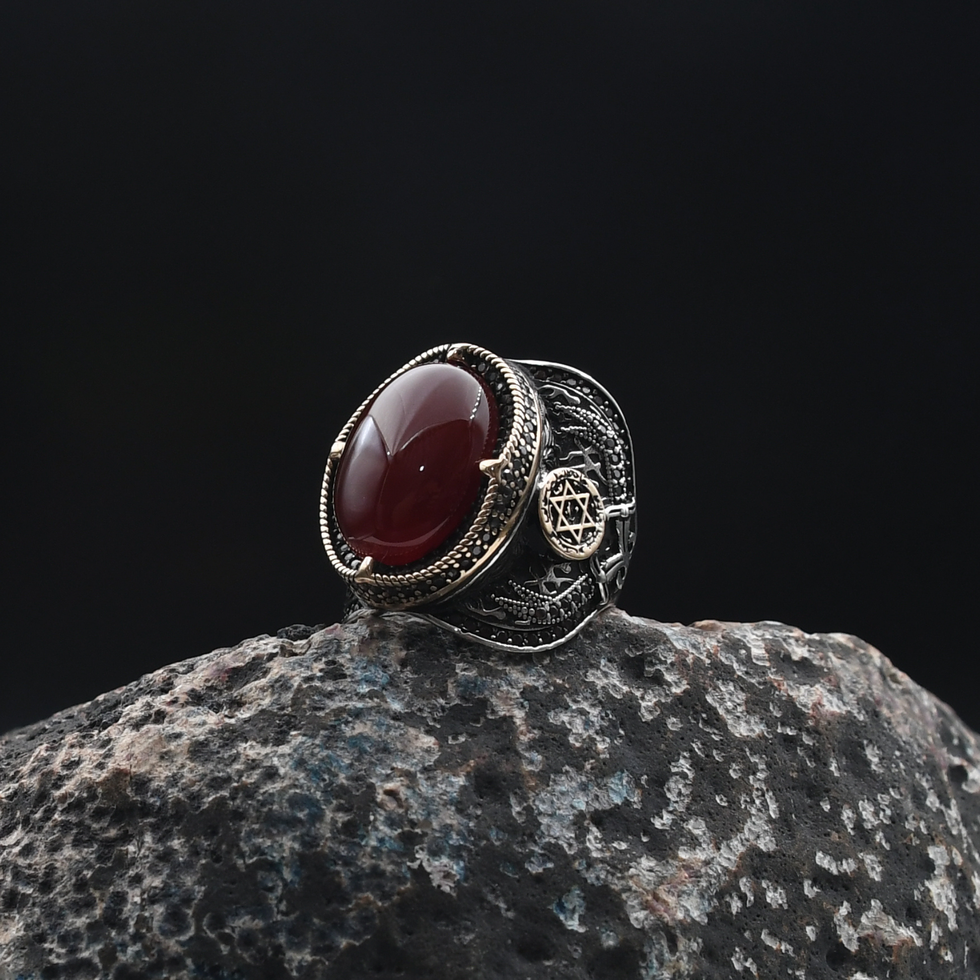 Güç ve mistisizmin simgesi Süleyman mührü, doğal akik taşıyla buluşuyor. Yaklaşık 18 gram ağırlığındaki bu yüzük, 925 ayar gümüşten el işçiliğiyle özenle üretilmiştir. Her detayında tarih ve estetik barındıran bu özel parça, stilinize anlam katıyor.