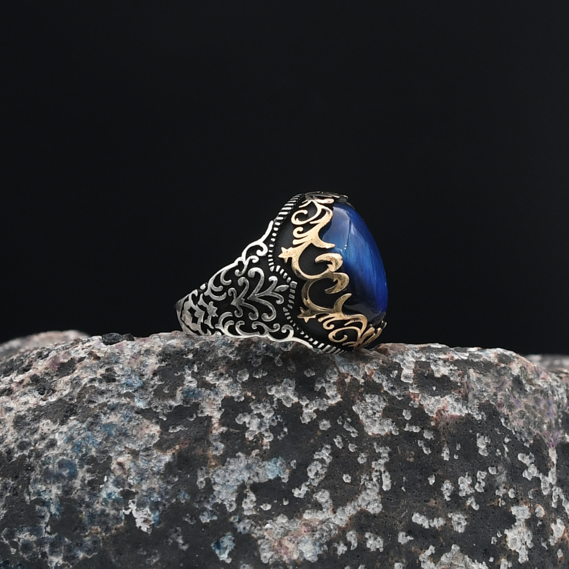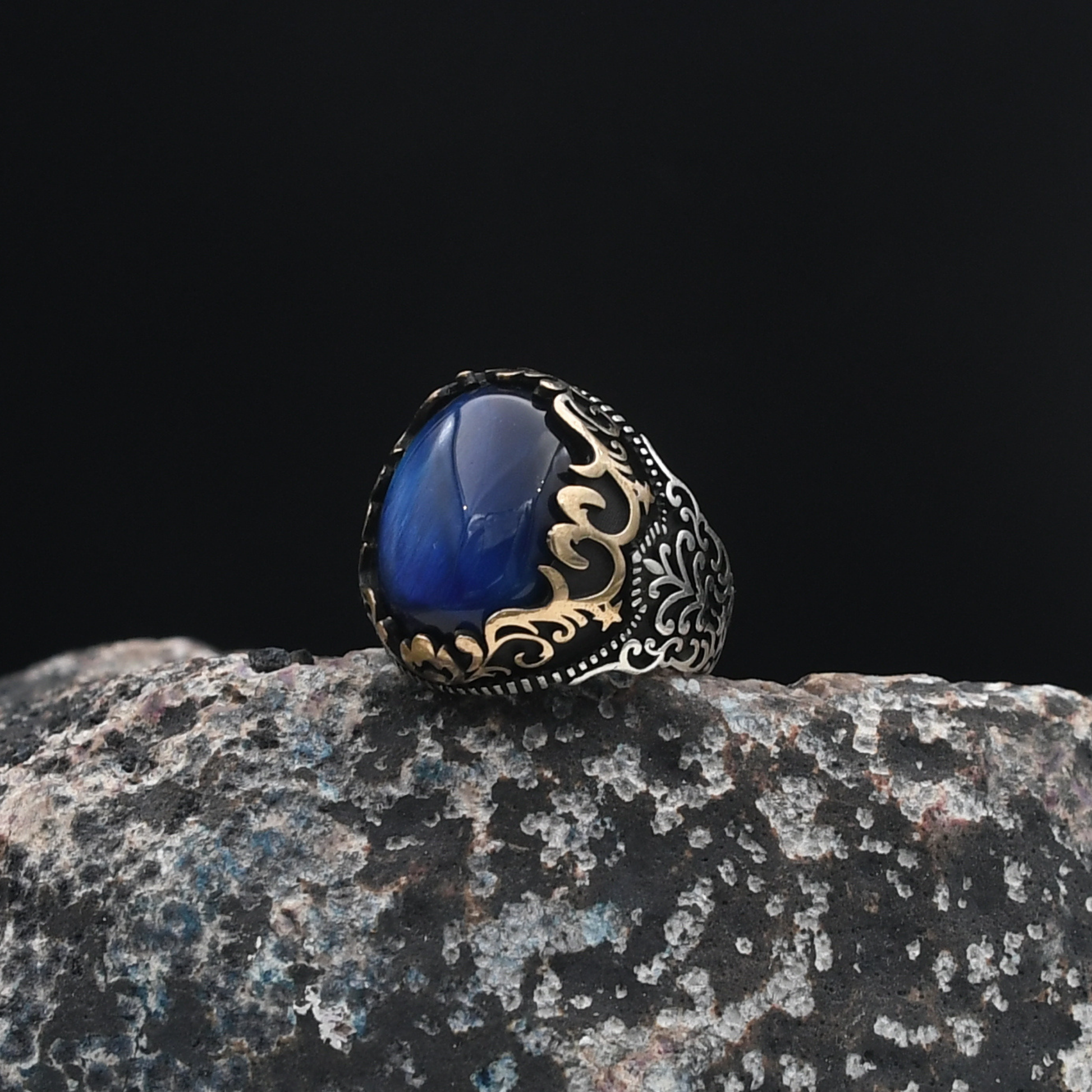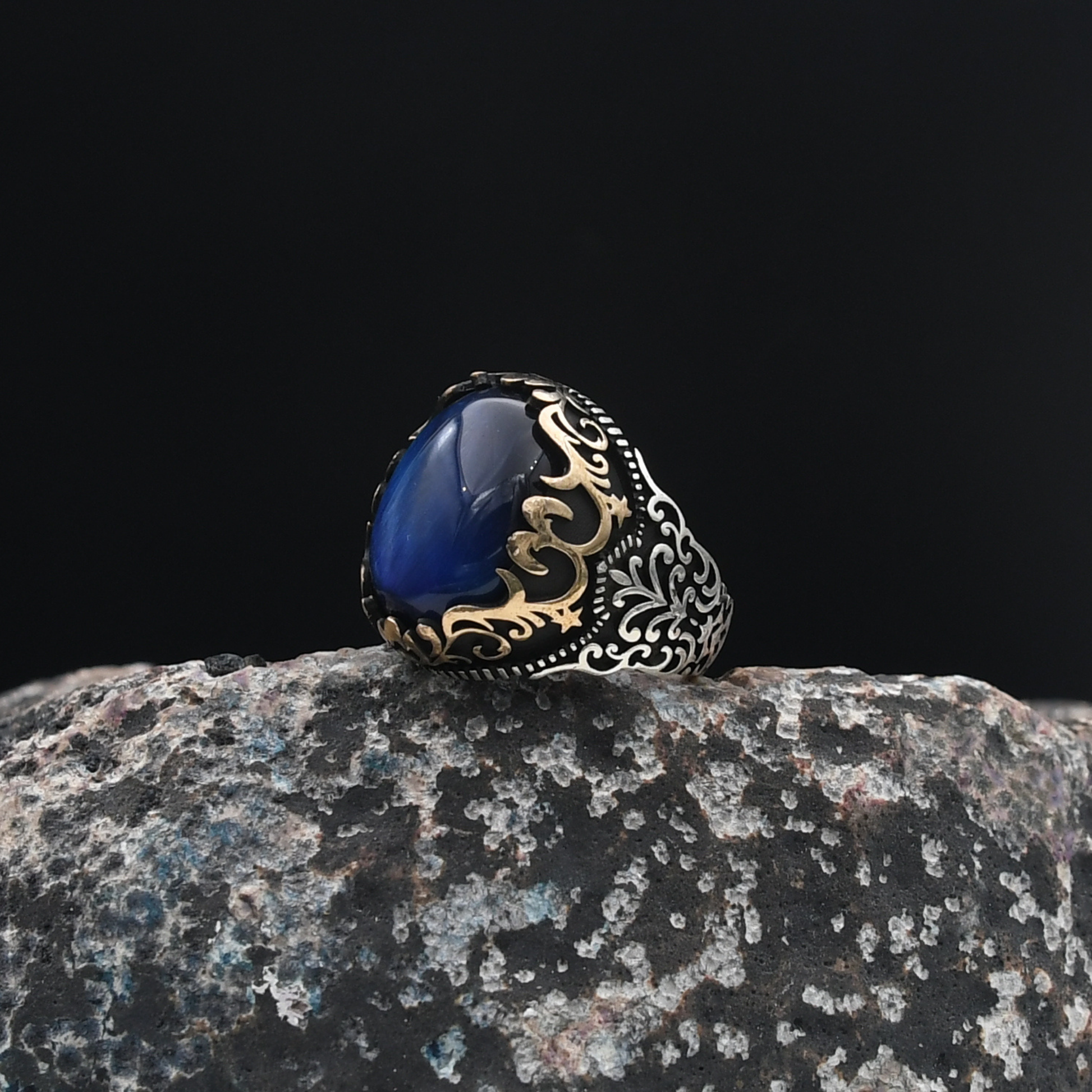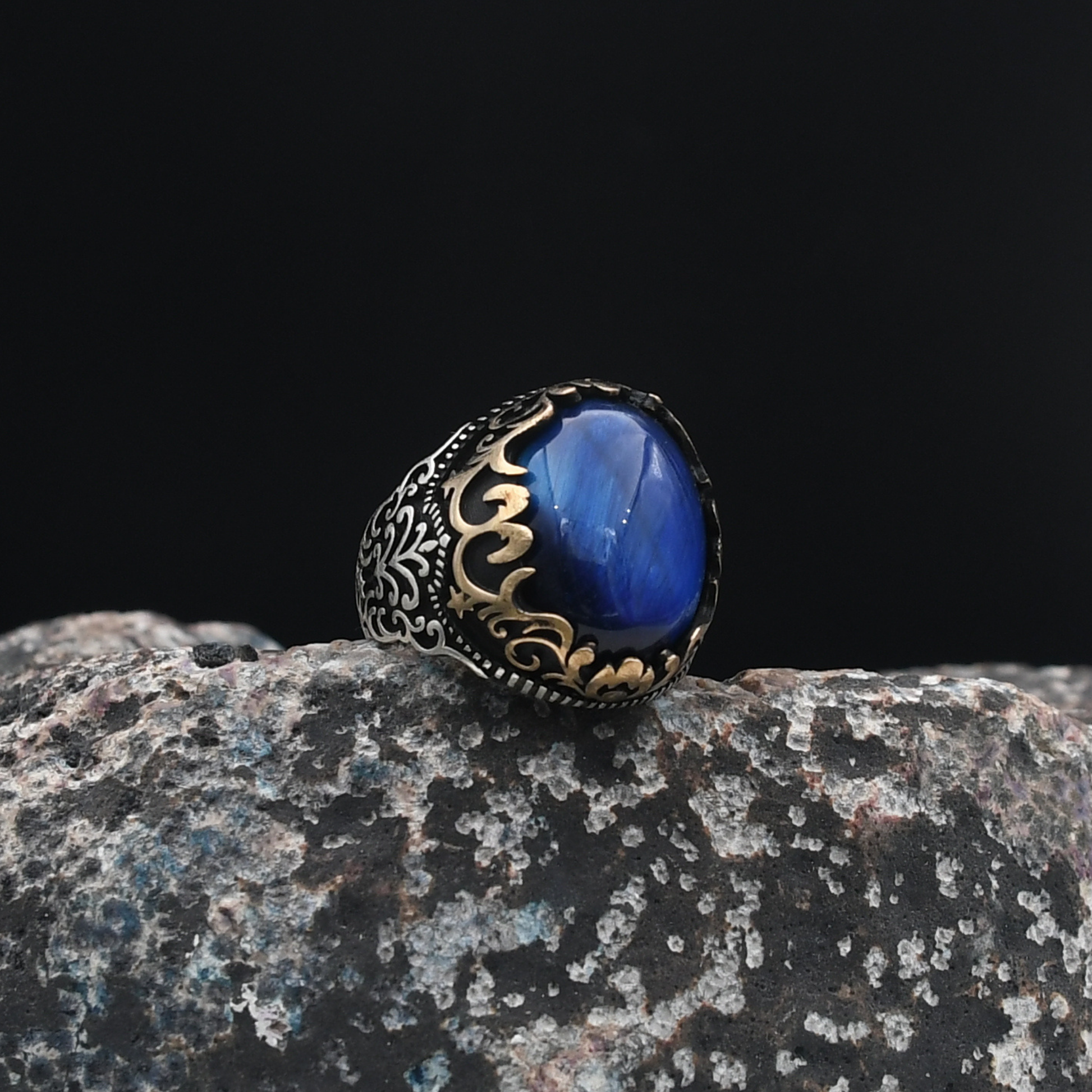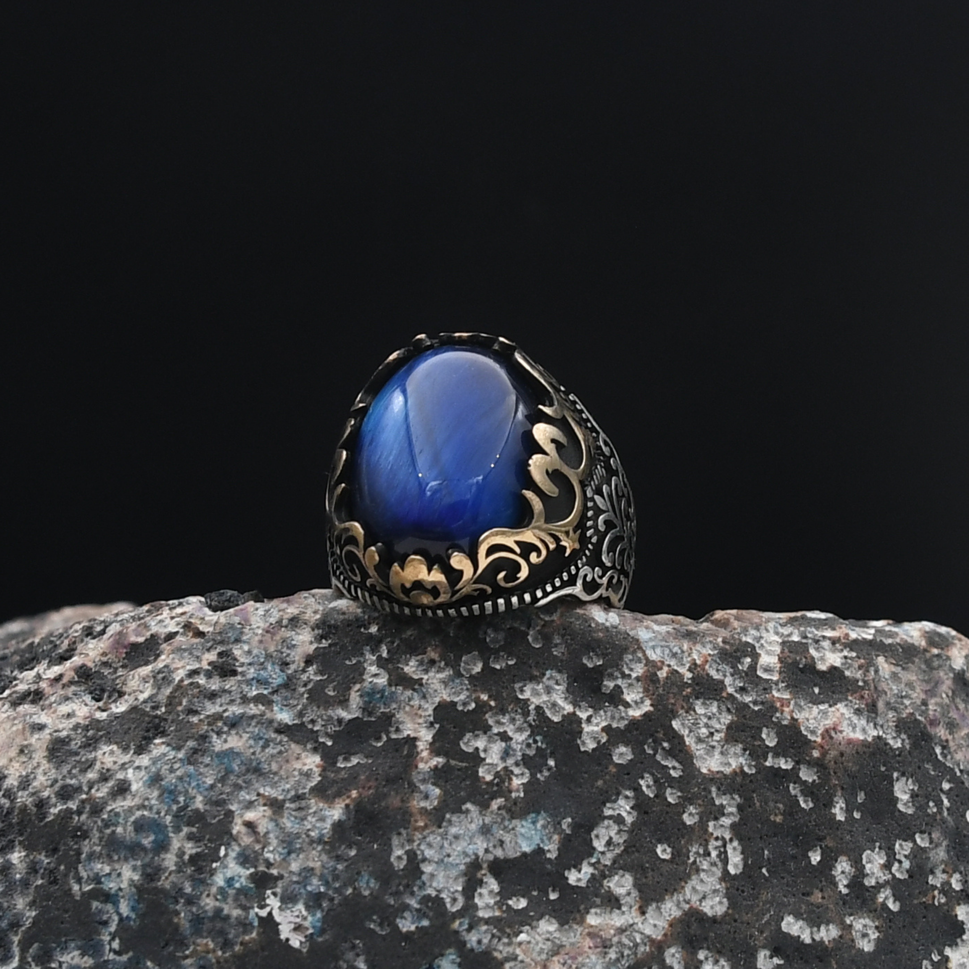 Derin ve büyüleyici bir mavi ışıltıyla sizi kendine çeken mavi kaplan gözü taşı 💙, bu yüzüğün merkezinde göz kamaştırıcı bir duruş sergiliyor. Kaplan gözü, cesaret ve güçlü bir enerji sembolü olarak bilinir. Mavi tonlarının sakinleştirici etkisiyle birleşen bu yüzük, karizmatik bir görünüm sunarken aynı zamanda zarif bir dokunuş sağlar.