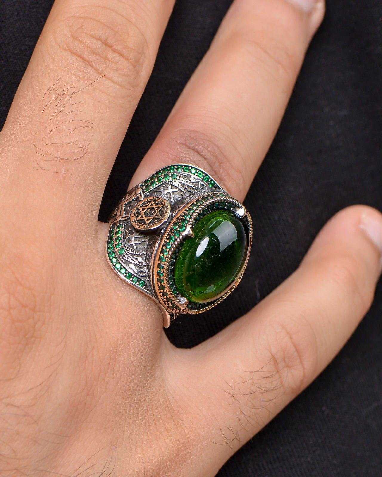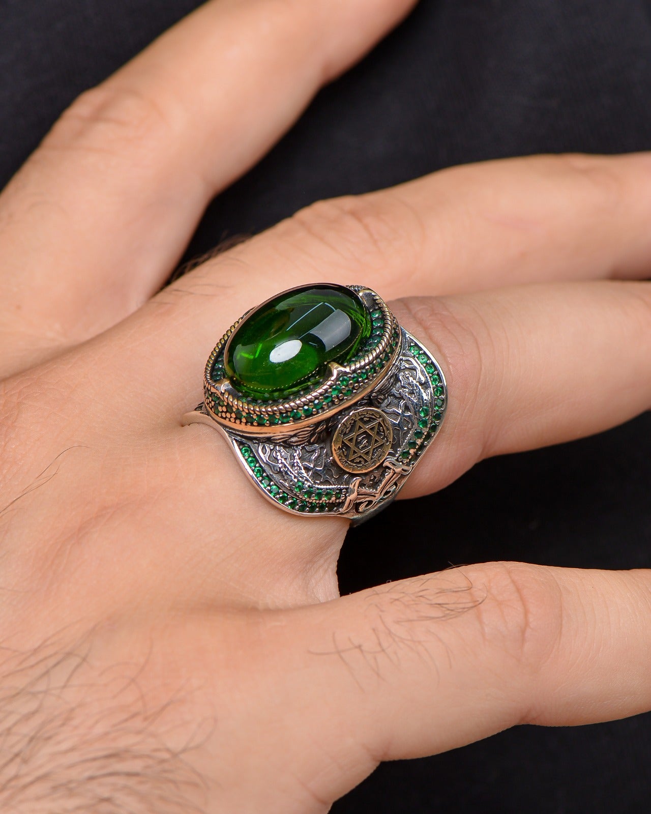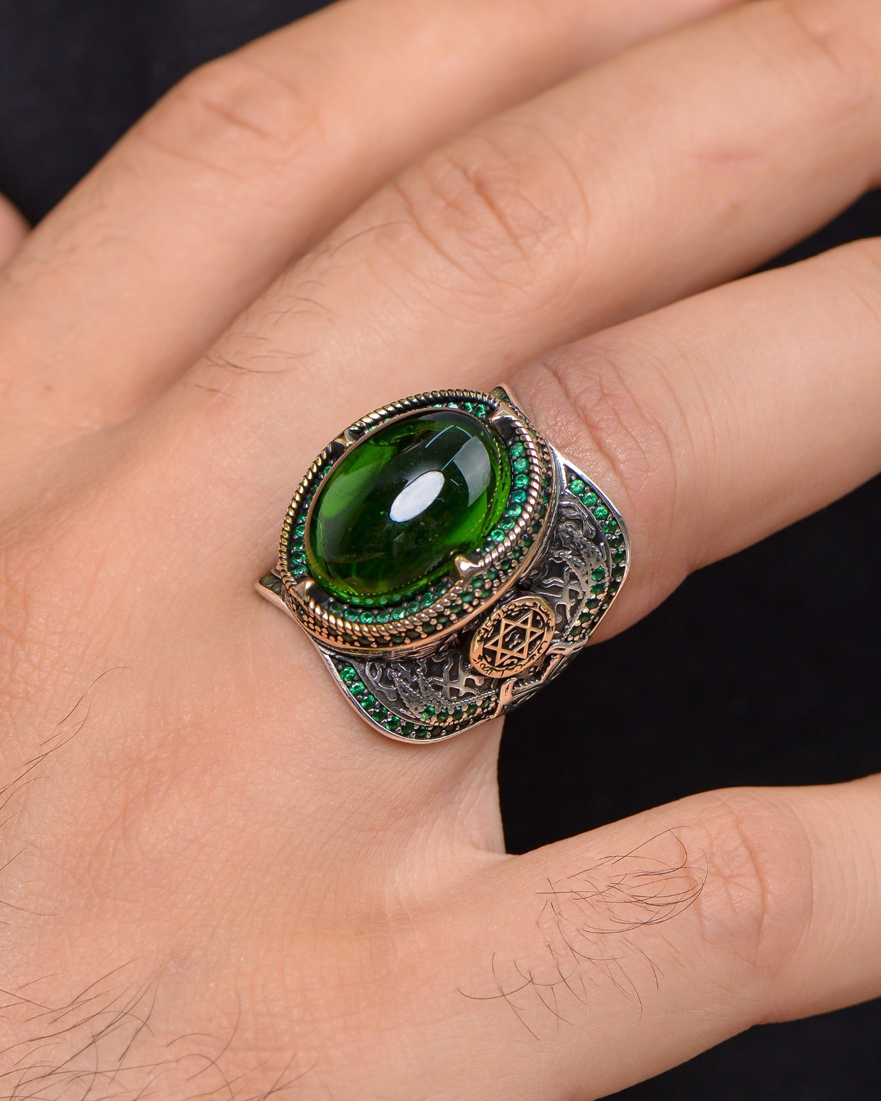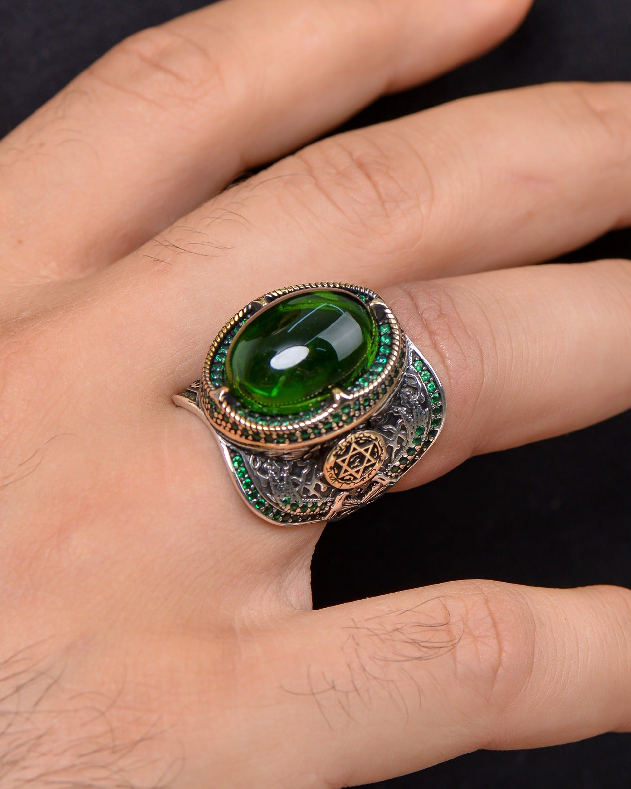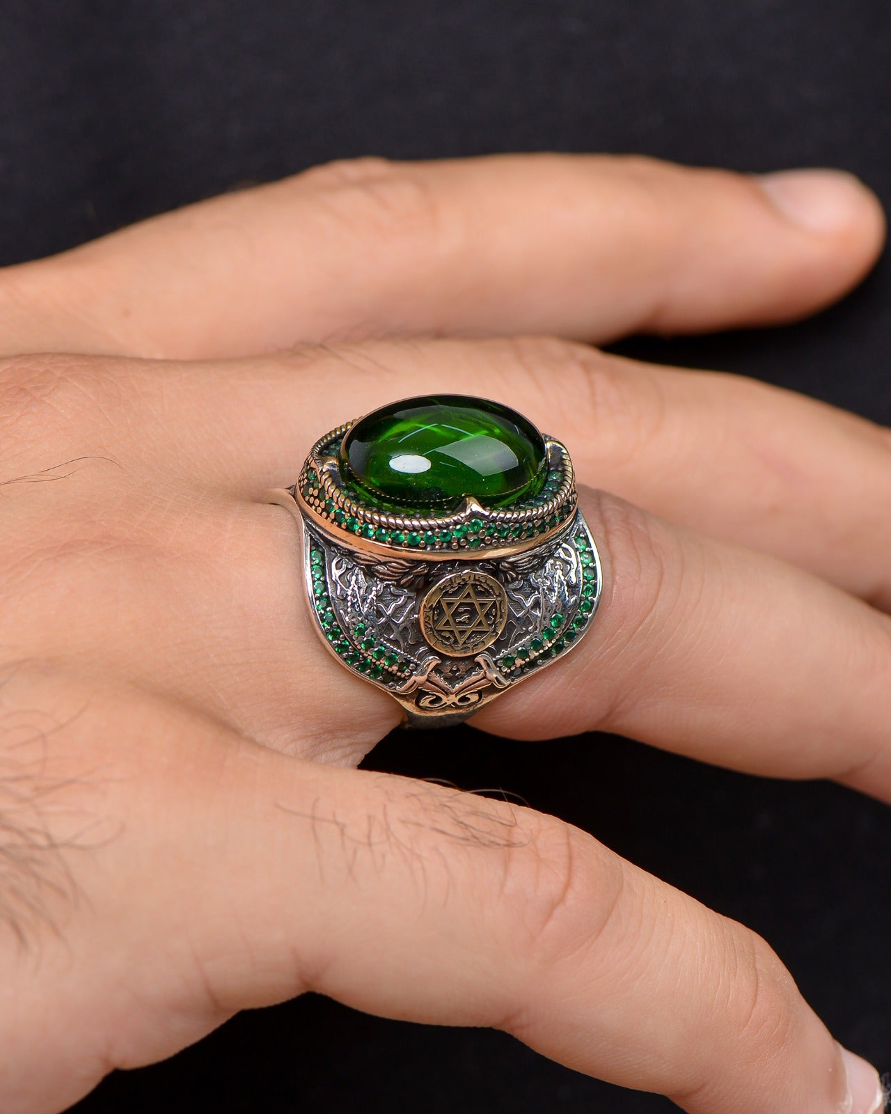 🟢 925 Ayar Gümüş Süleyman Mührü İşlemeli Yeşil Paraiba Taşlı Yüzük (19,5 Gram) 🟢