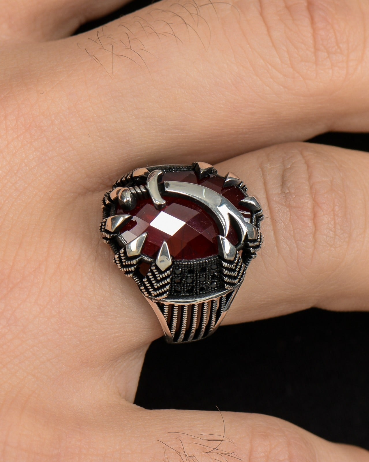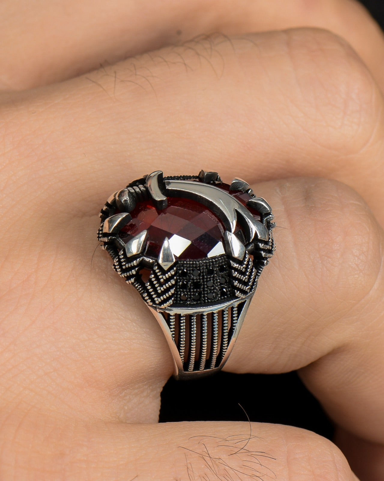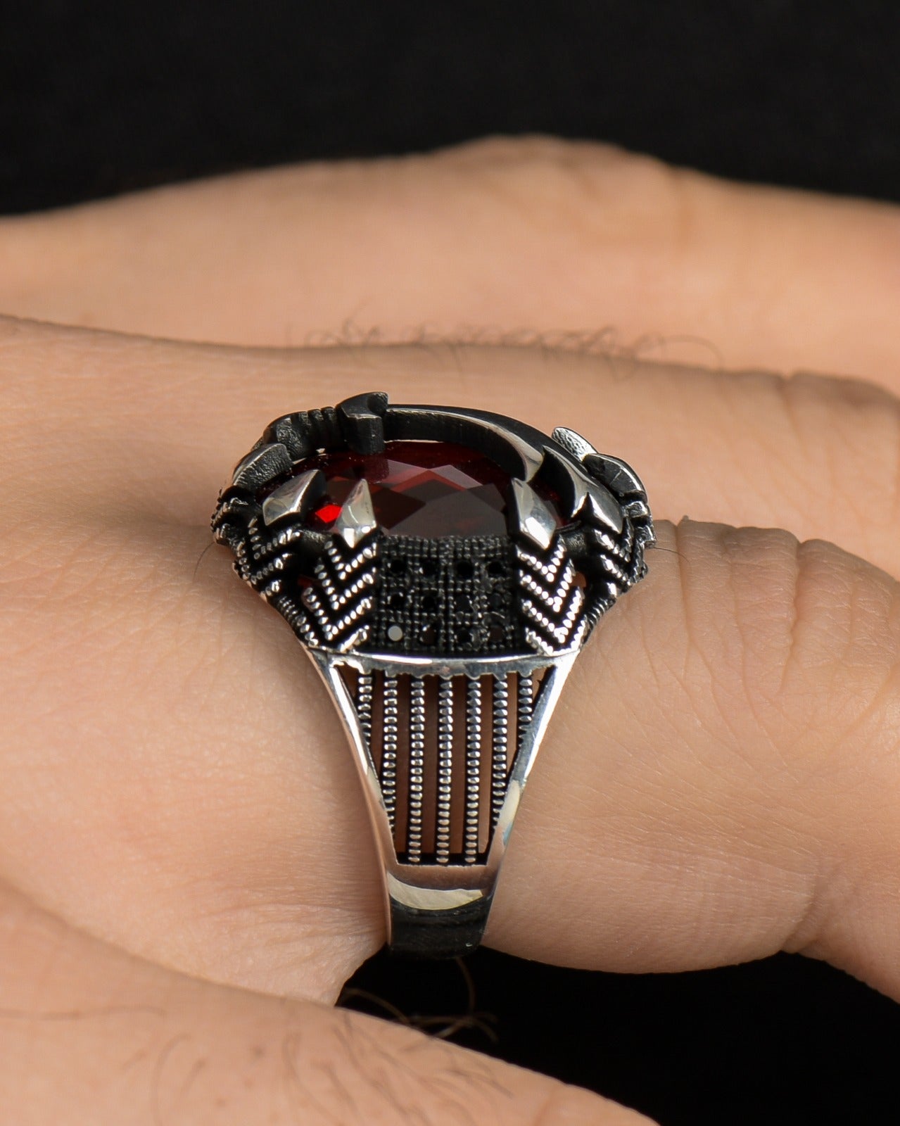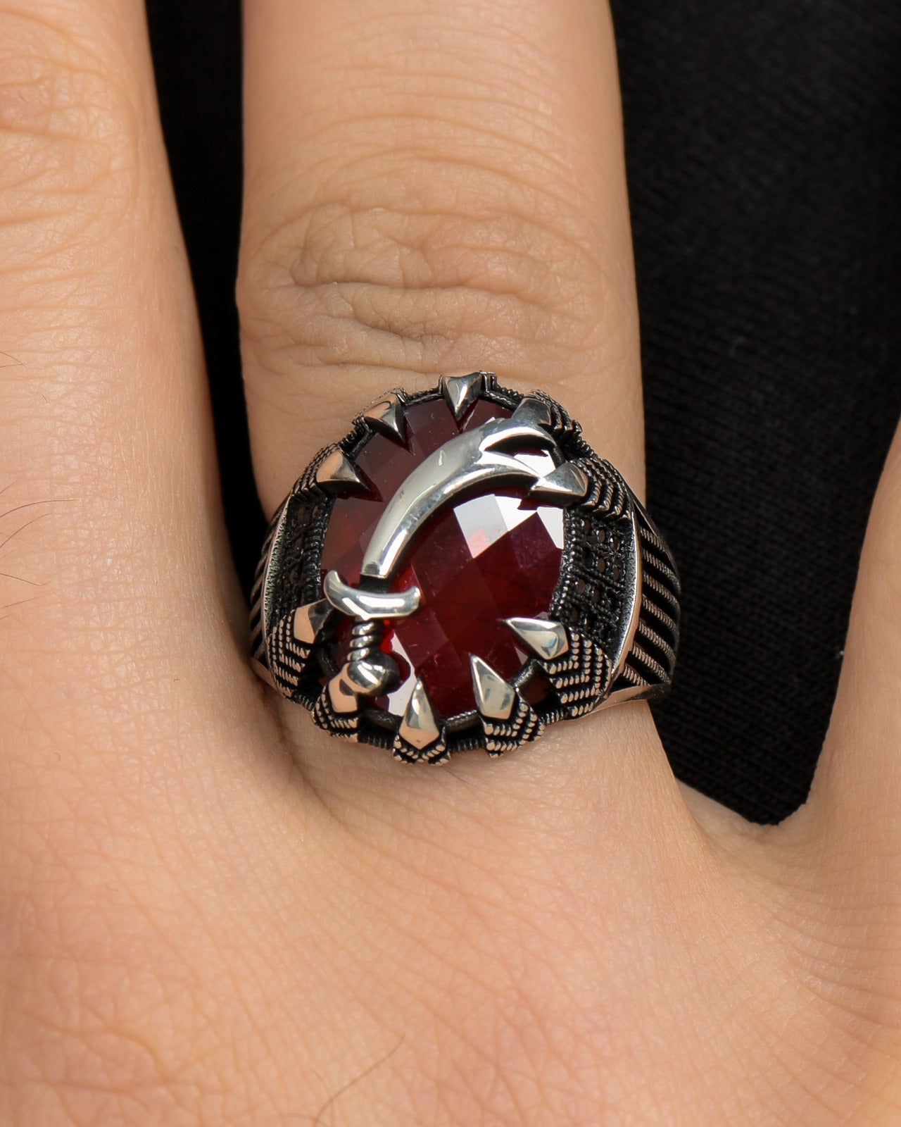 Güç ve tarihle buluşan bu eşsiz erkek yüzük, Zülfikar kılıcı motifinin zarafeti ile kırmızı zirkon taşının etkileyici kombinasyonunu sunar.