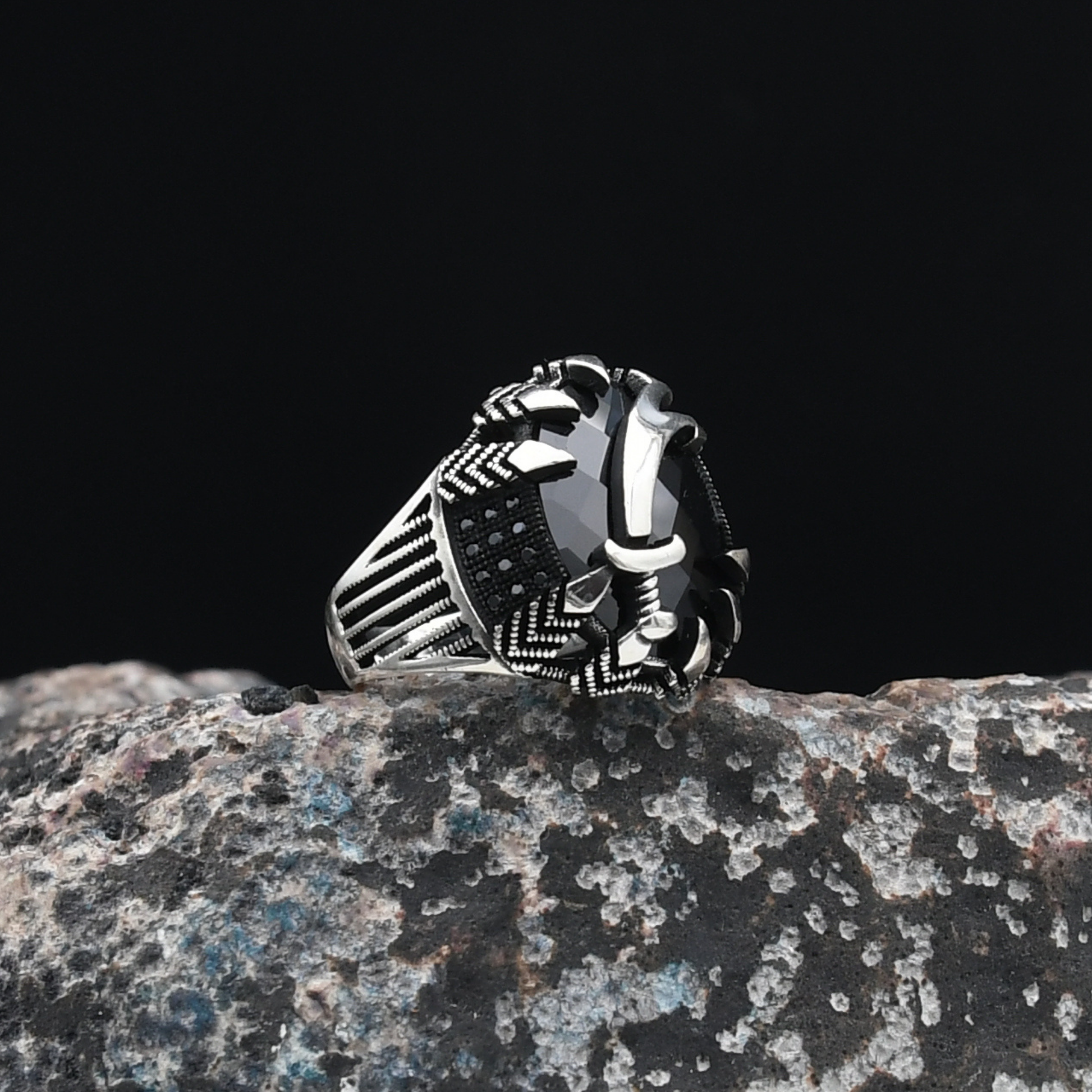 Hz. Ali Zülfikar Figürlü Siyah Zirkon Taşlı 925 Ayar Gümüş Erkek Yüzük – Yüzükçü’nün Manevi Güç Sembolü
