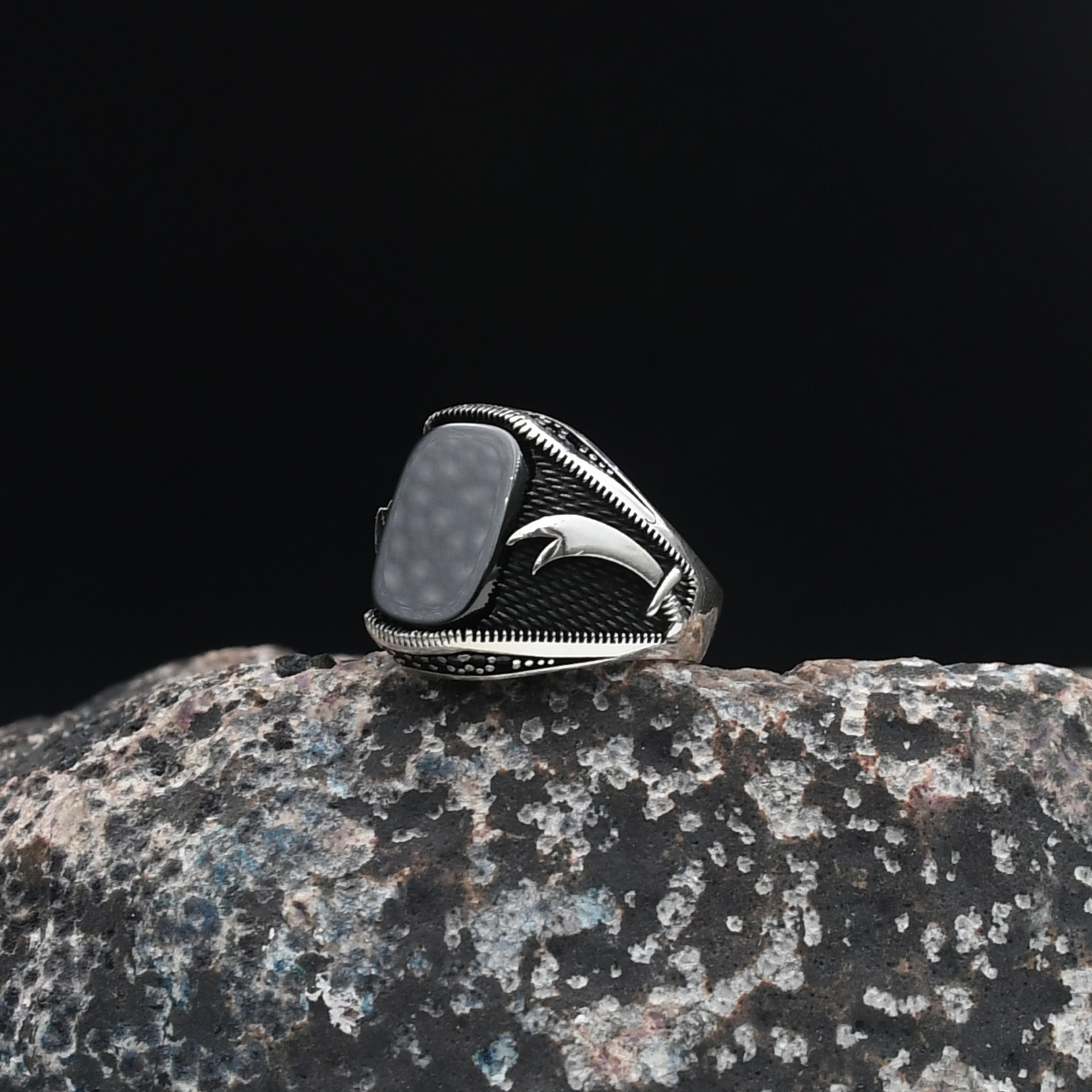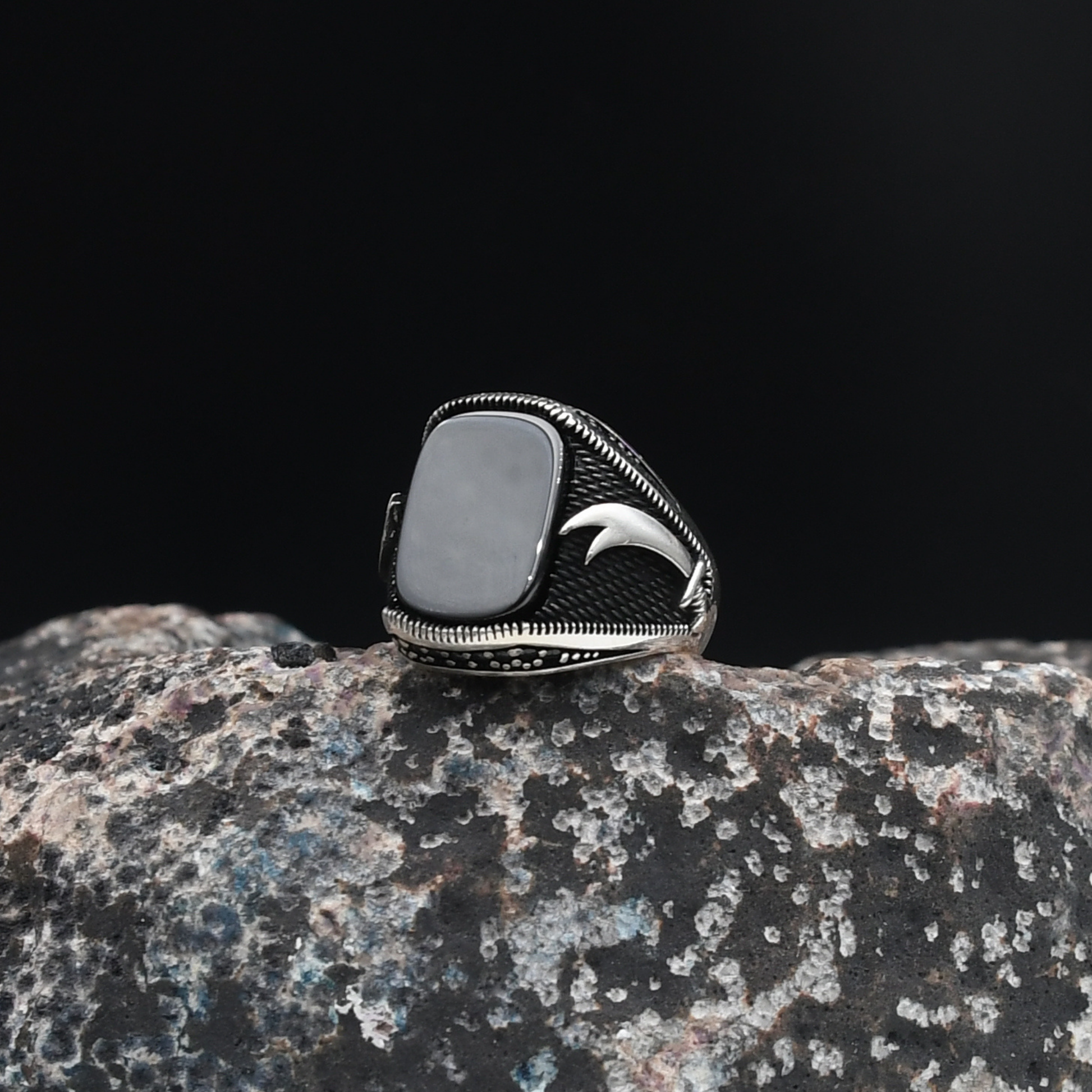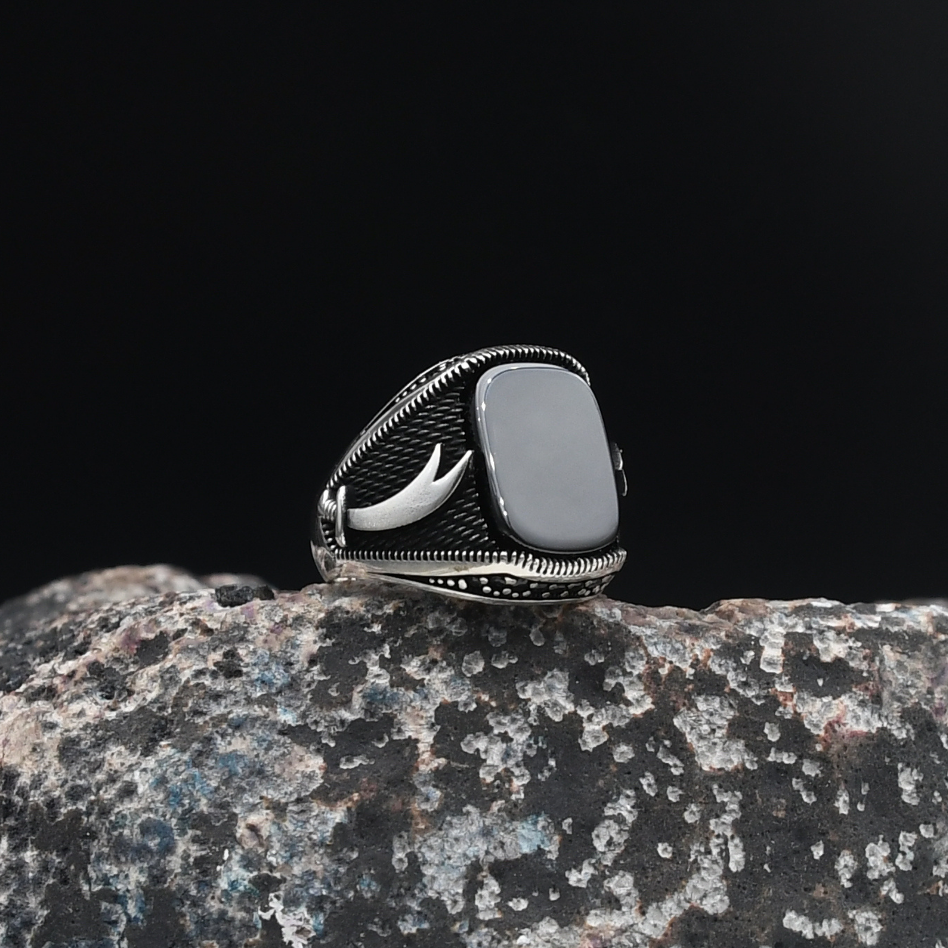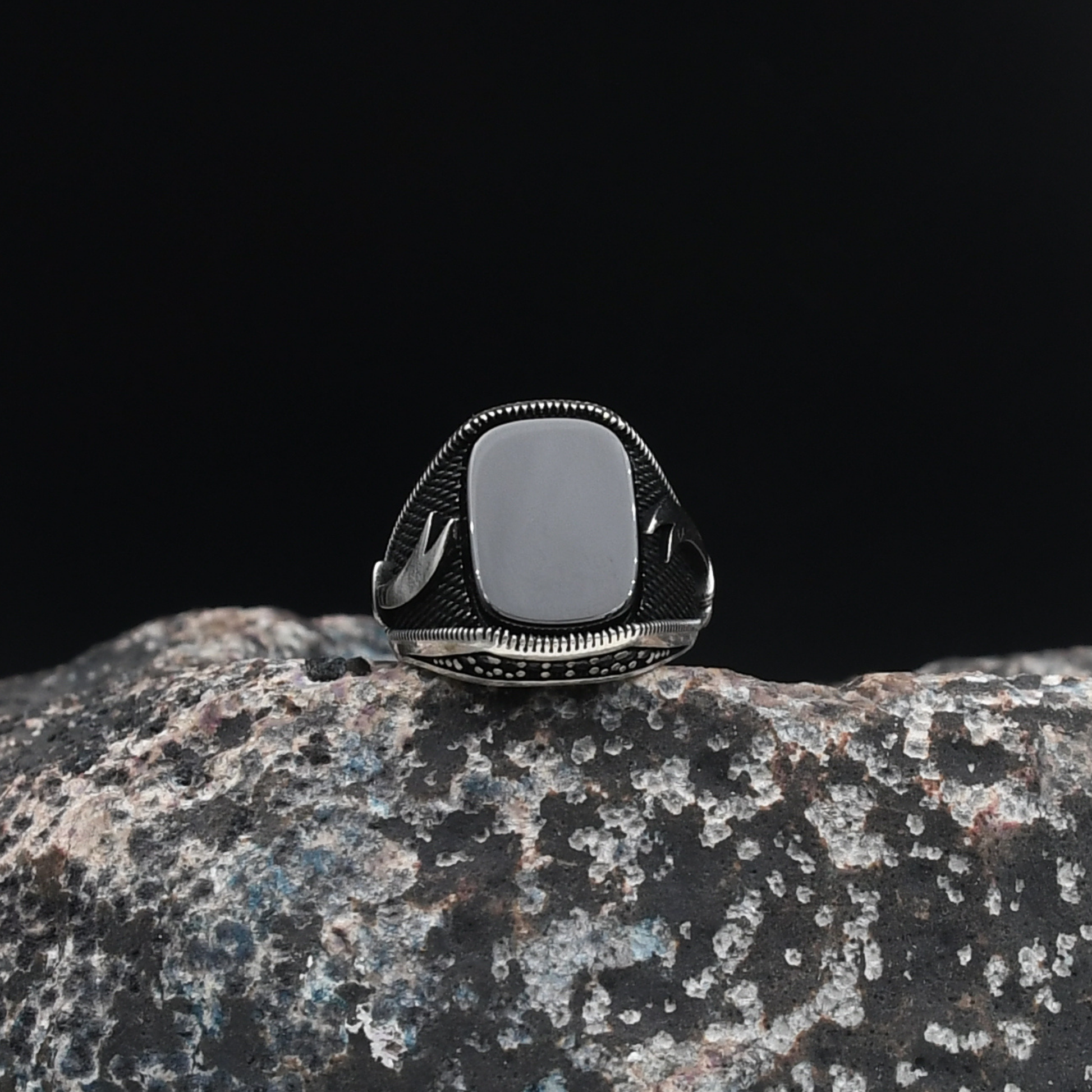 Tarihi ve manevi değeri yüksek Zülfikar kılıcı figürü, bu özel tasarımda siyah oniks taşı ve zirkon taş süslemelerle birleşiyor. Gücün, inancın ve asaletin simgesi olan bu yüzük, %100 925 ayar gümüşten üretilmiş olup ortalama 10 gram ağırlığa sahiptir. Hem şıklığı hem de taşıdığı anlamla ön plana çıkan bu model, güçlü bir stilin temsilcisidir.