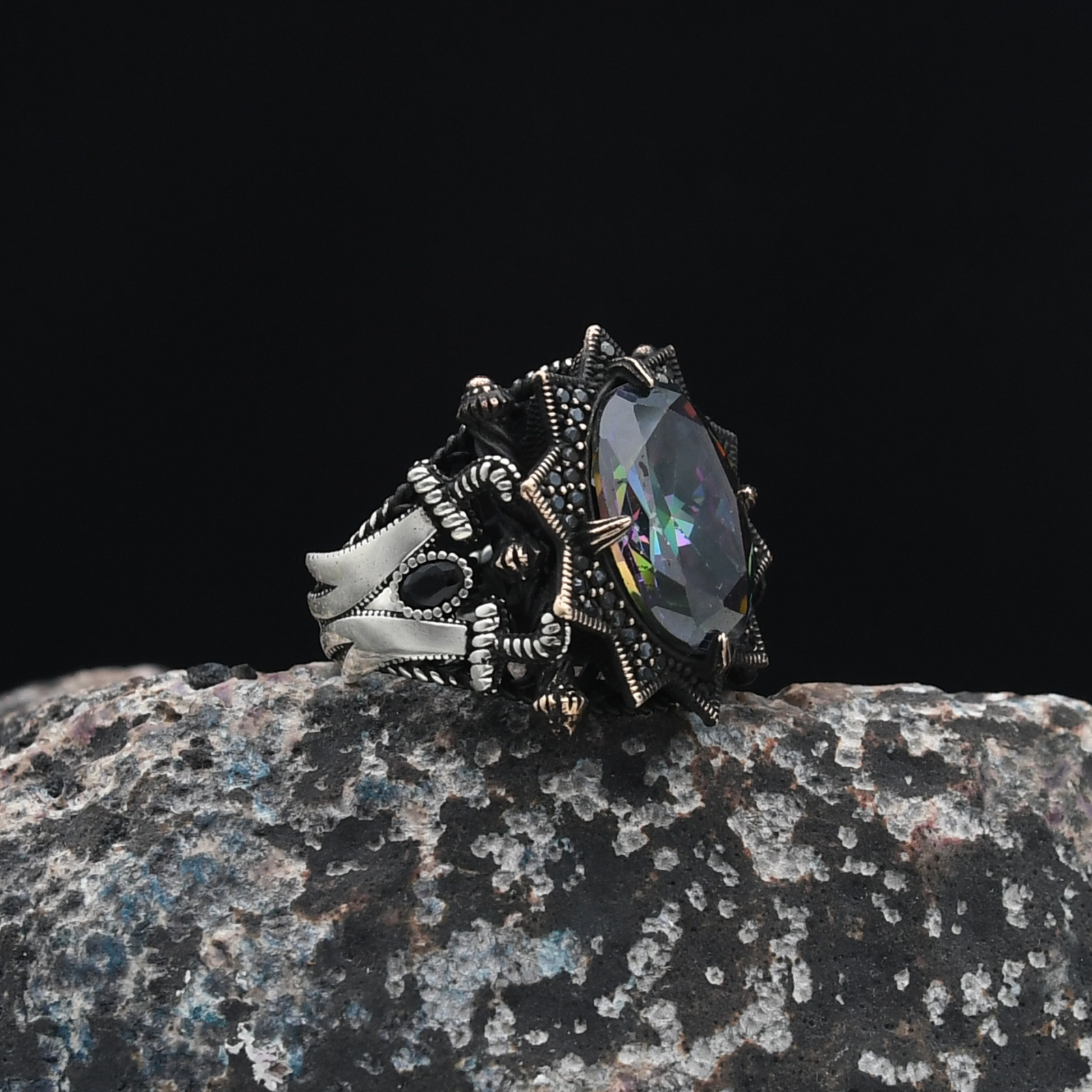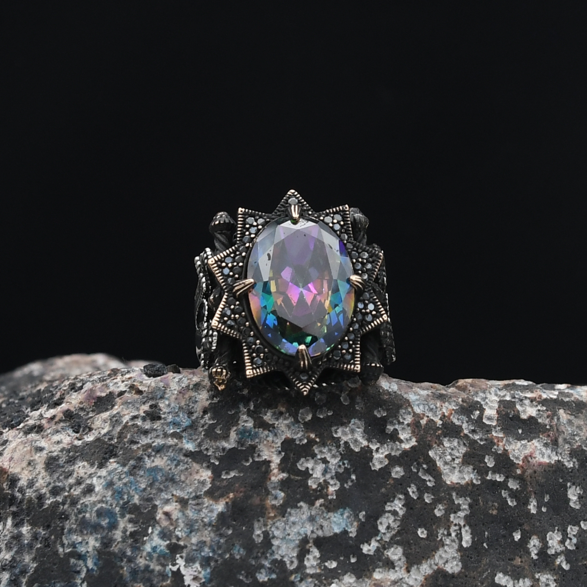 Eşsiz mistik topaz taşı 🌈, bu yüzüğün merkezinde büyüleyici renk geçişleriyle göz kamaştırıyor. Mistik topaz, ışığa göre renk değiştiren özellikleriyle benzersiz bir güzellik sunar, her açıdan farklı bir ışıltı sergileyerek tarzınızı öne çıkarır. Zarif ve etkileyici tasarımı, bu yüzüğü modern ve sofistike aksesuarlar sevenler için mükemmel bir tercih haline getiriyor.